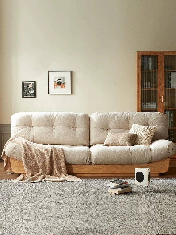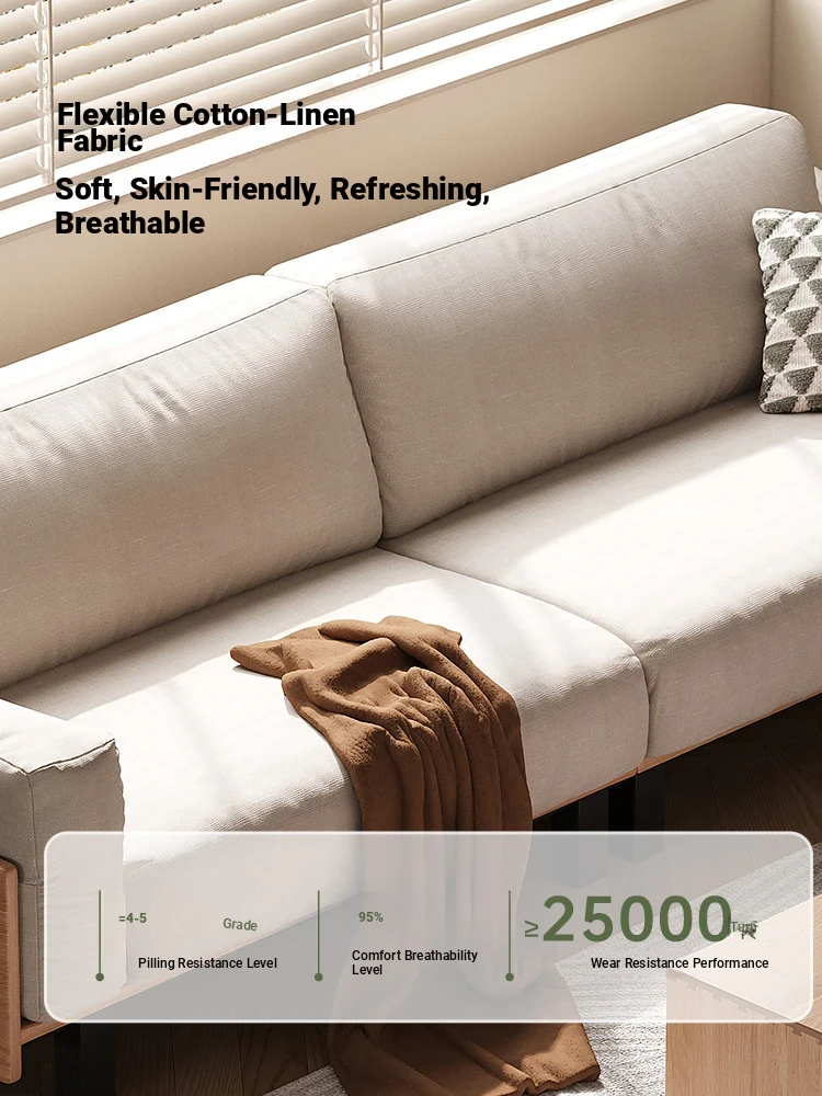 "Nordic Creamy Style Solid Wood Sofa for Small Living Rooms – Oak Fabric Sofa with Down-filled Cloud Cushions, Perfectly Blending Comfort and Aesthetics"