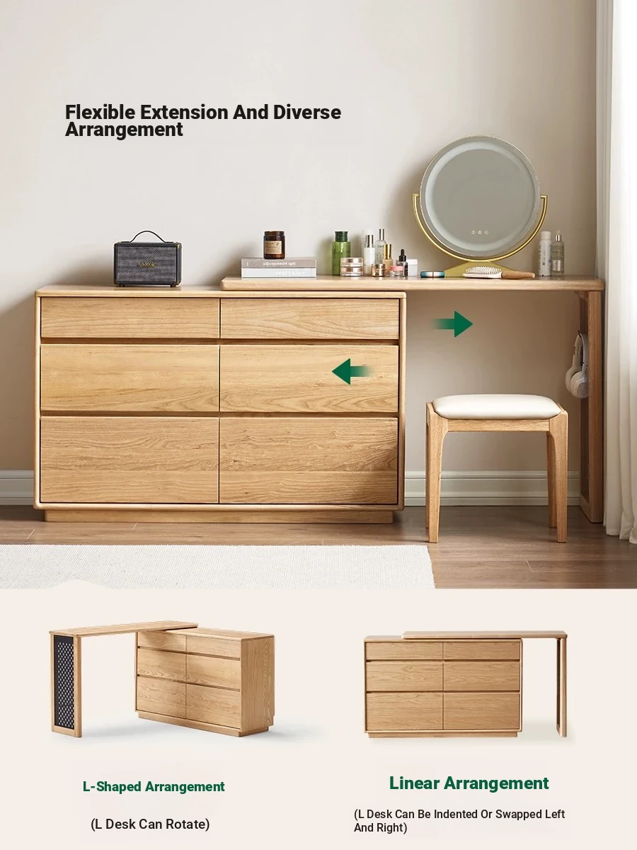 "Elegant All-Wood Dressing Table with Integrated Dresser: Versatile Oak Expandable L-Shaped Corner Vanity Desk for a Chic Makeover Experience"