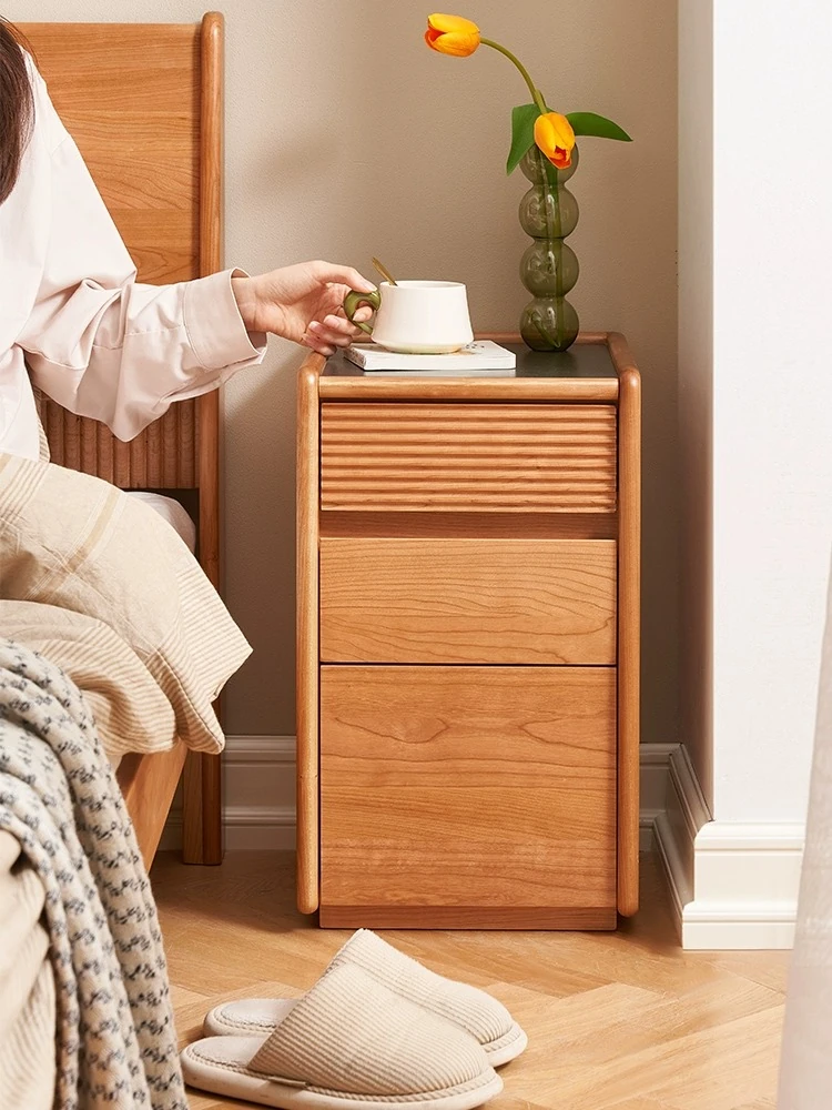 Cherry Wood Vintage Narrow Bedside Table with Rock Plate Drawer – Solid Wood Nightstand for Bedroom Storage and Organization