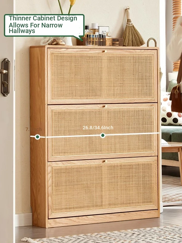 Slim Solid Wood Shoe Cabinet for Home Entryway – Narrow Wall-Mounted Design, Natural Oak, Rattan Accents, Ultra-Slim Profile for Small Spaces, Perfect for Organizing Your Shoes!