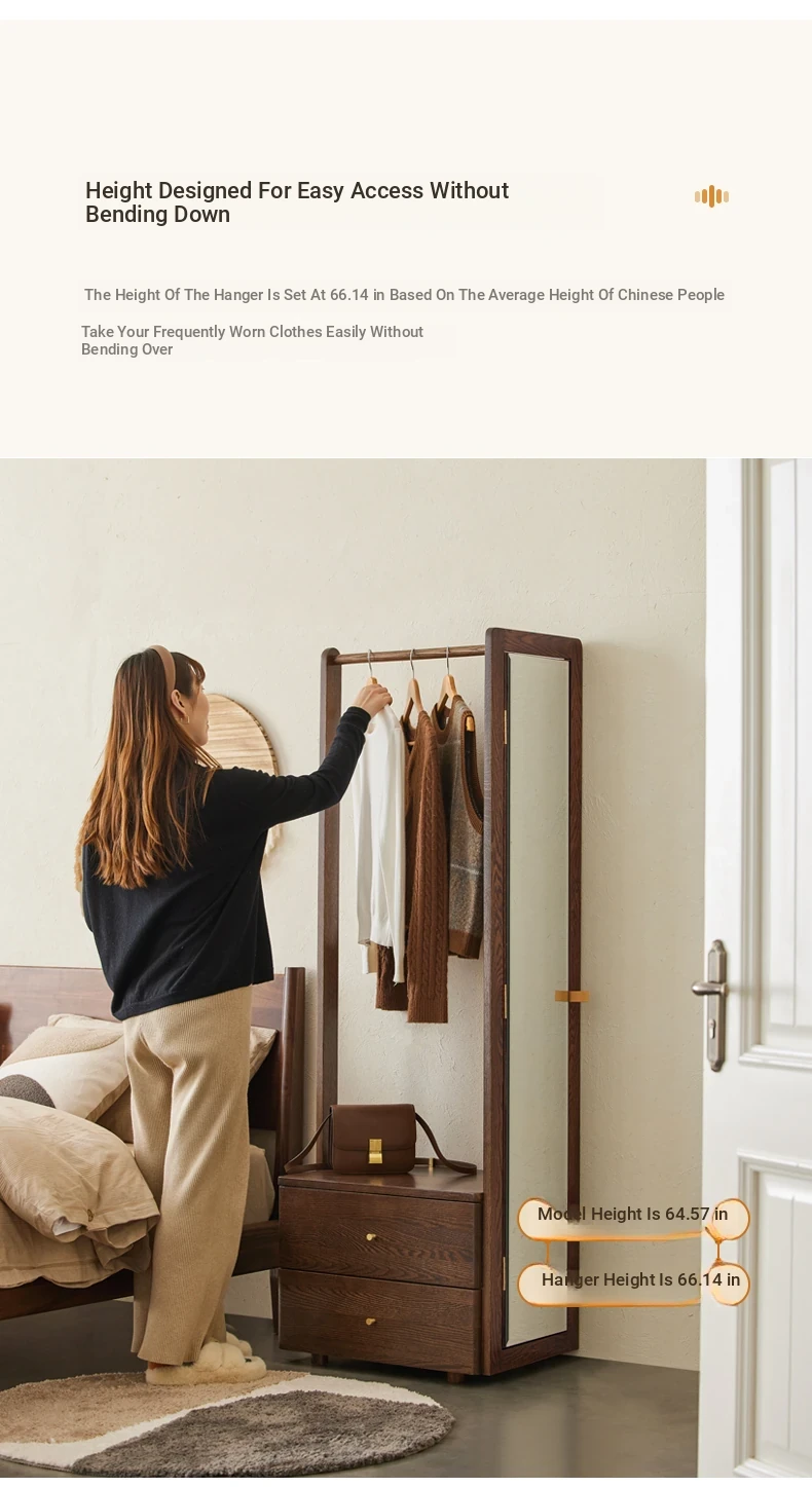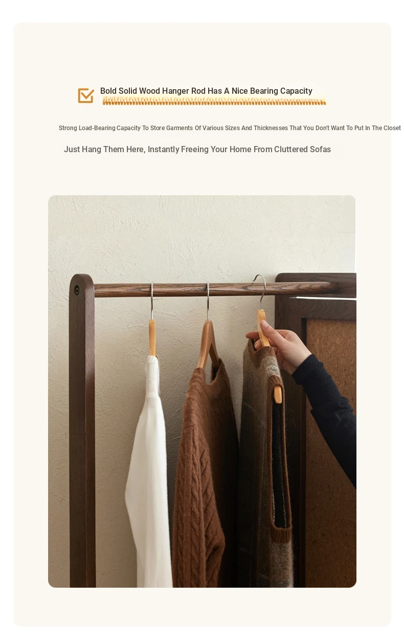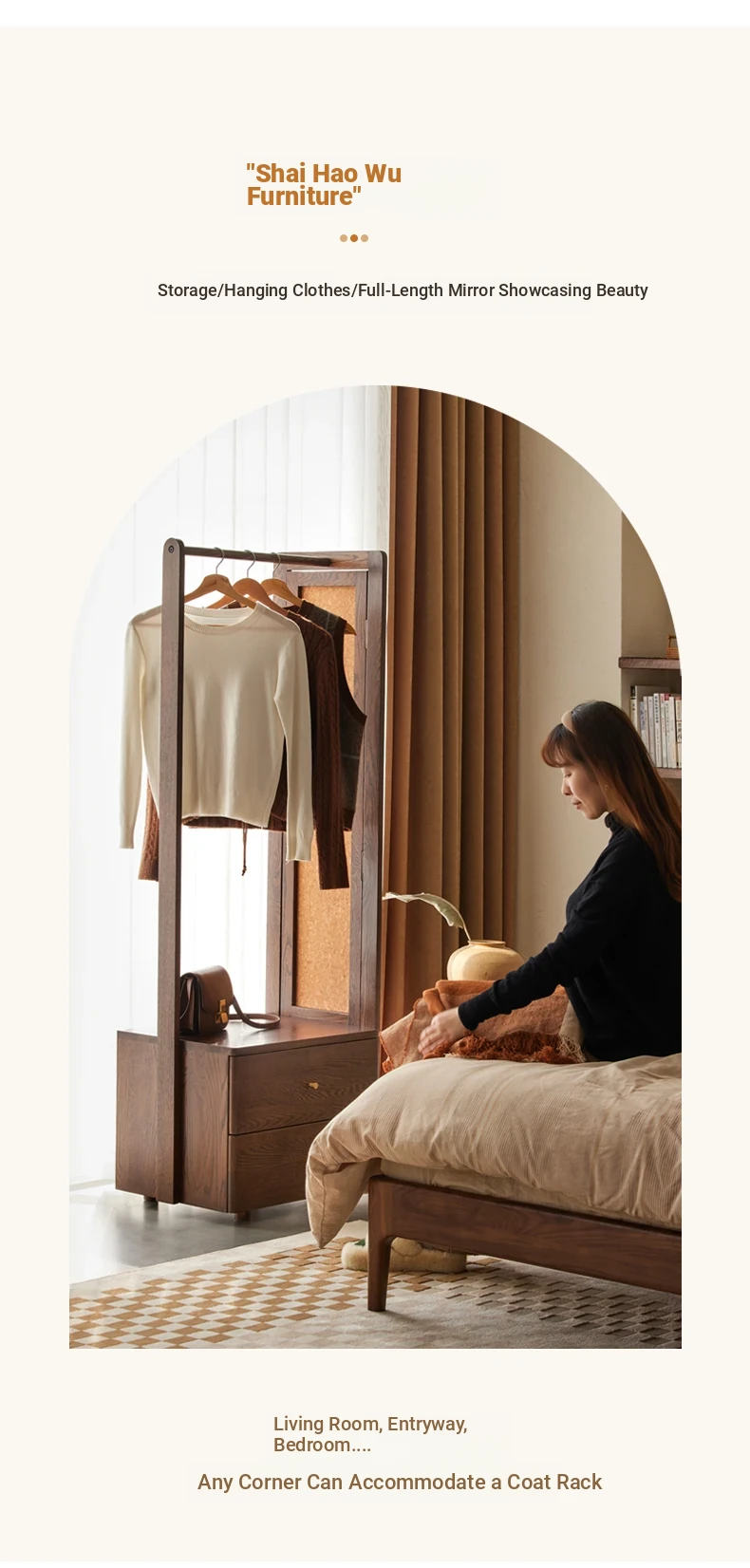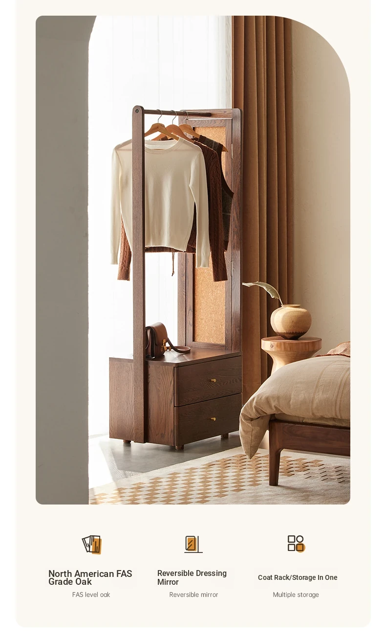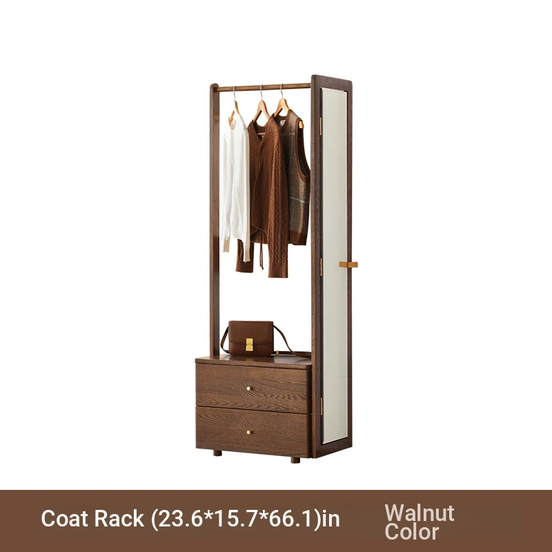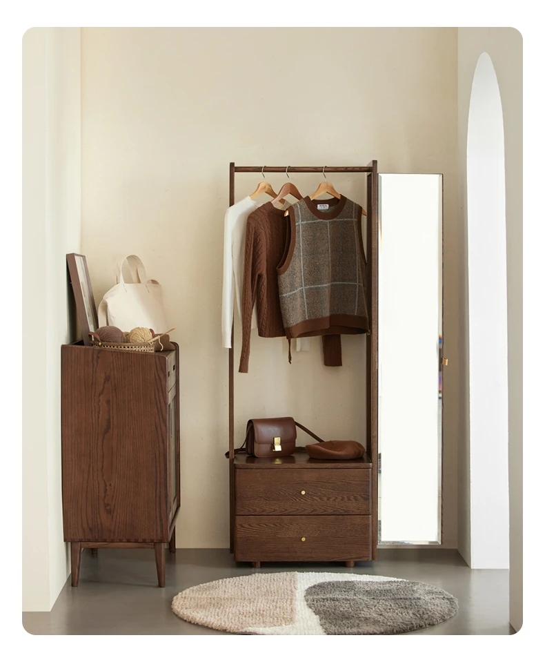 "Modern Minimalist Solid Wood Coat Rack with Dressing Mirror and Shoe Bench – Perfect for Small Bedrooms"