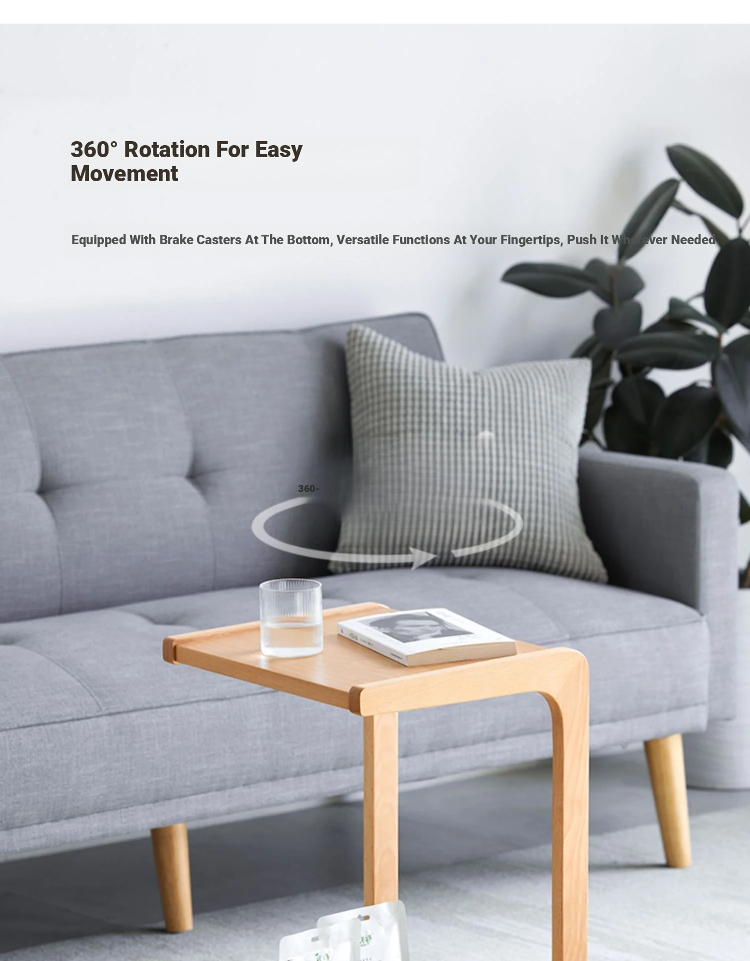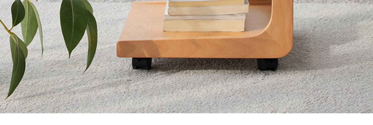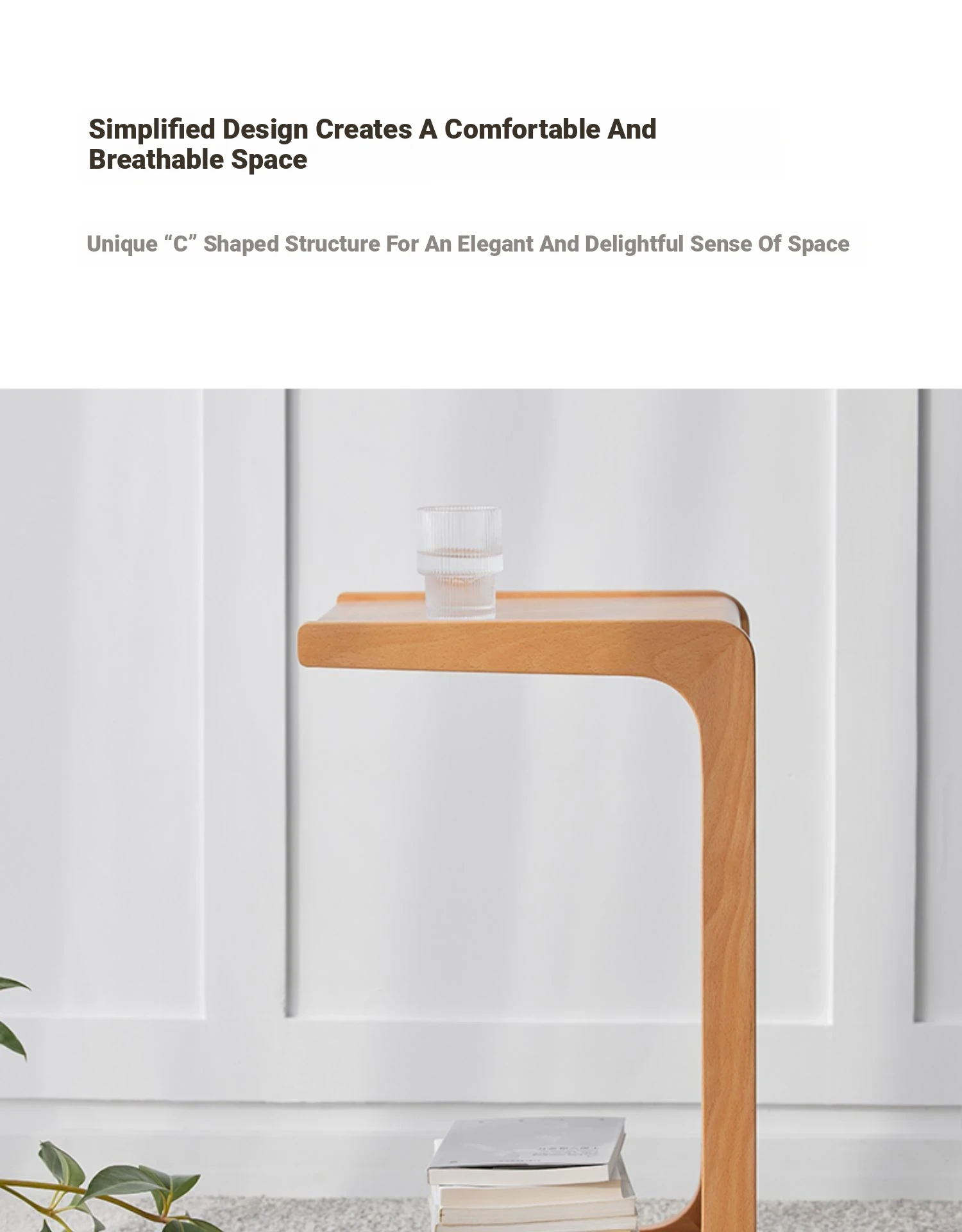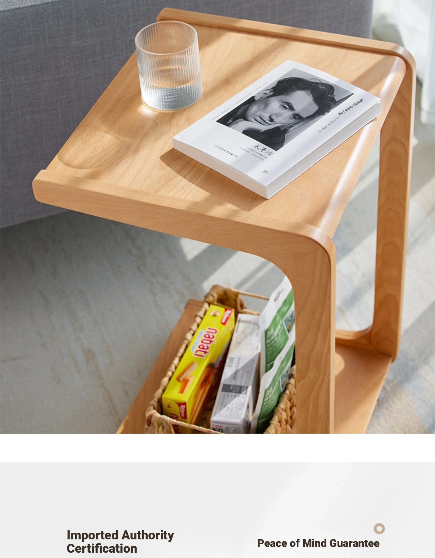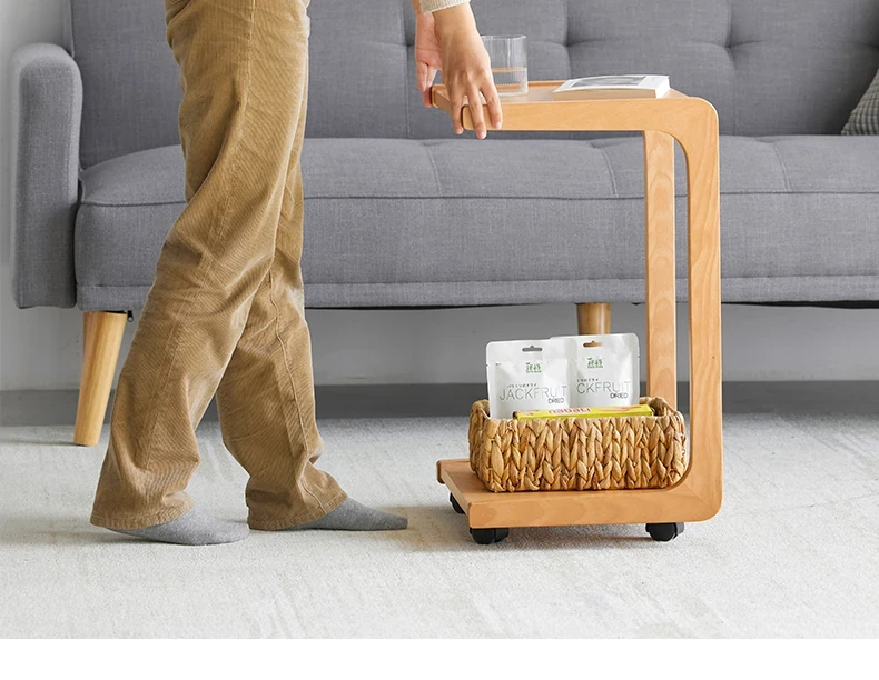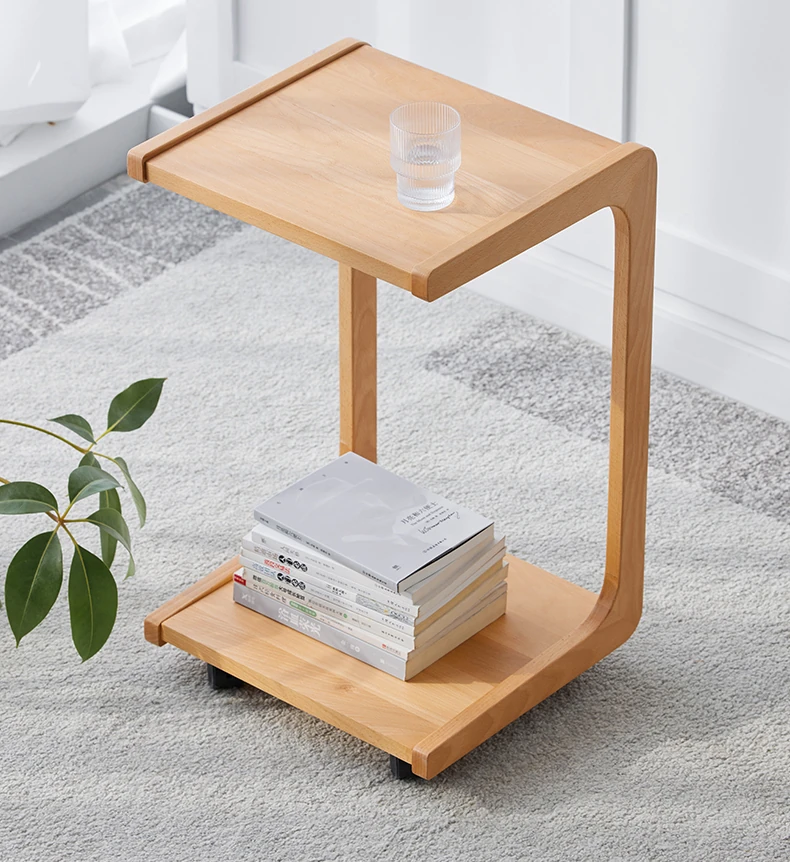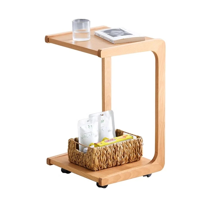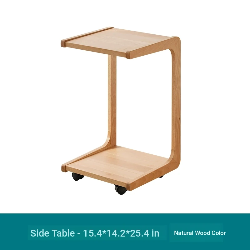 Natural Solid Wood Side Table - Nordic Minimalist C-Shaped Coffee Table on Wheels, Beech Wood, Movable Bedside Table for Sofa and Corner Use