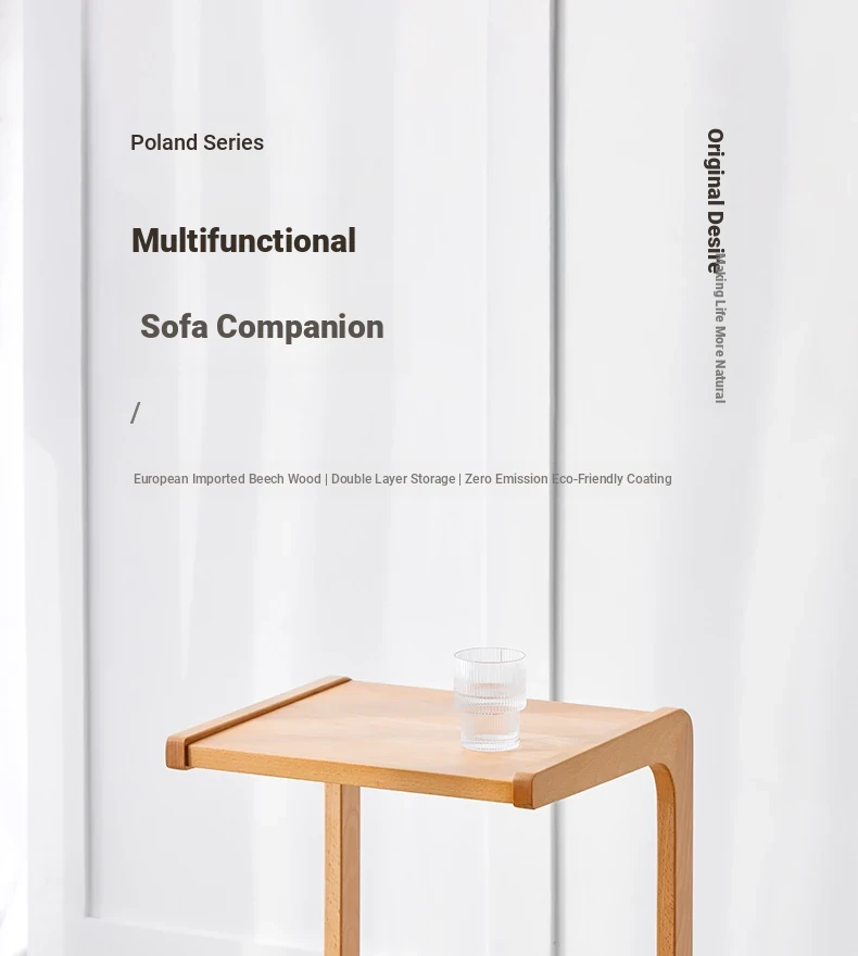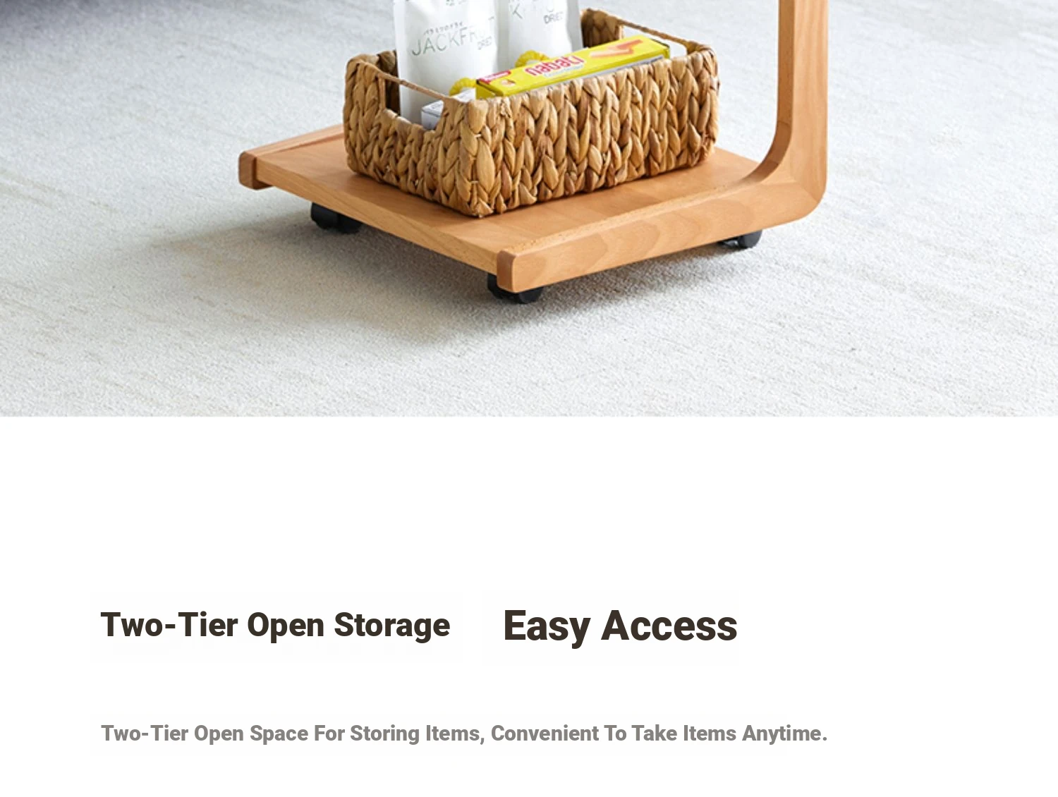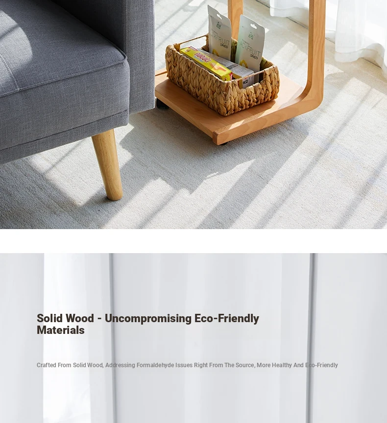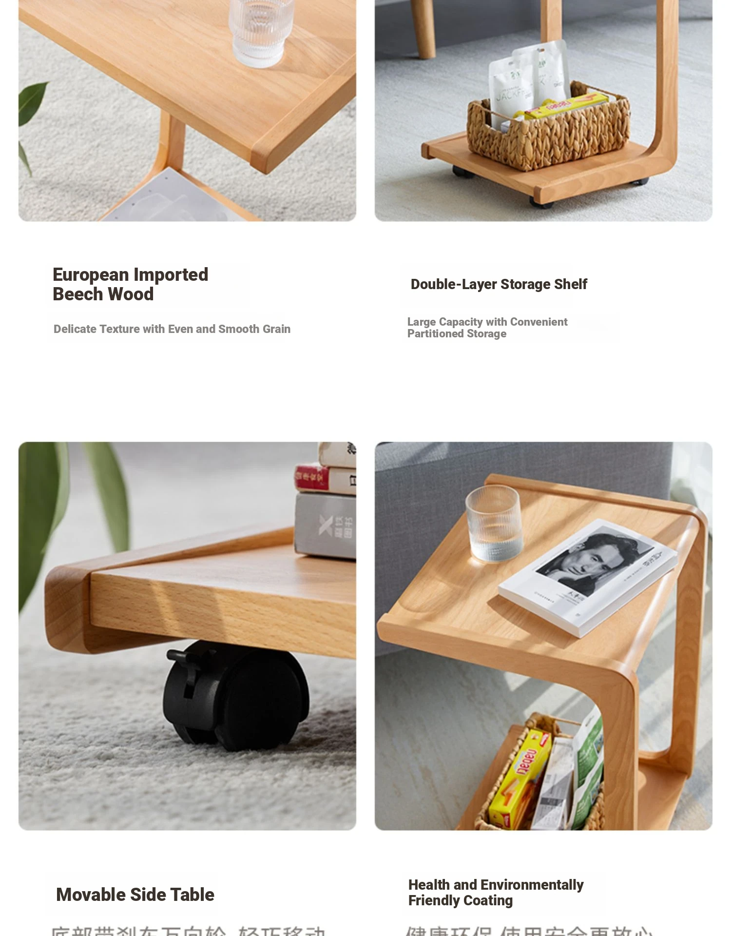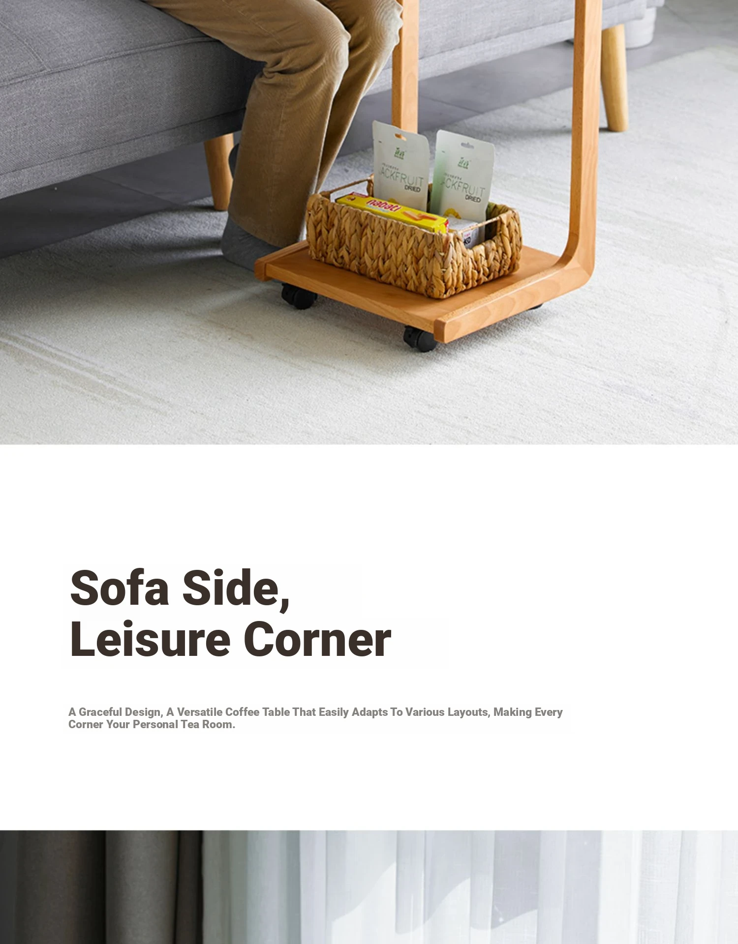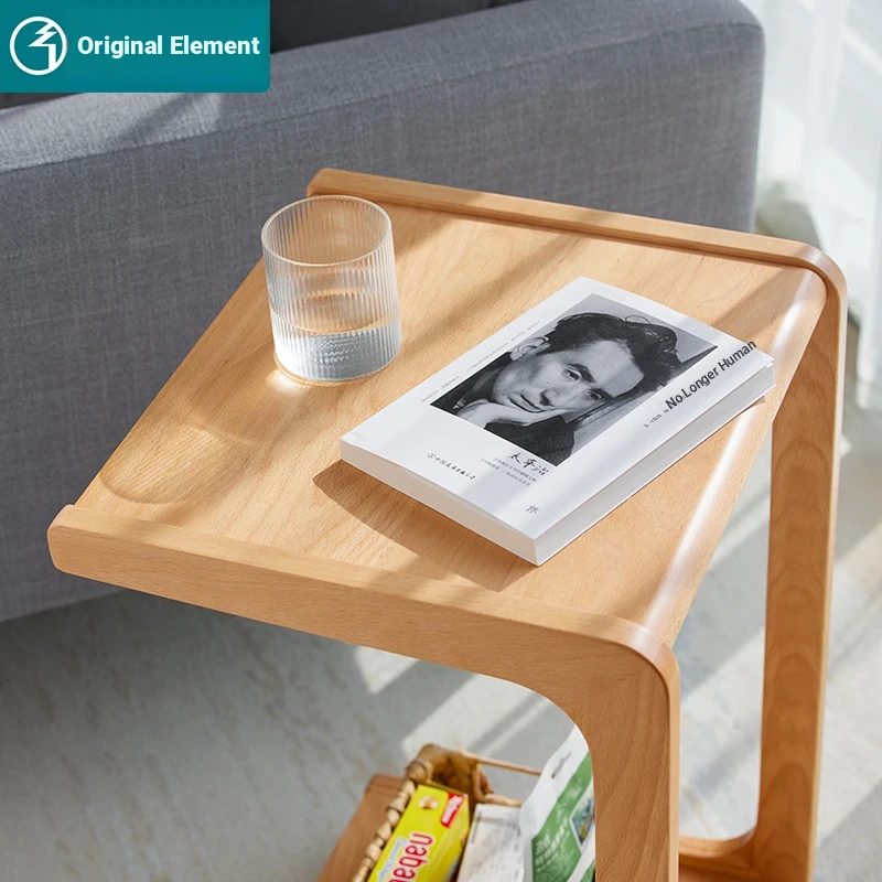 Natural Solid Wood Side Table - Nordic Minimalist C-Shaped Coffee Table on Wheels, Beech Wood, Movable Bedside Table for Sofa and Corner Use