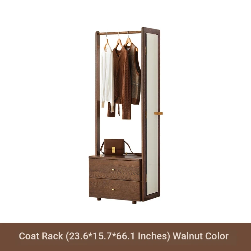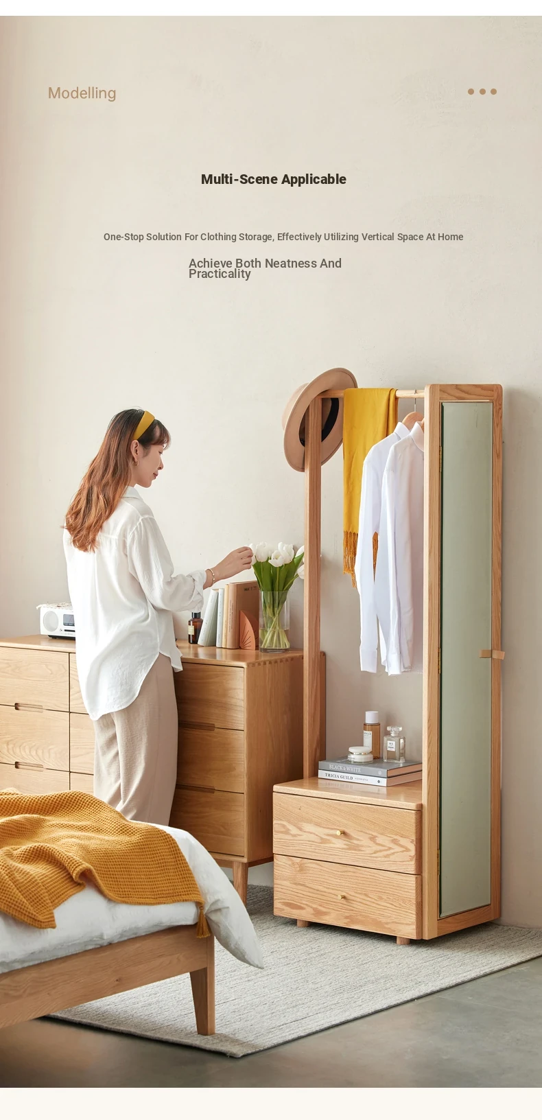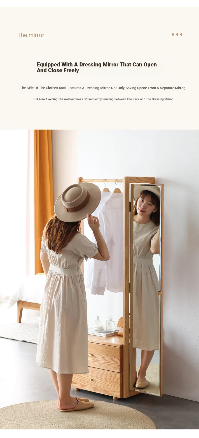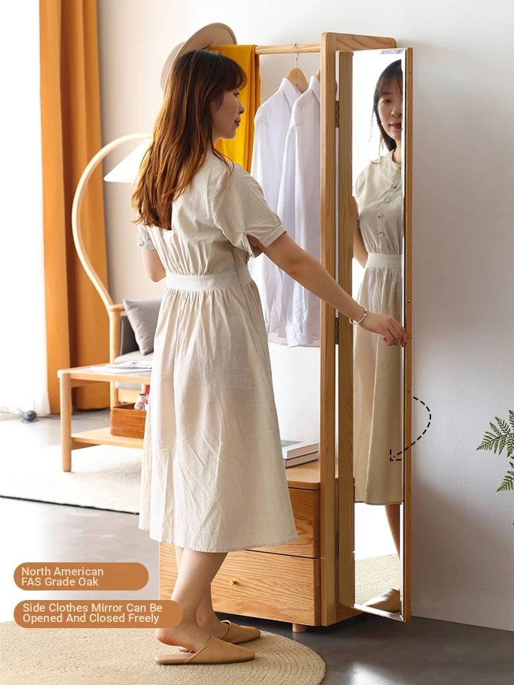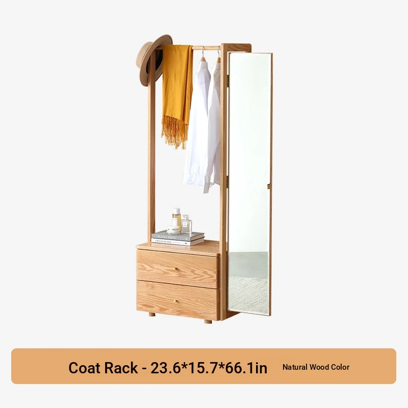 "Nordic Minimalist Solid Wood Coat Rack with Dressing Mirror - Compact Freestanding Clothes Hanger for Bedroom Use"