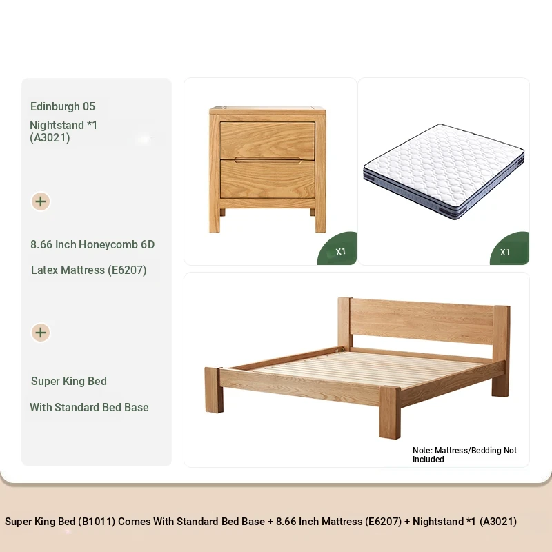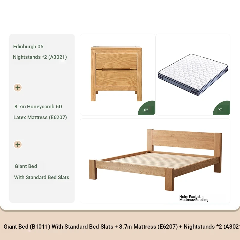Log Color-Big Mac Bed (with Ordinary Plank) + Bedside Table * 2(A3021)+8.66in Honeycomb 6D Latex Mattress (E6207)