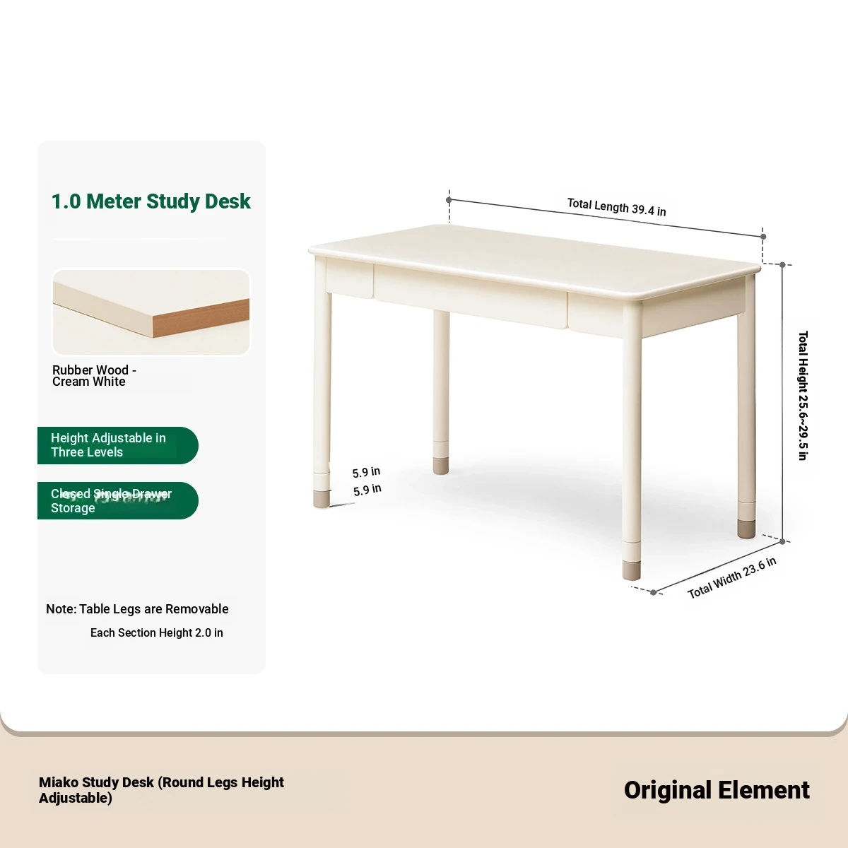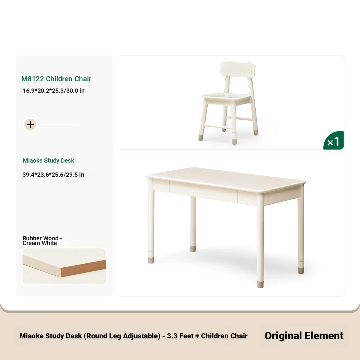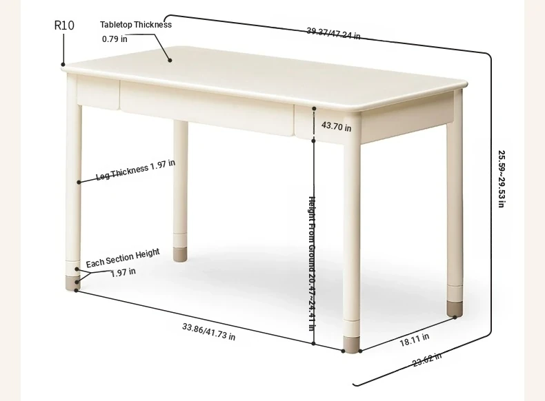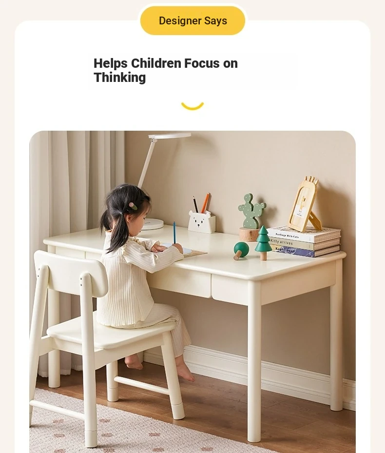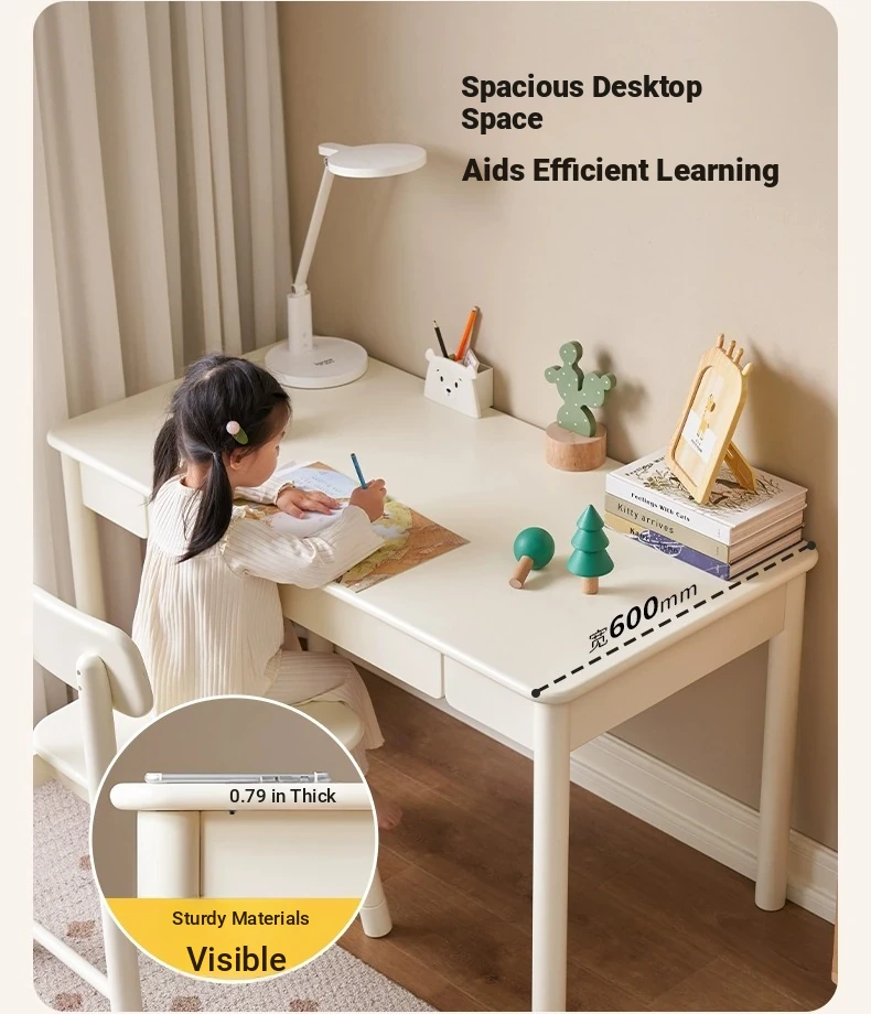 Original Element Solid Wood Height Adjustable Study Desk - Cream White Children's Writing Table for Home Use - Perfect for Students and Home Office