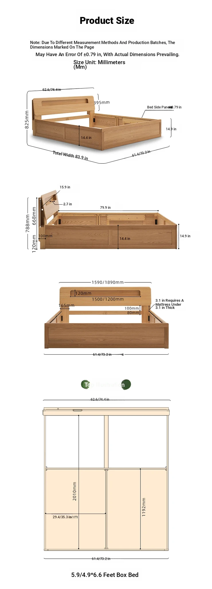 Log Color-Luminous High Box Bed (D8019)+3.15in Original Mengquan Brown Mattress (E6201)+ Fuji Bedside Table (B3023)* 2