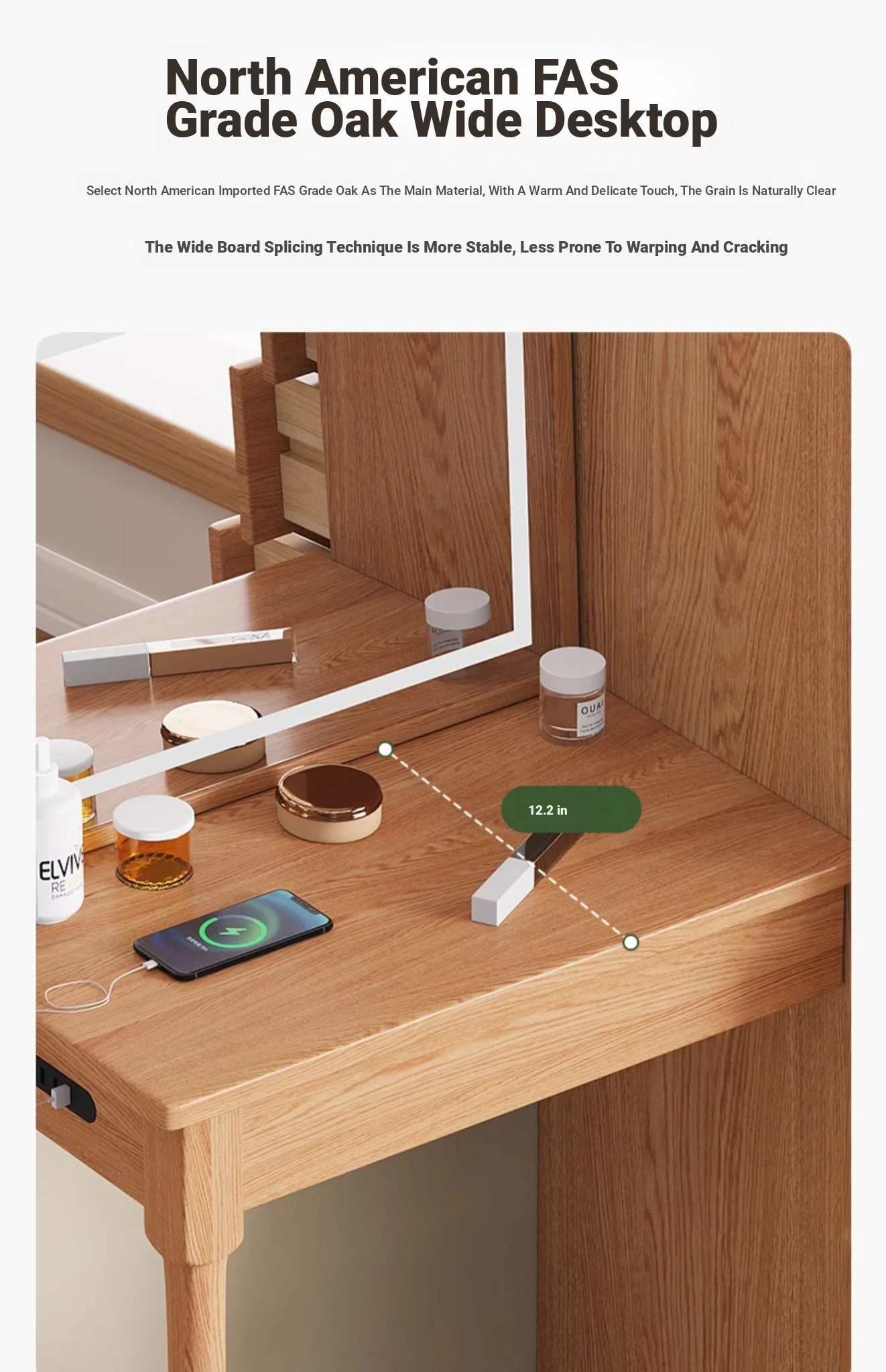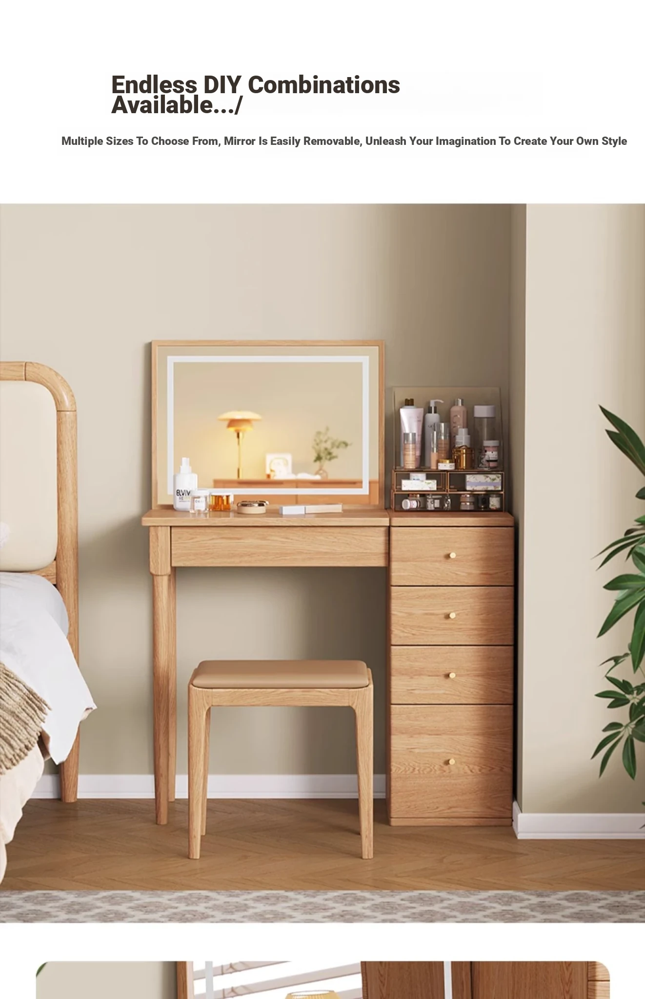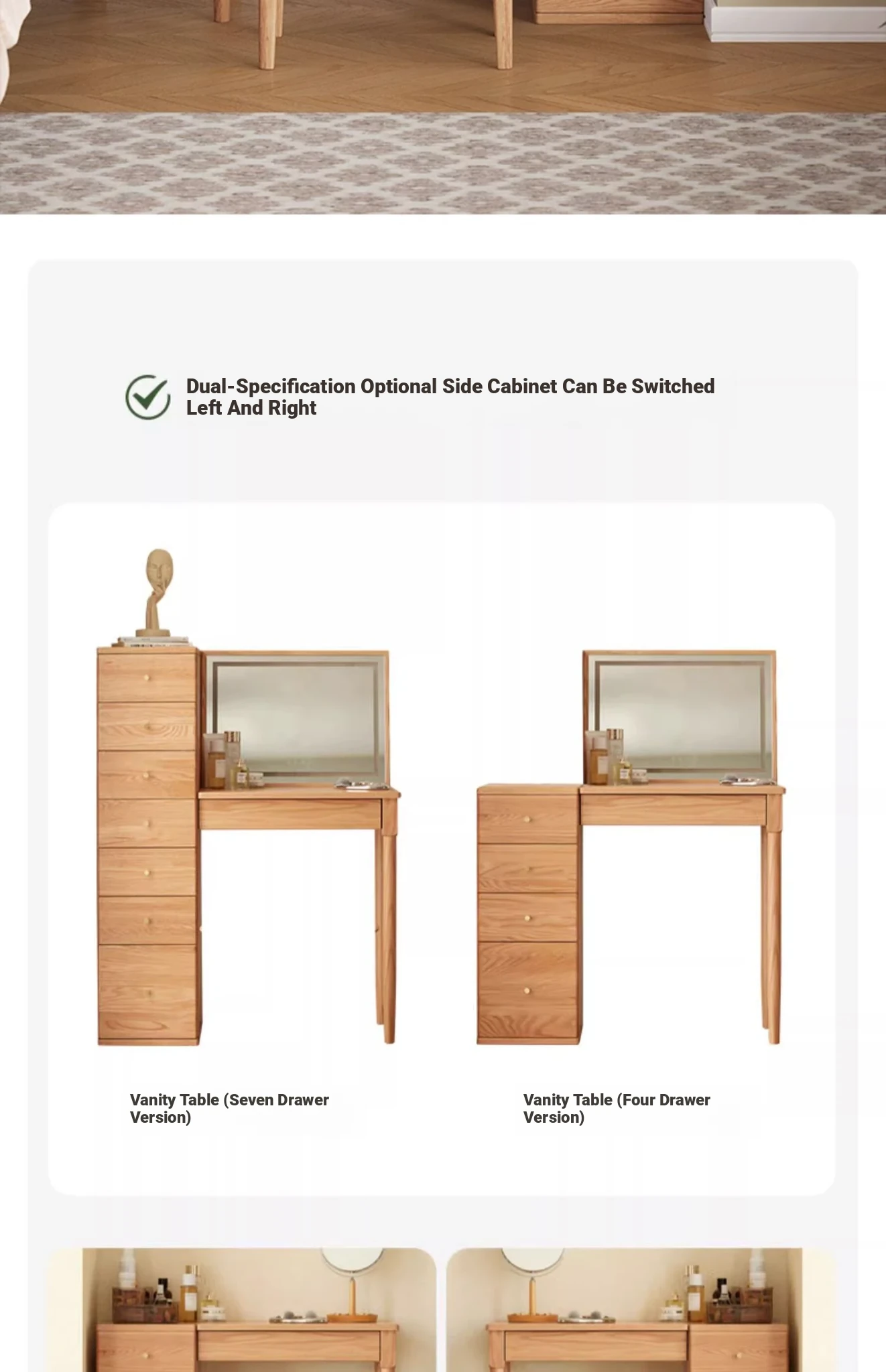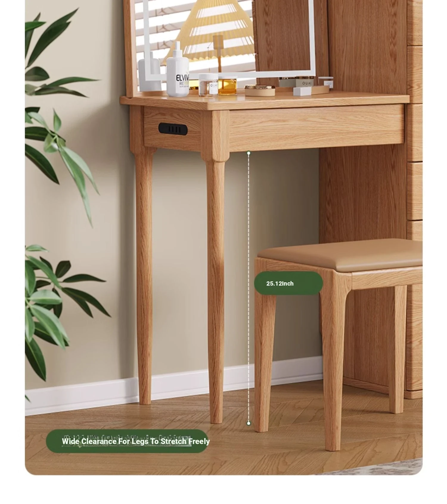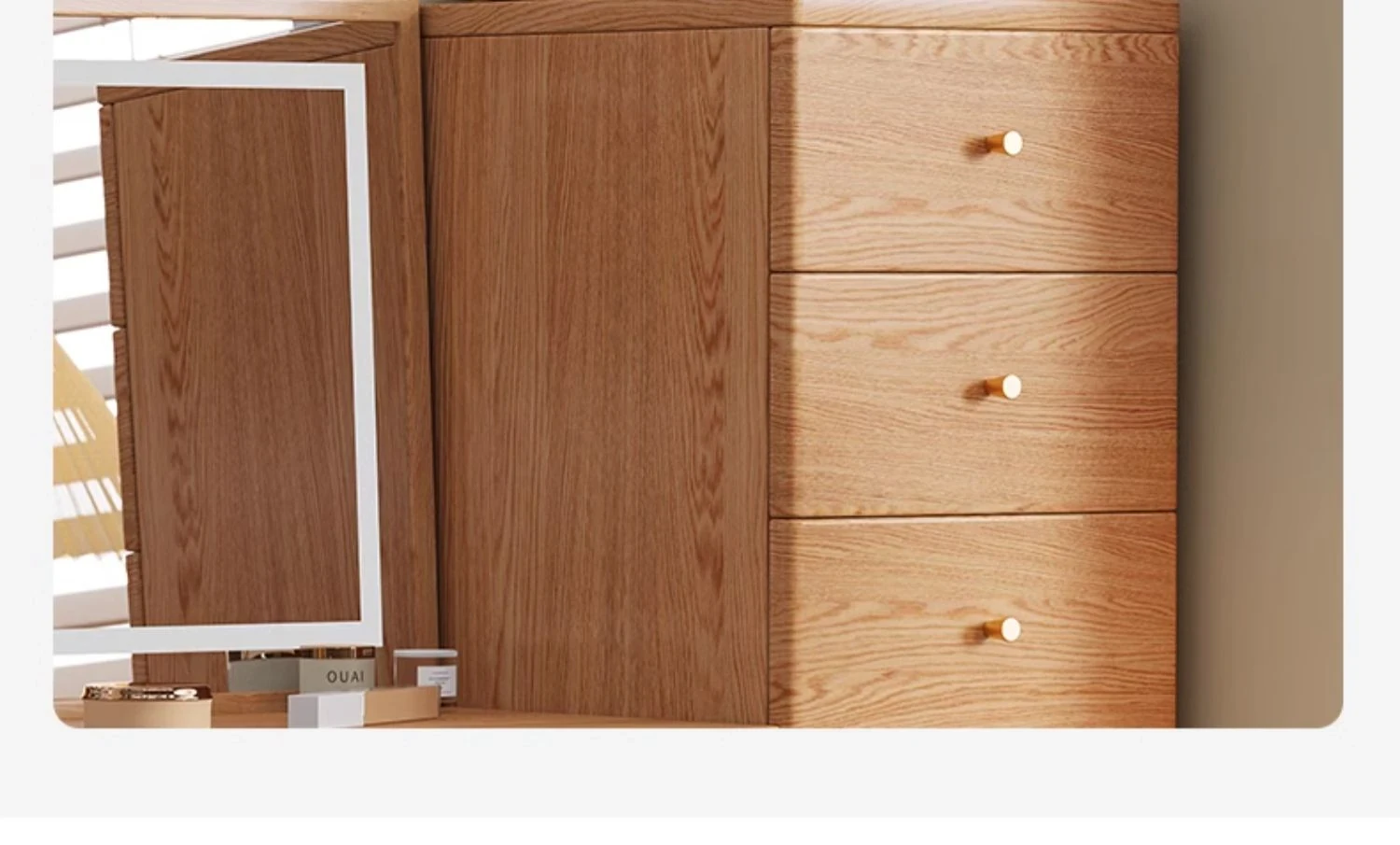 "Original Essence Solid Wood Vanity Table – Modern Minimalist Design for Small Bedrooms, Featuring an All-in-One Makeup Desk with Mirror and Drawer Storage"