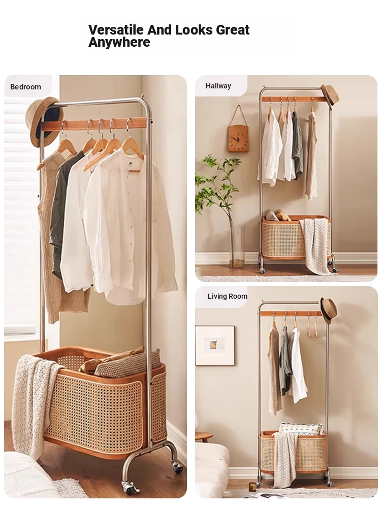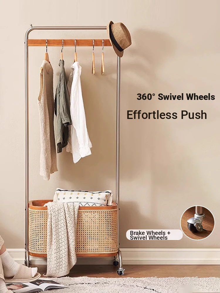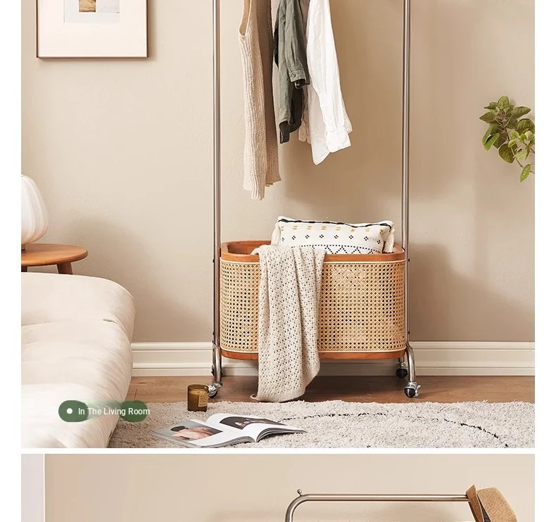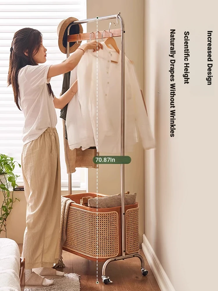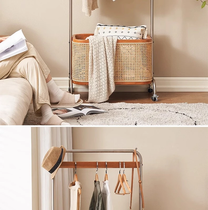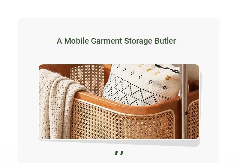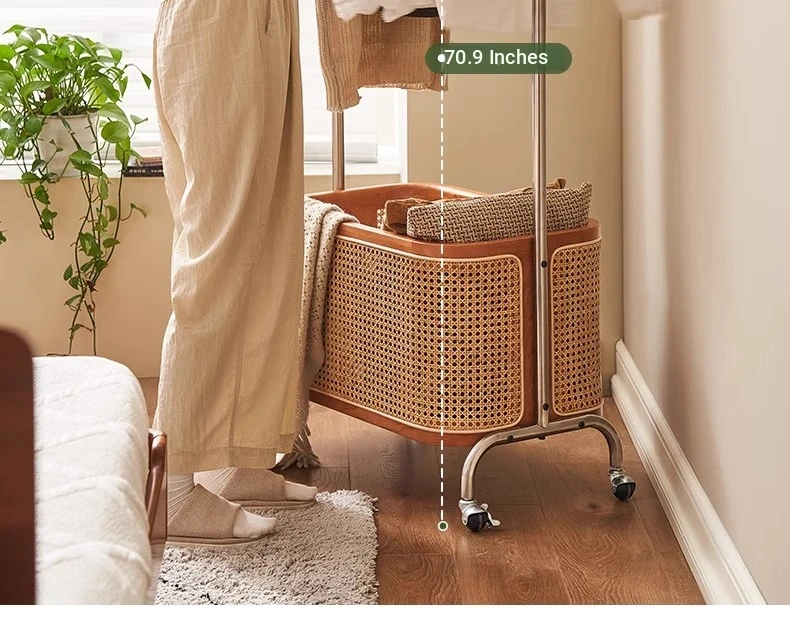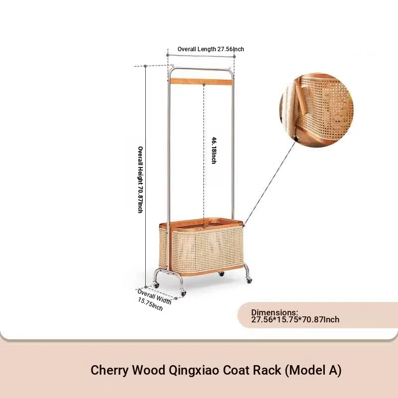 Scandinavian Solid Wood Cherry Coat Rack with Rattan Woven Hangers – Stylish & Functional Bedroom Storage Solution – Portable Home Clothes Drying Rack