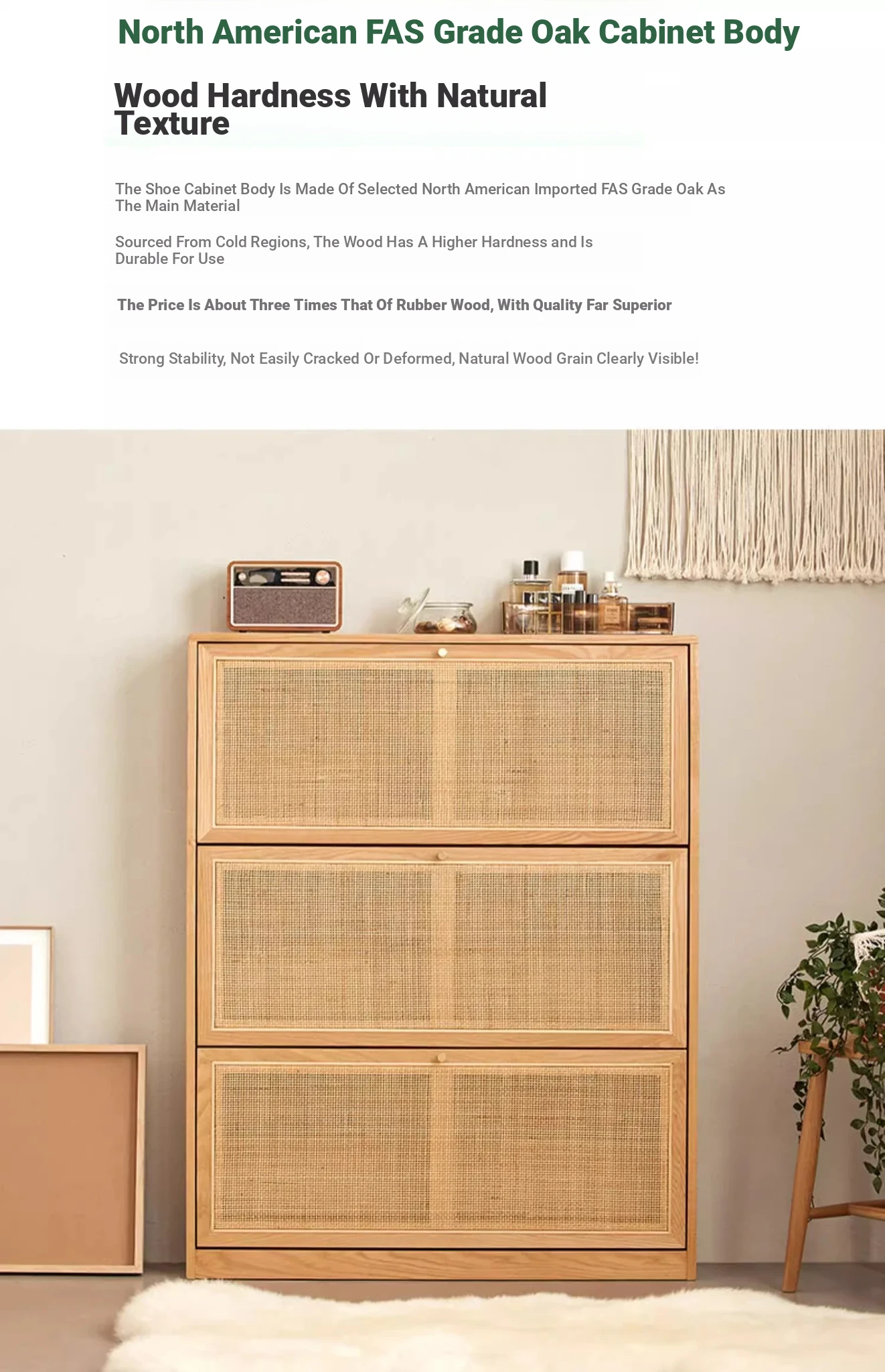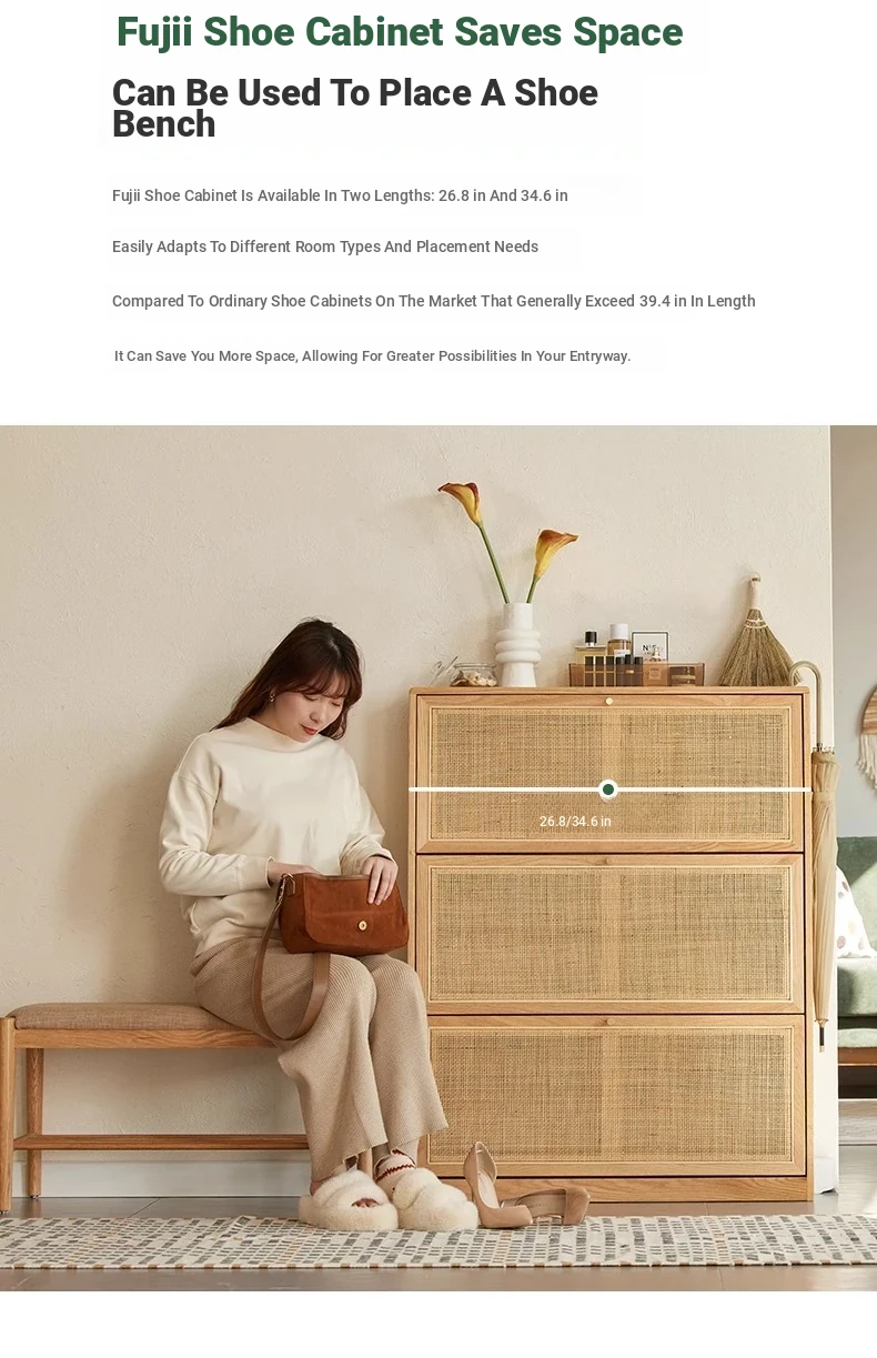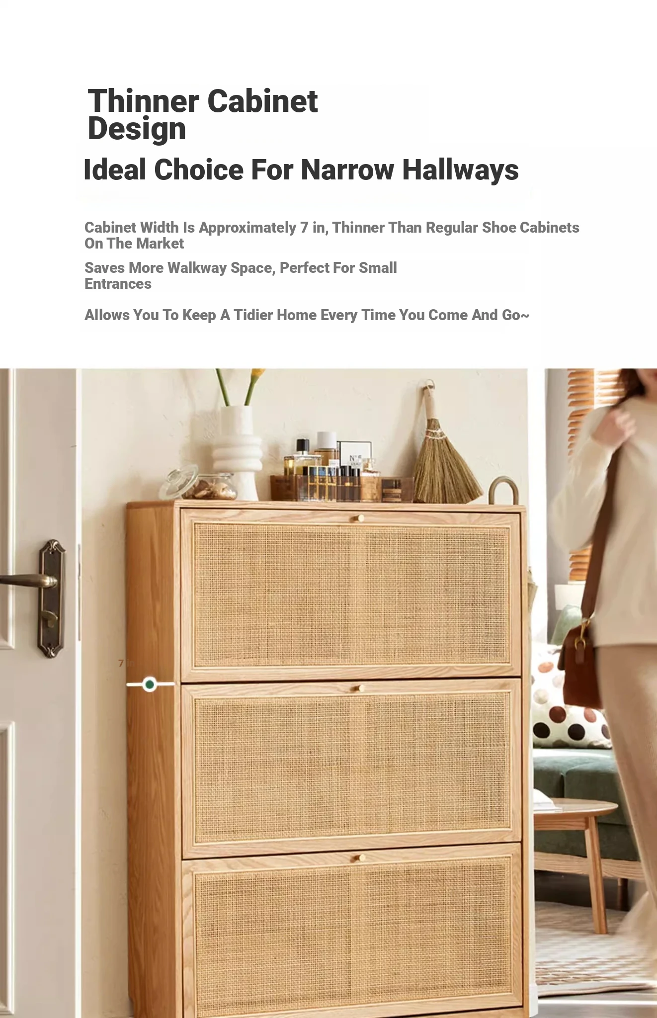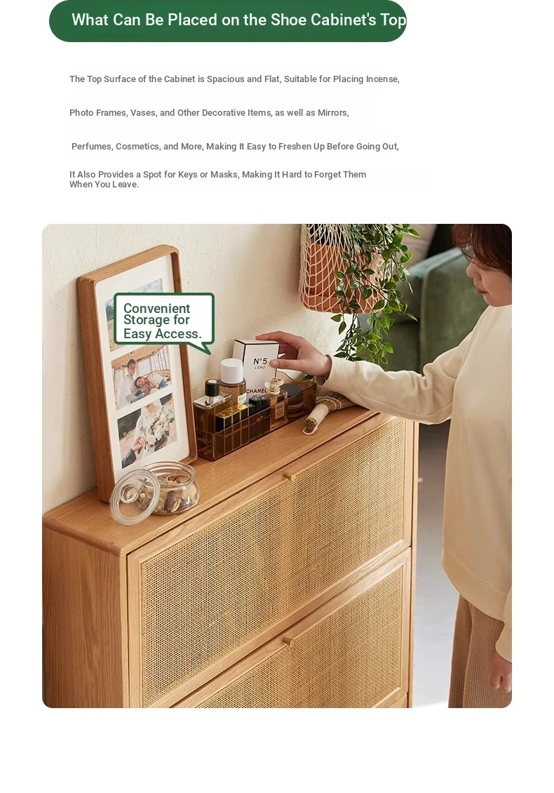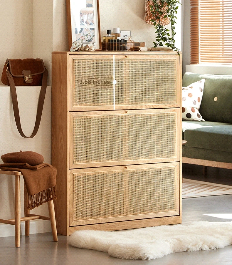 Slim Solid Wood Shoe Cabinet for Home Entryway – Narrow Wall-Mounted Design, Natural Oak, Rattan Accents, Ultra-Slim Profile for Small Spaces, Perfect for Organizing Your Shoes!