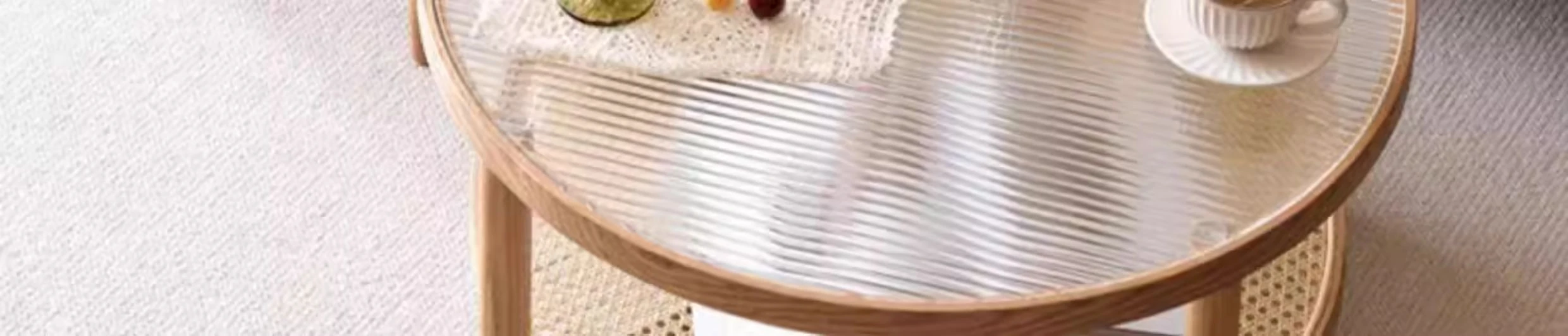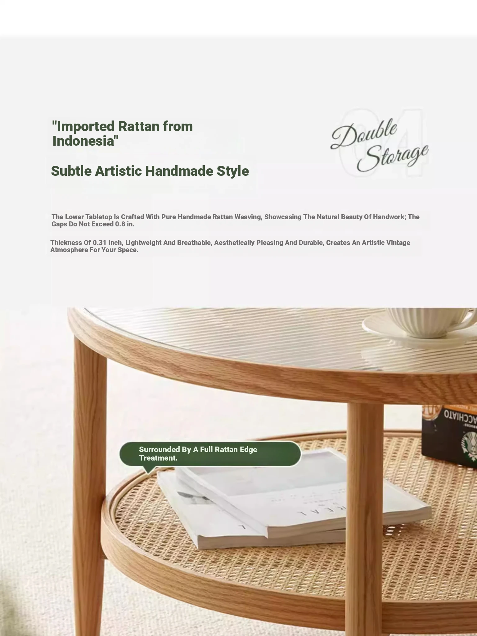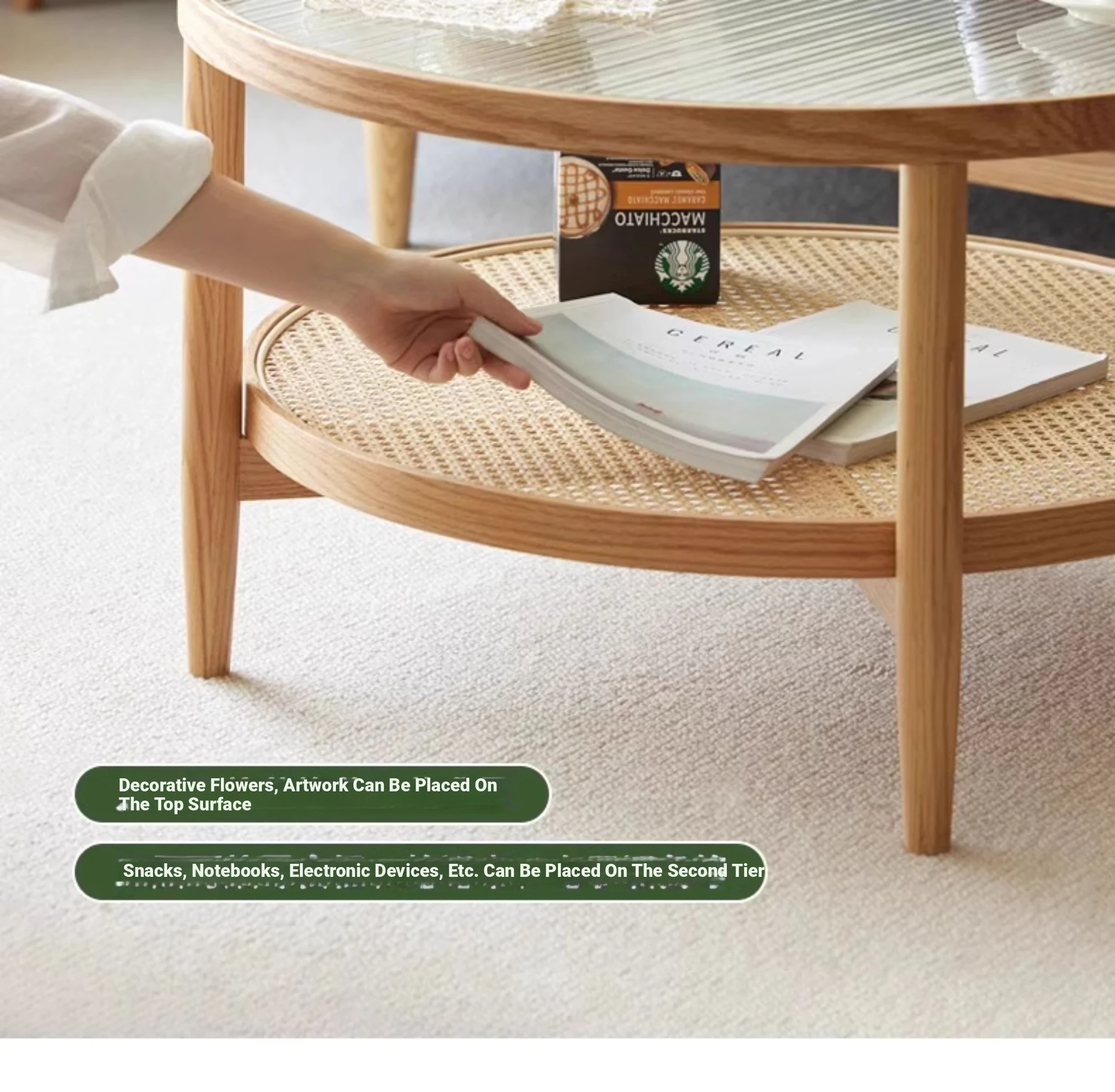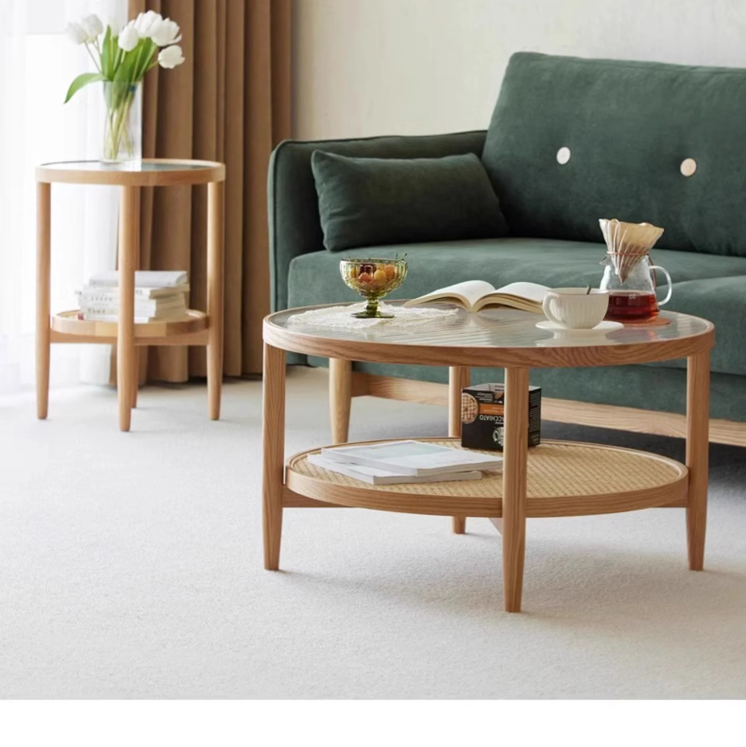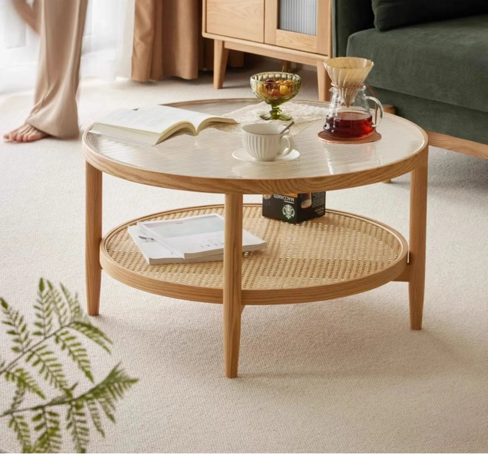 Stylish Round Coffee Table for Living Room - Modern Minimalist Design with Natural Solid Wood, Rattan Accents, and Double-layer Glass Top - Perfect for Home Decor and Entertaining