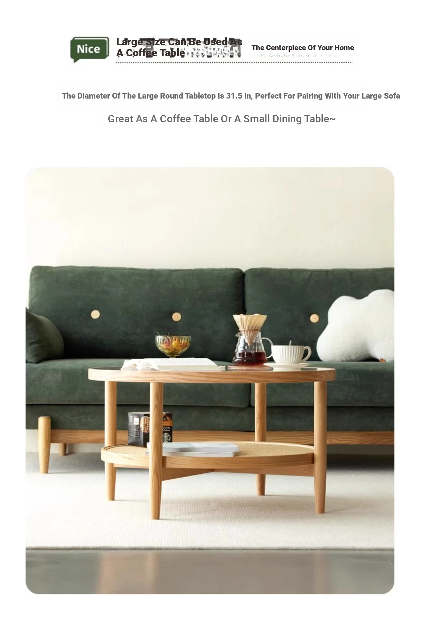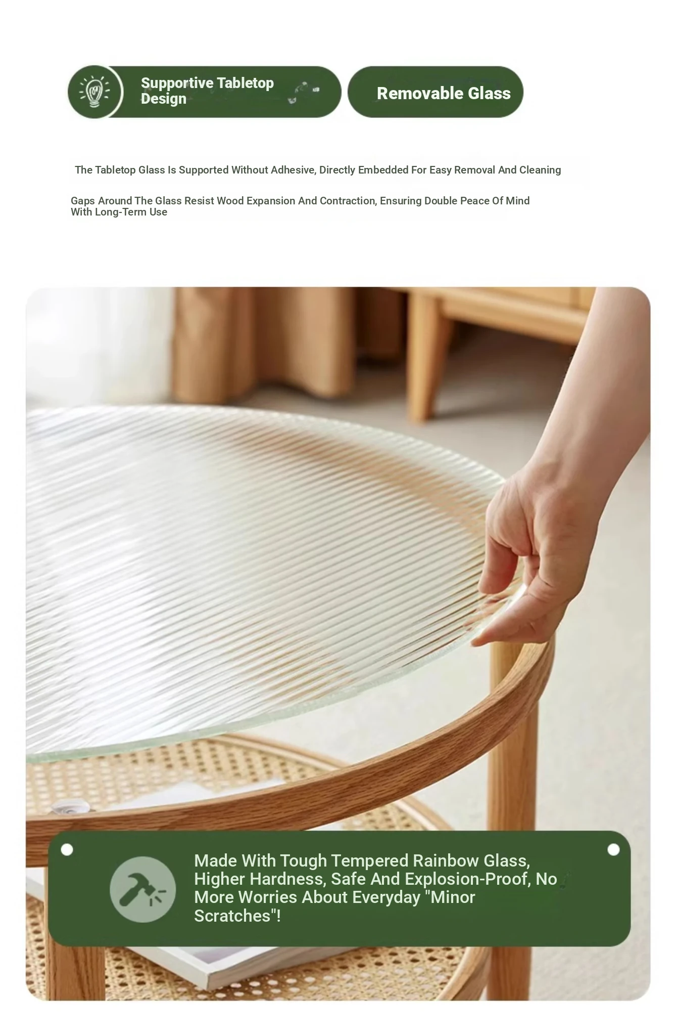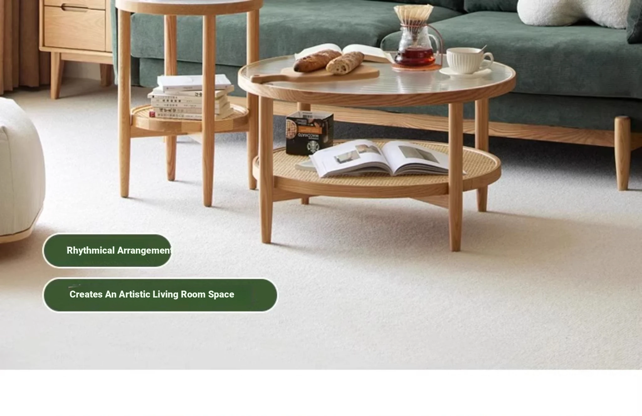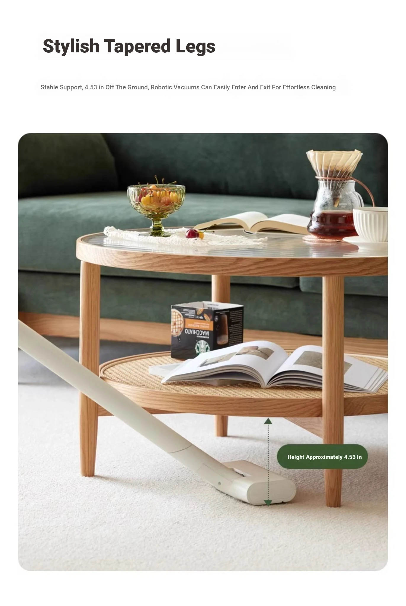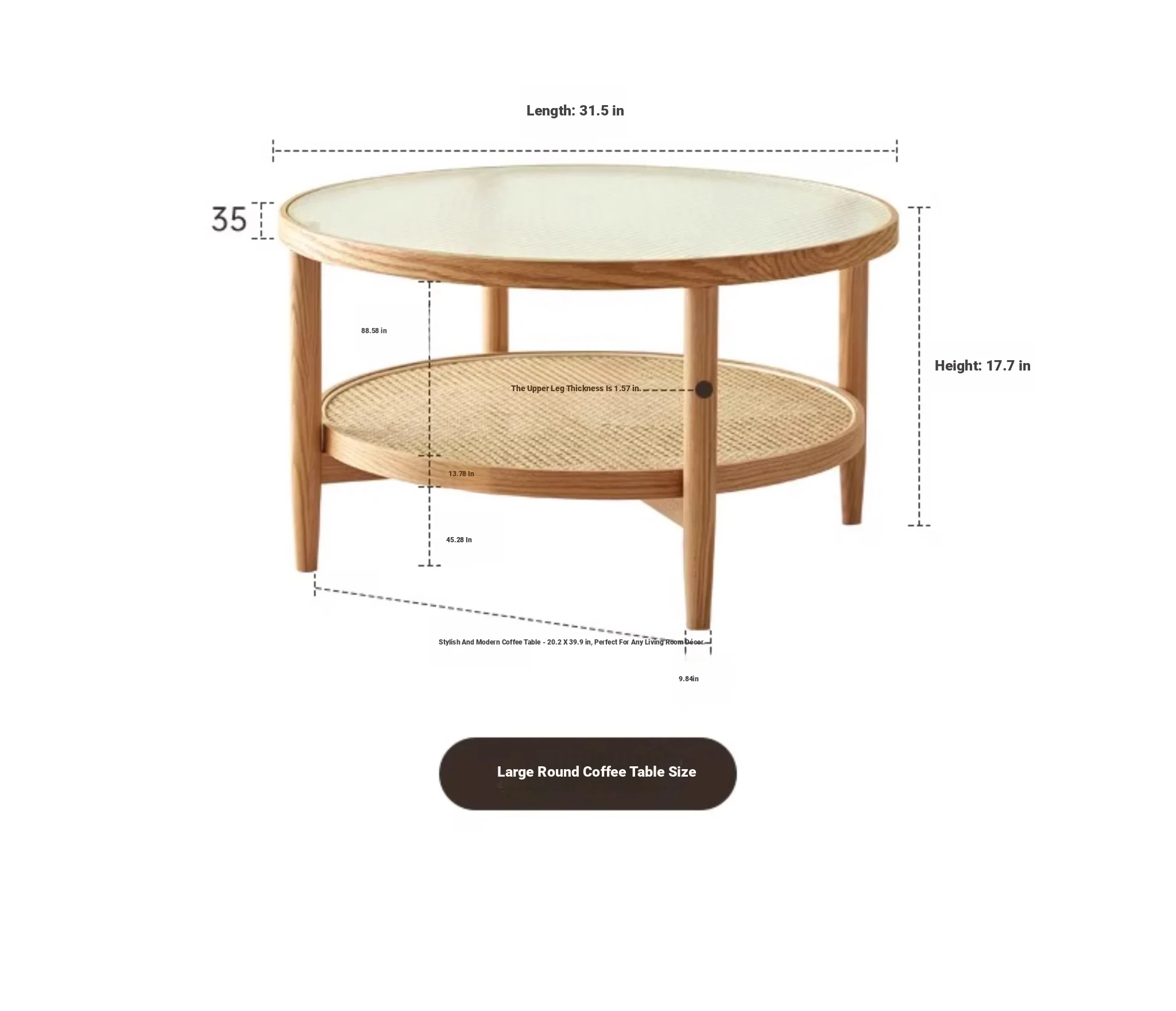 Stylish Round Coffee Table for Living Room - Modern Minimalist Design with Natural Solid Wood, Rattan Accents, and Double-layer Glass Top - Perfect for Home Decor and Entertaining