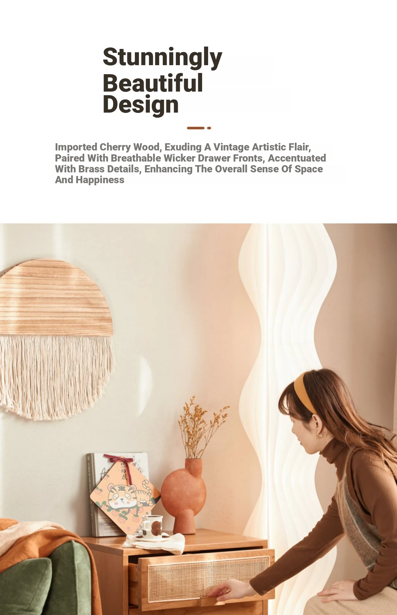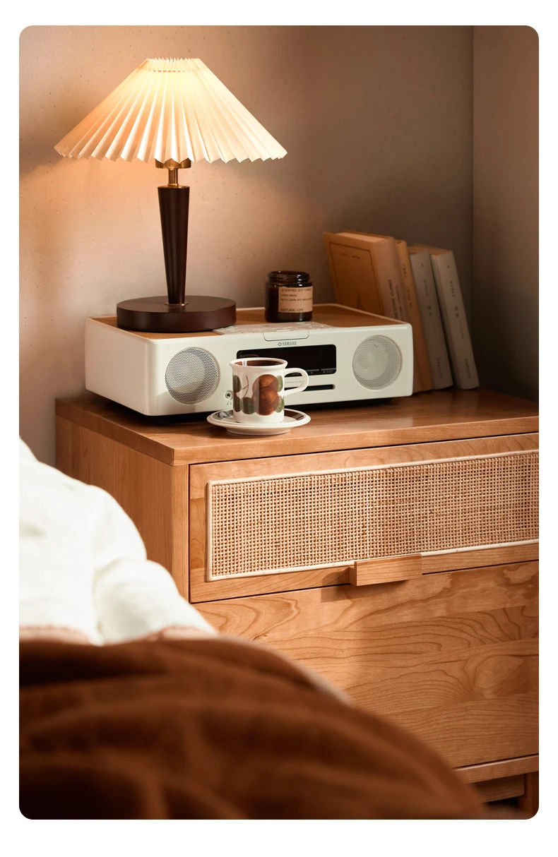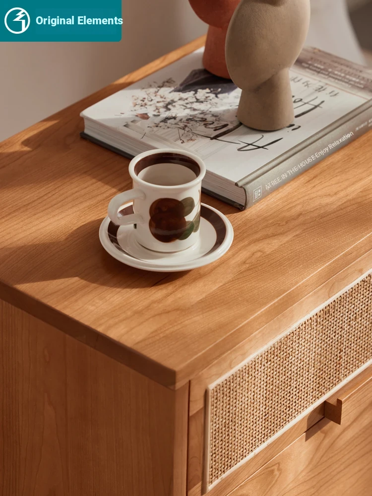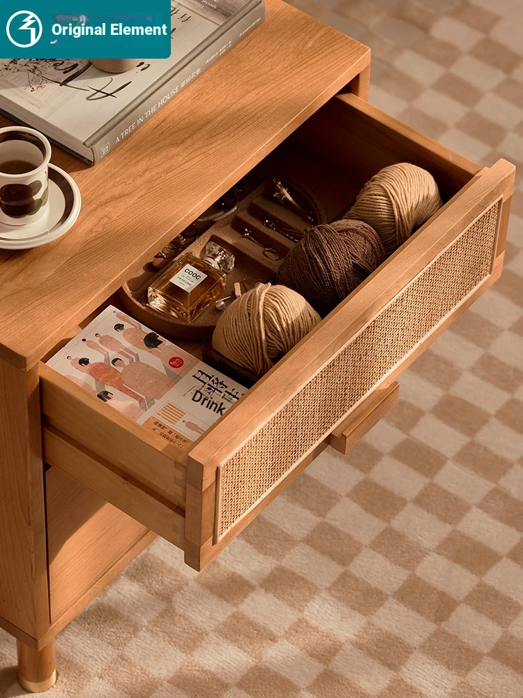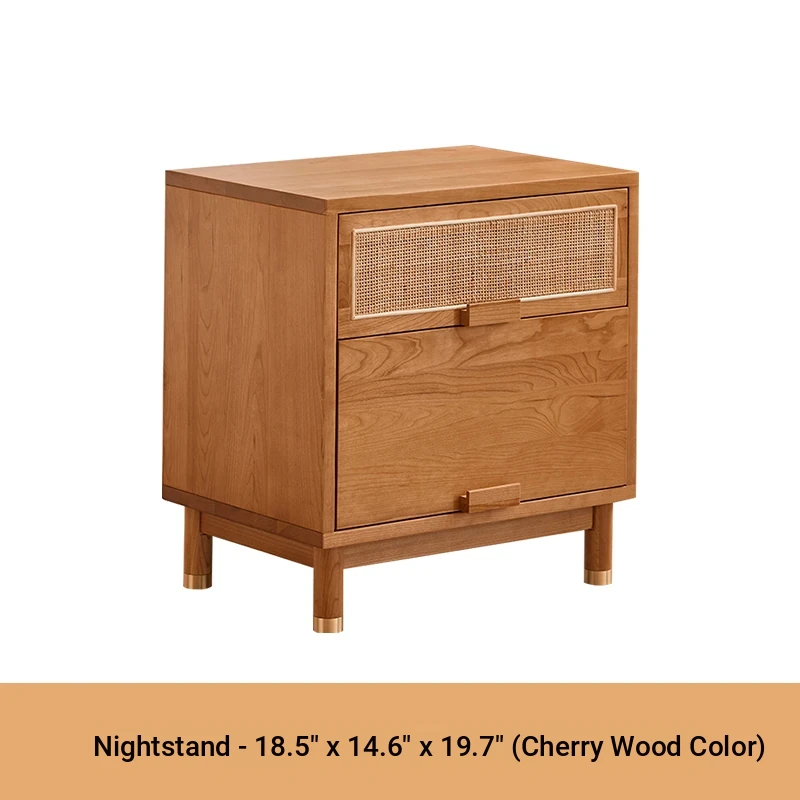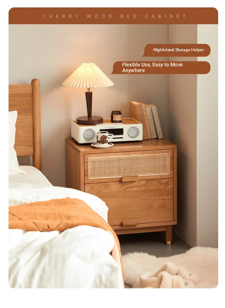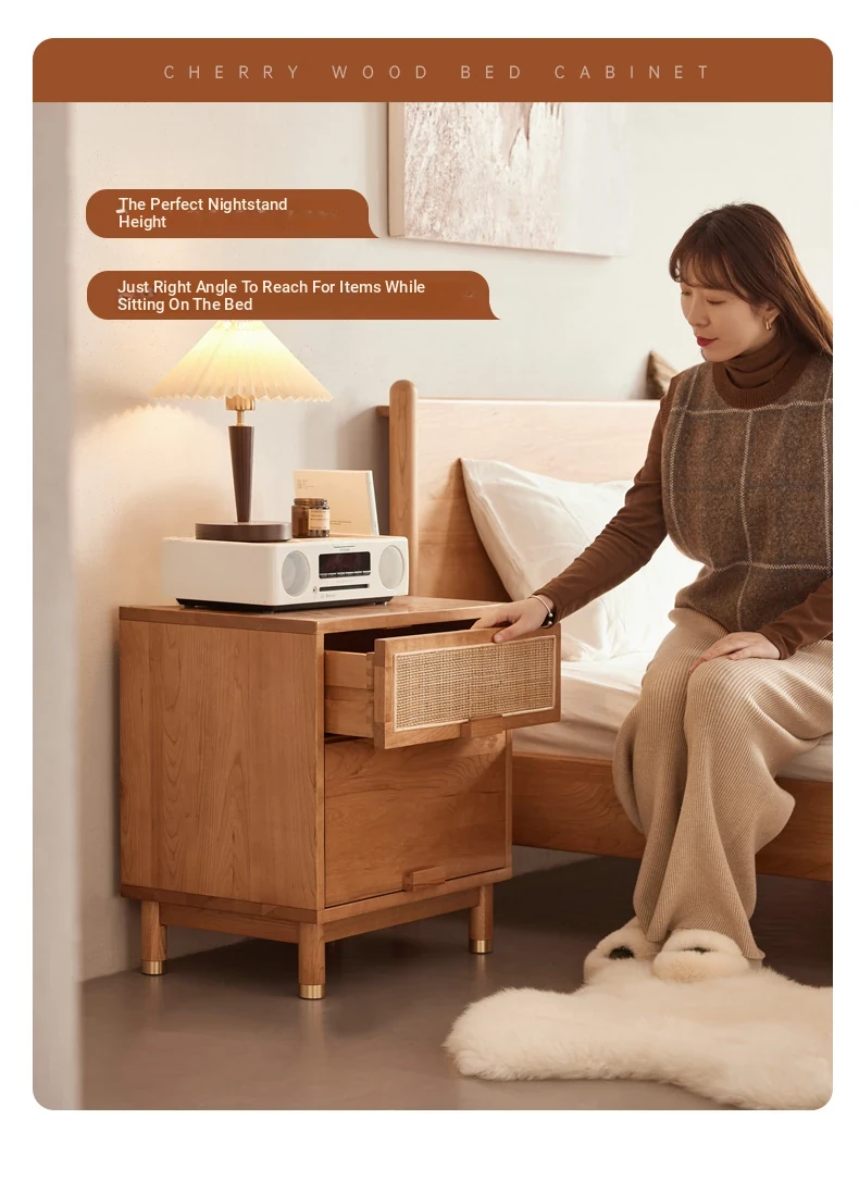 Stylish Solid Wood Nightstand - Scandinavian Minimalist Cherry Wood Bedside Cabinet with Japanese Woven Storage for Your Bedroom