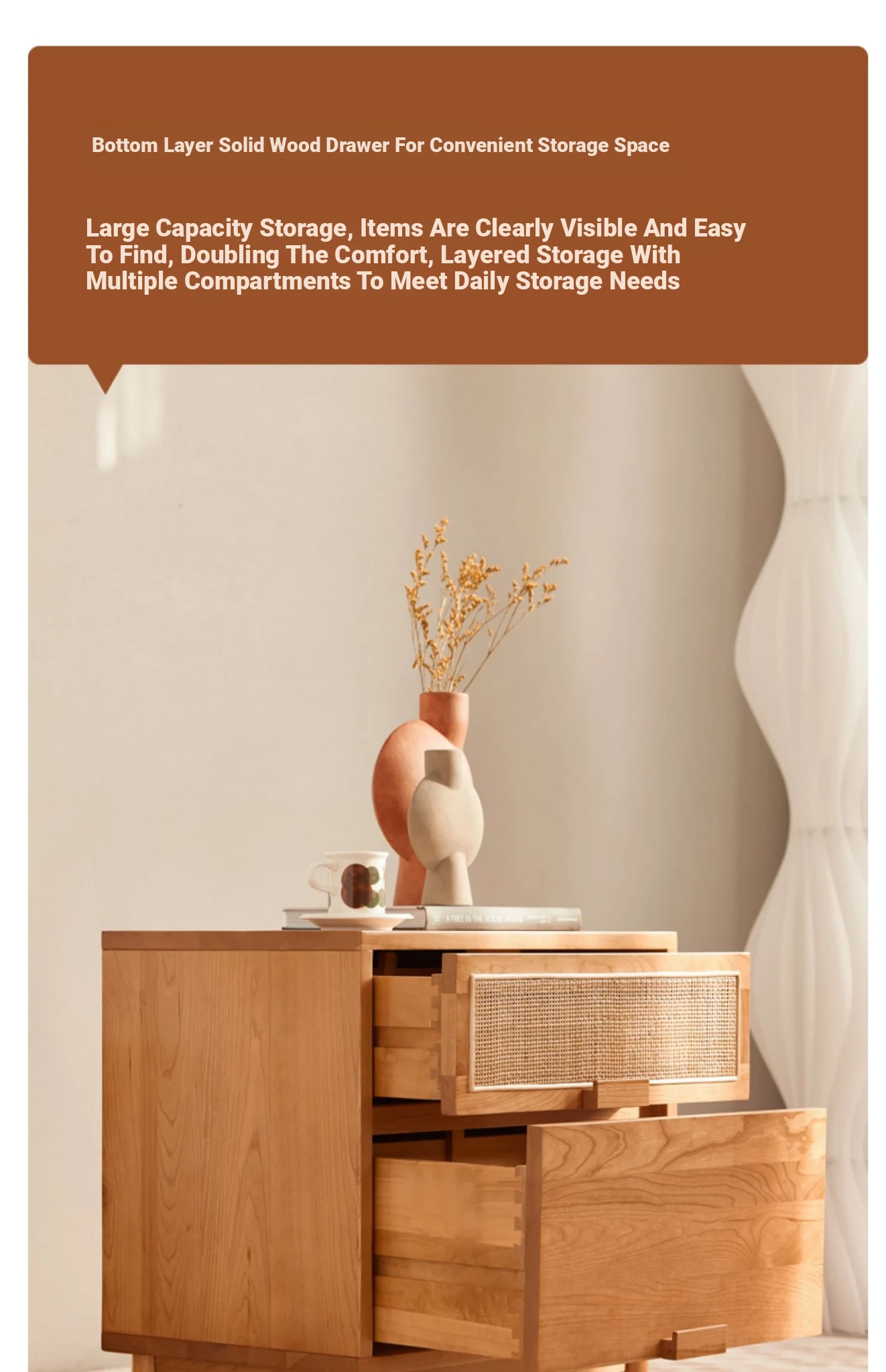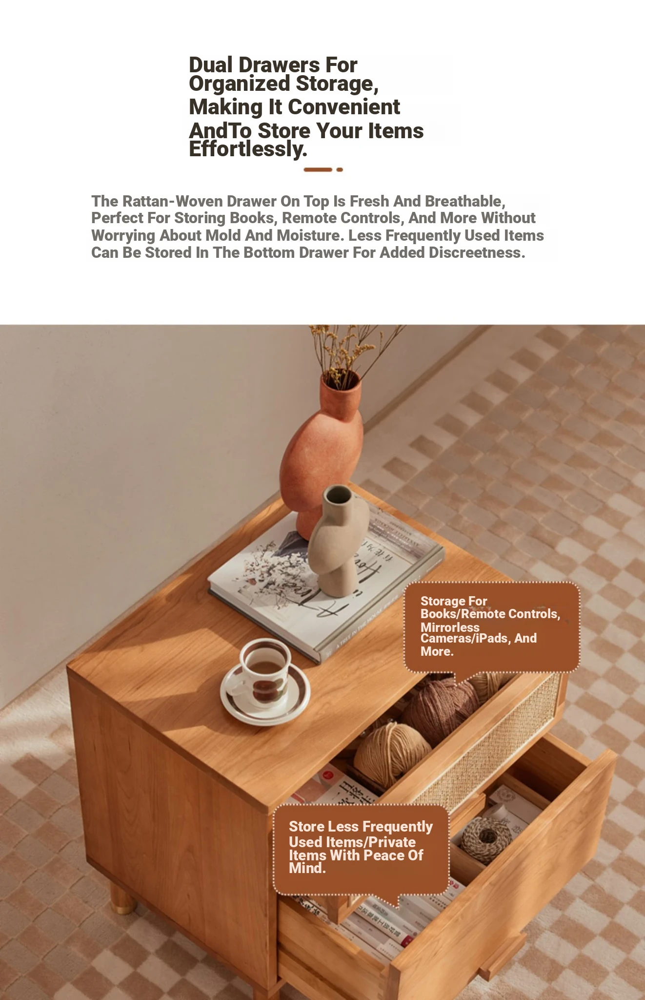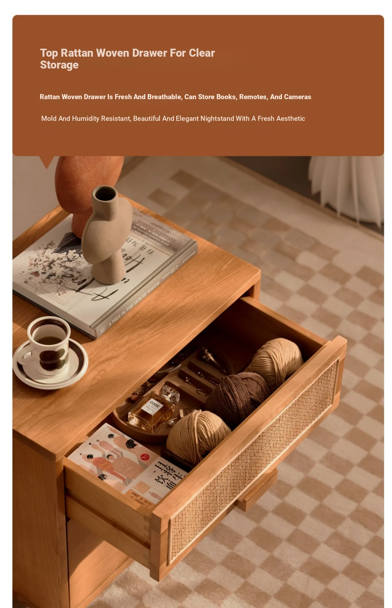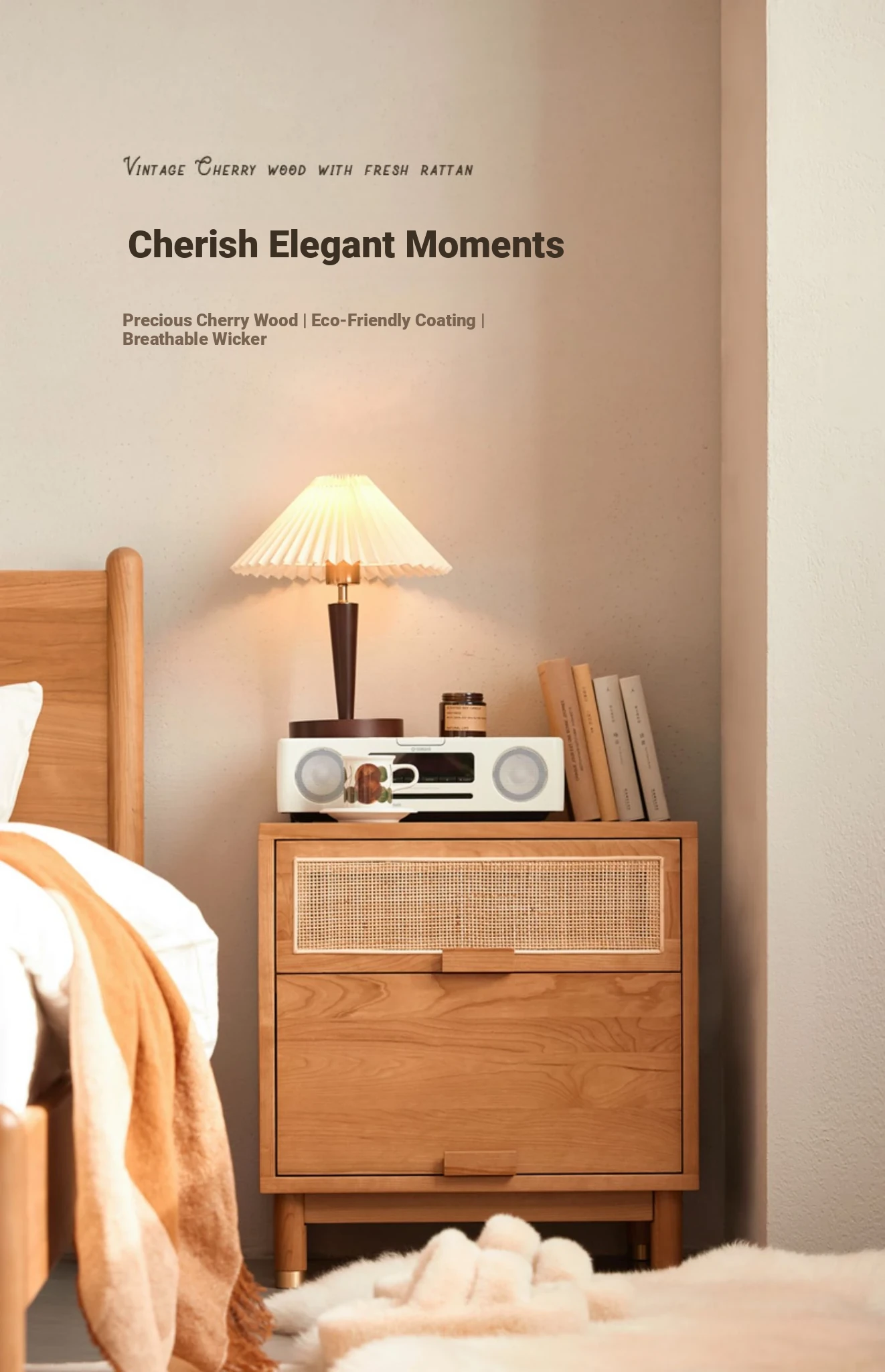 Stylish Solid Wood Nightstand - Scandinavian Minimalist Cherry Wood Bedside Cabinet with Japanese Woven Storage for Your Bedroom