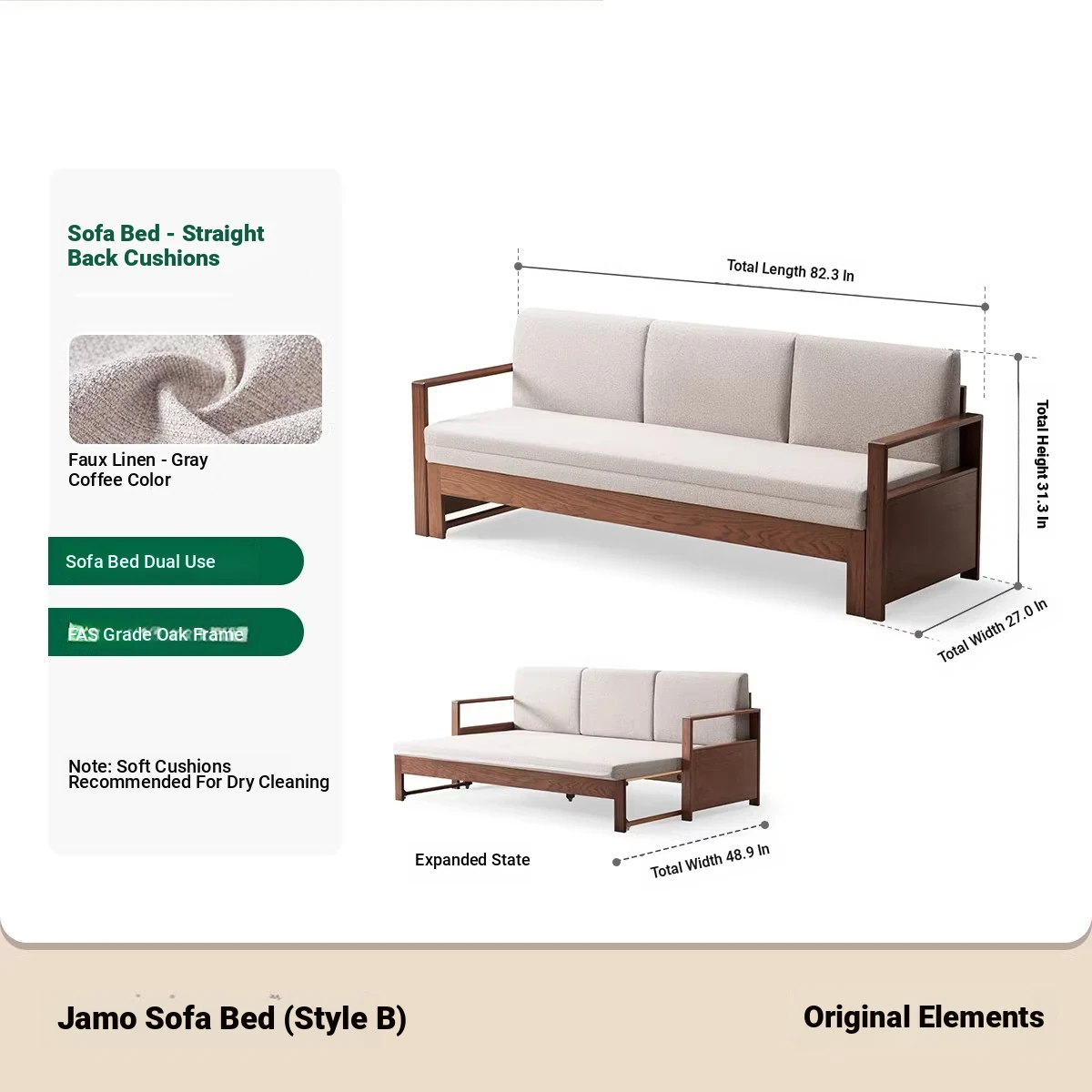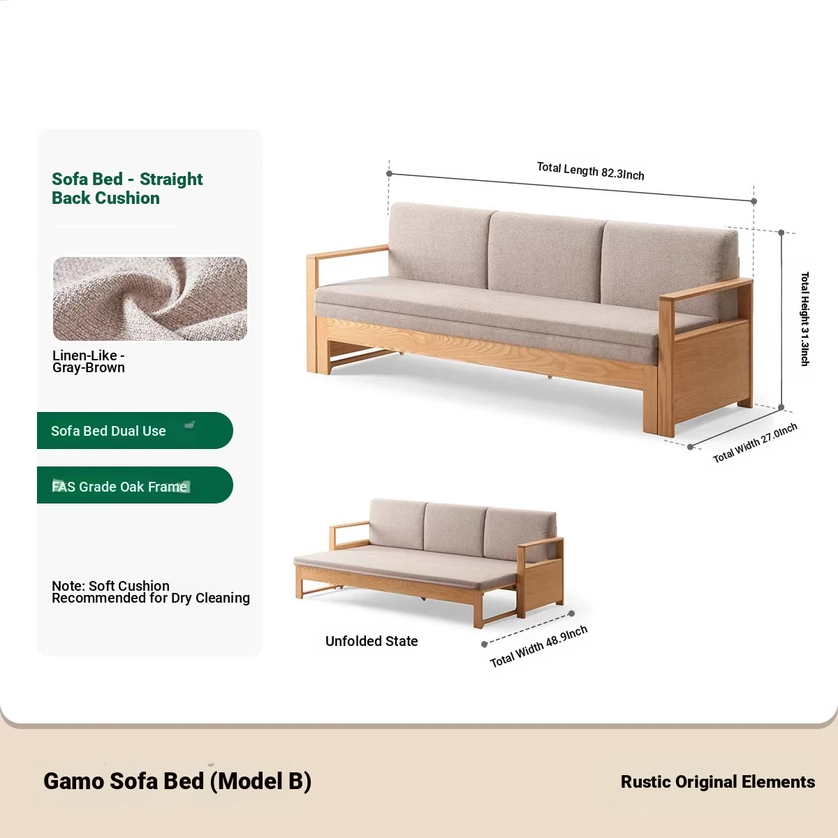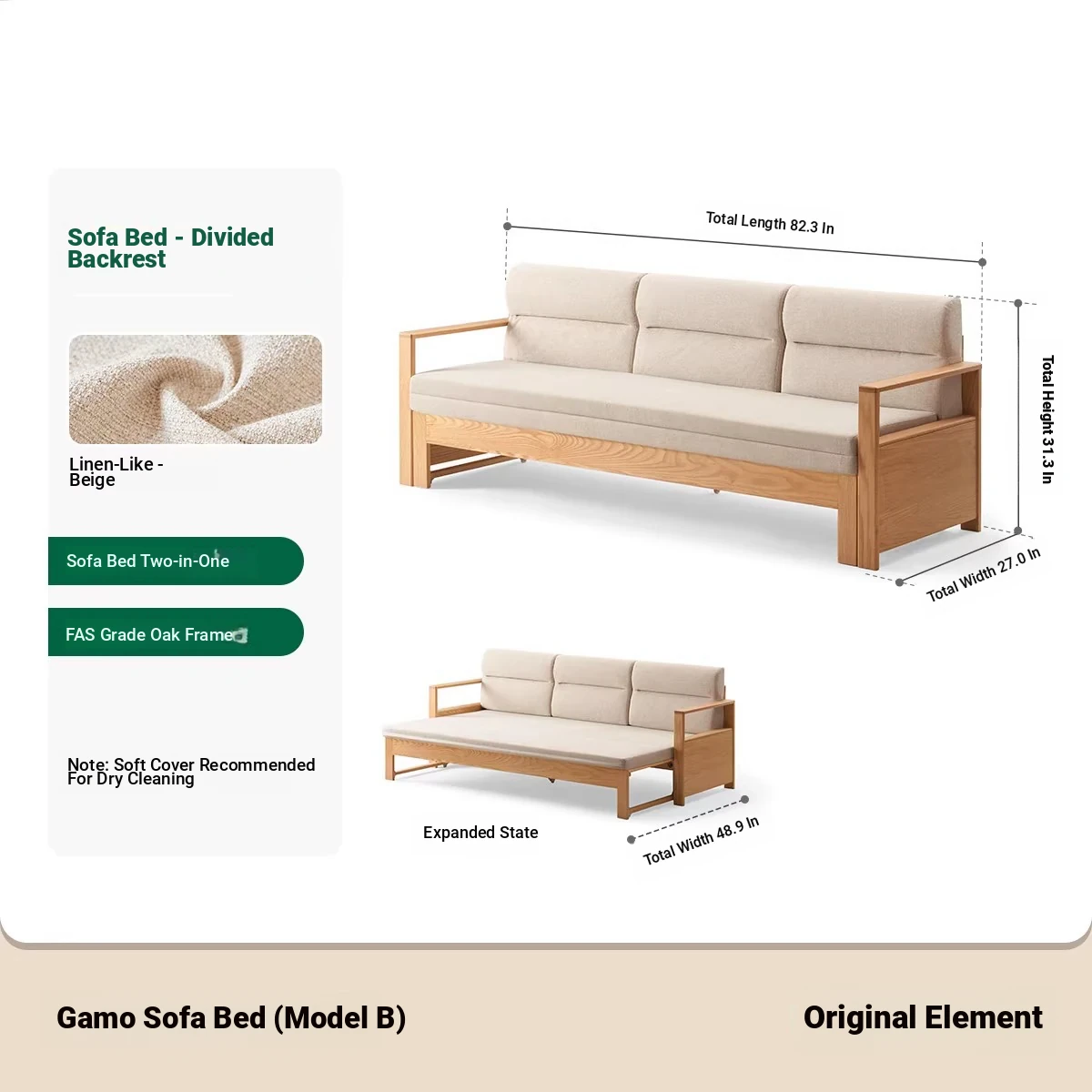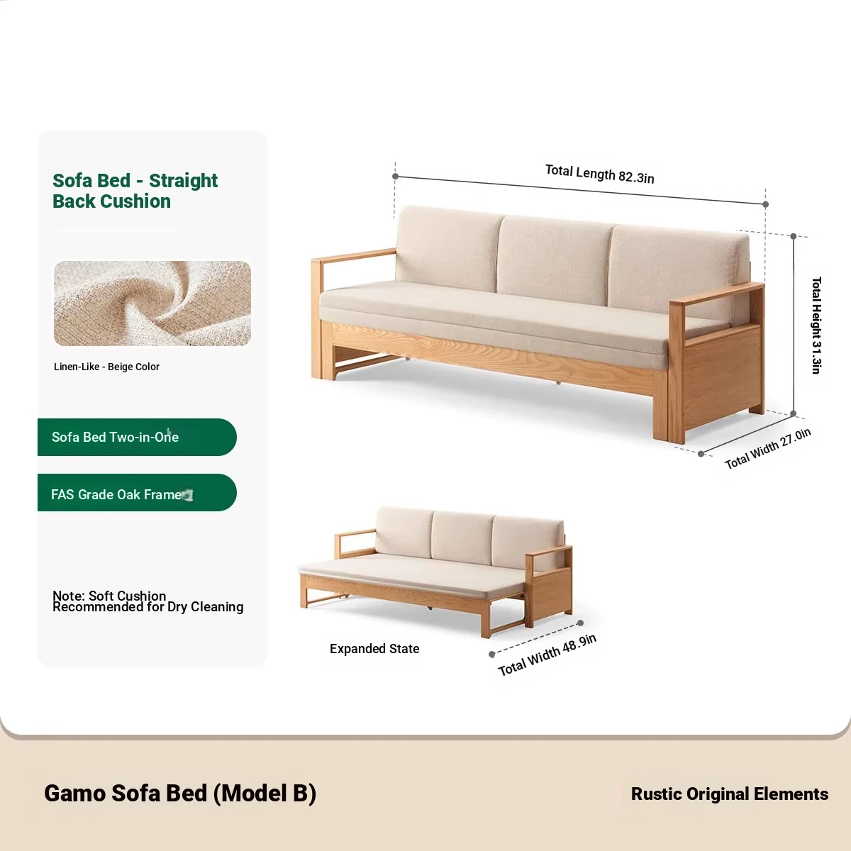 [Oak-Log Color] Jiamo Sofa Bed (Section B)-(Including Beige Pad Segmented Backrest) 2090*687/1241*695
