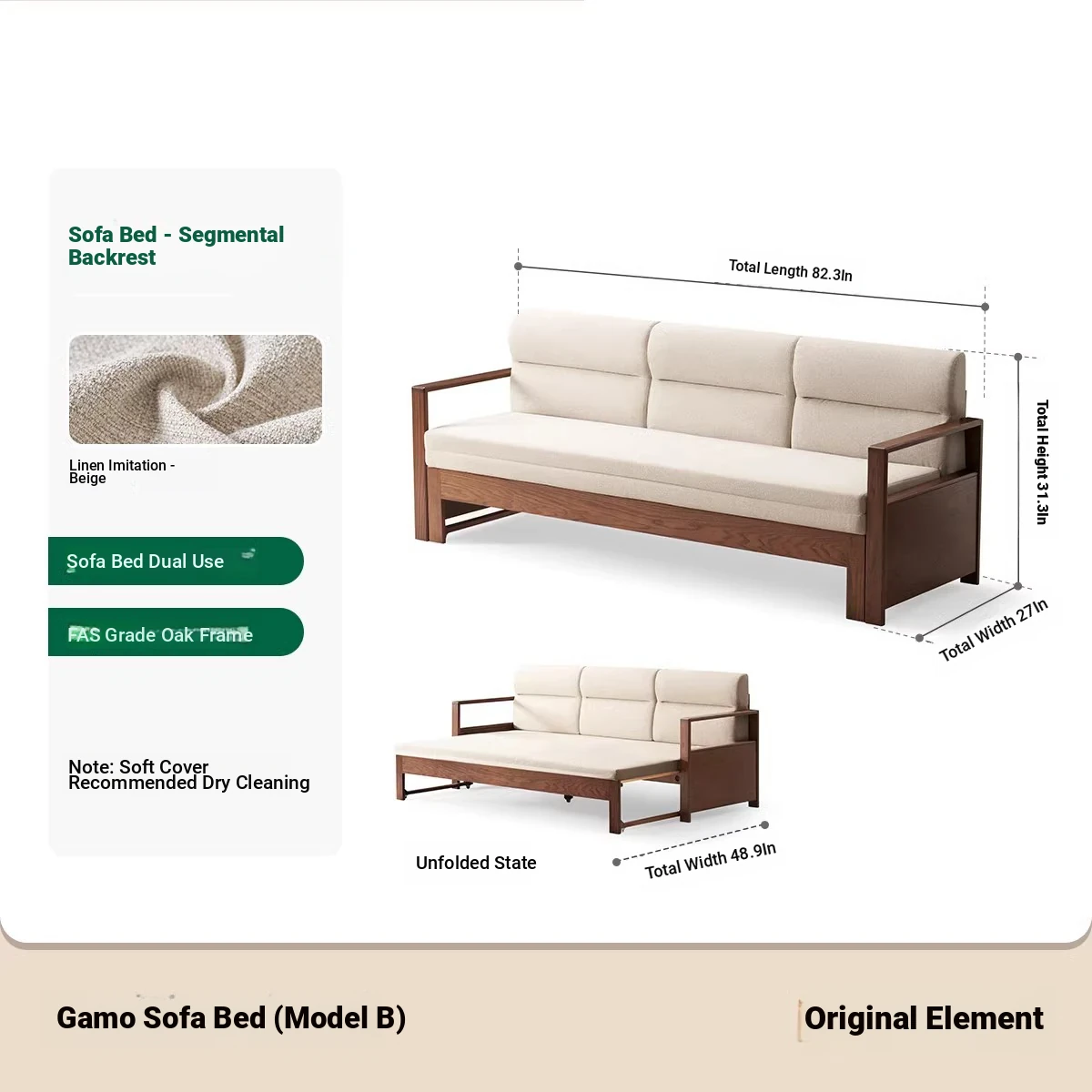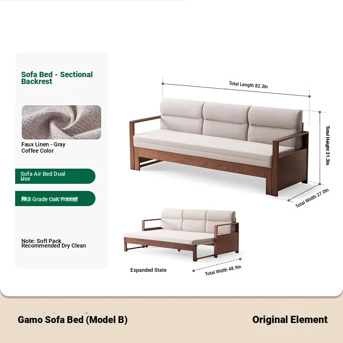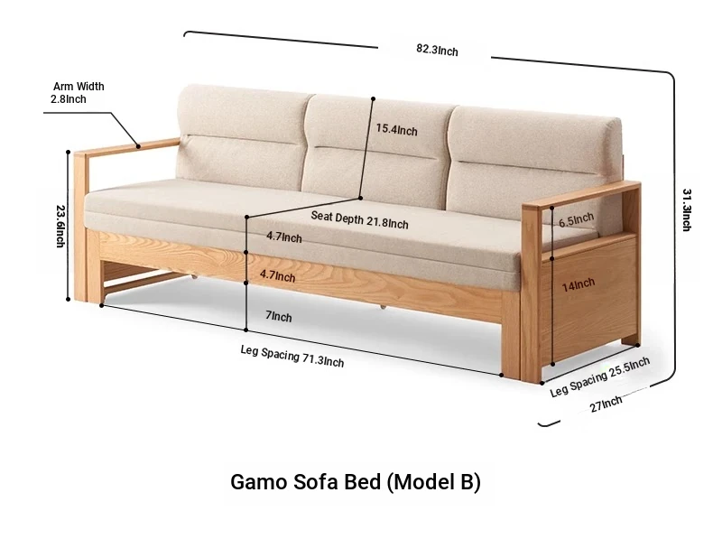 [Oak-Black Walnut] Garmo Sofa Bed (Section B)-(Including Beige Pad Segmented Backrest) 2090*687/1241*695