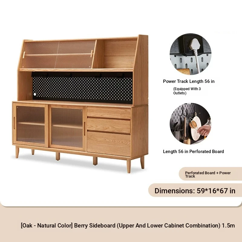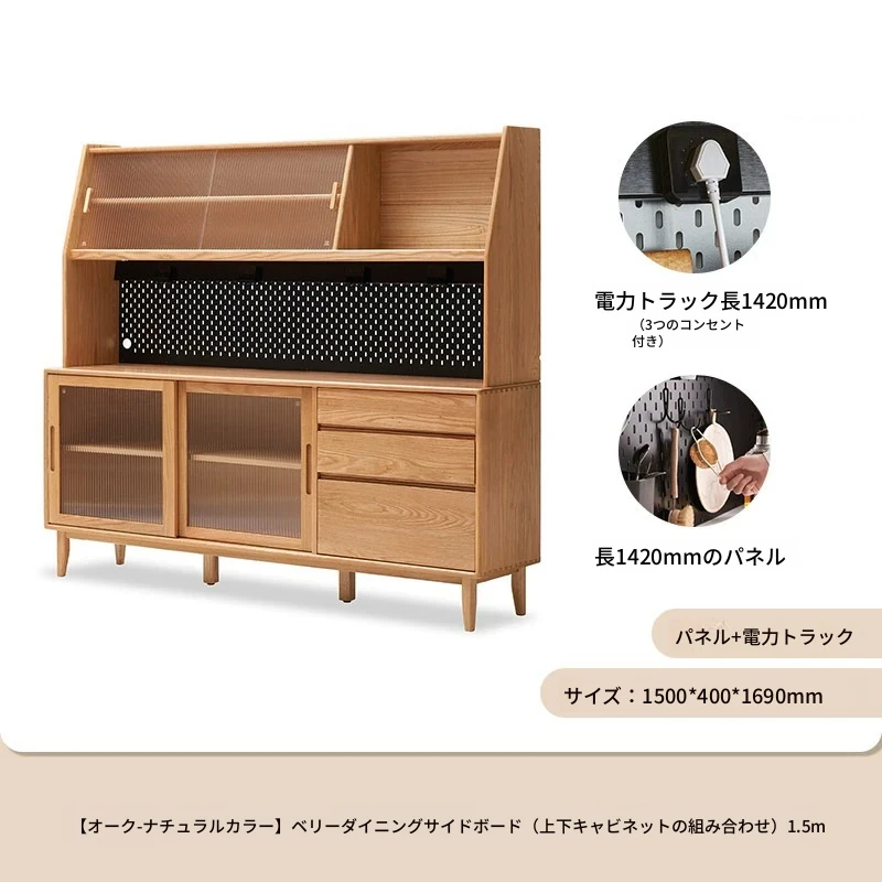 原木色-1.5mダイニングサイドボード上キャビネット付き-多機能(全ての穴あきプレート+電源レール)(1500*400*1690mm)