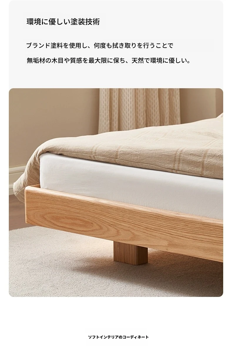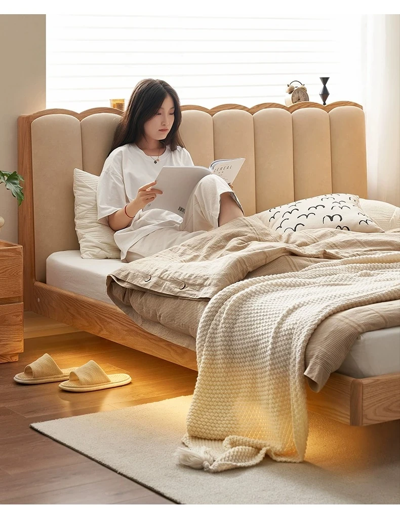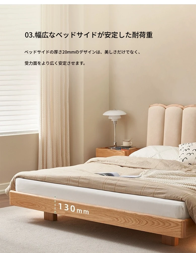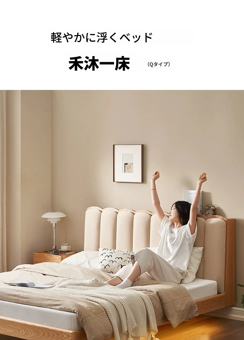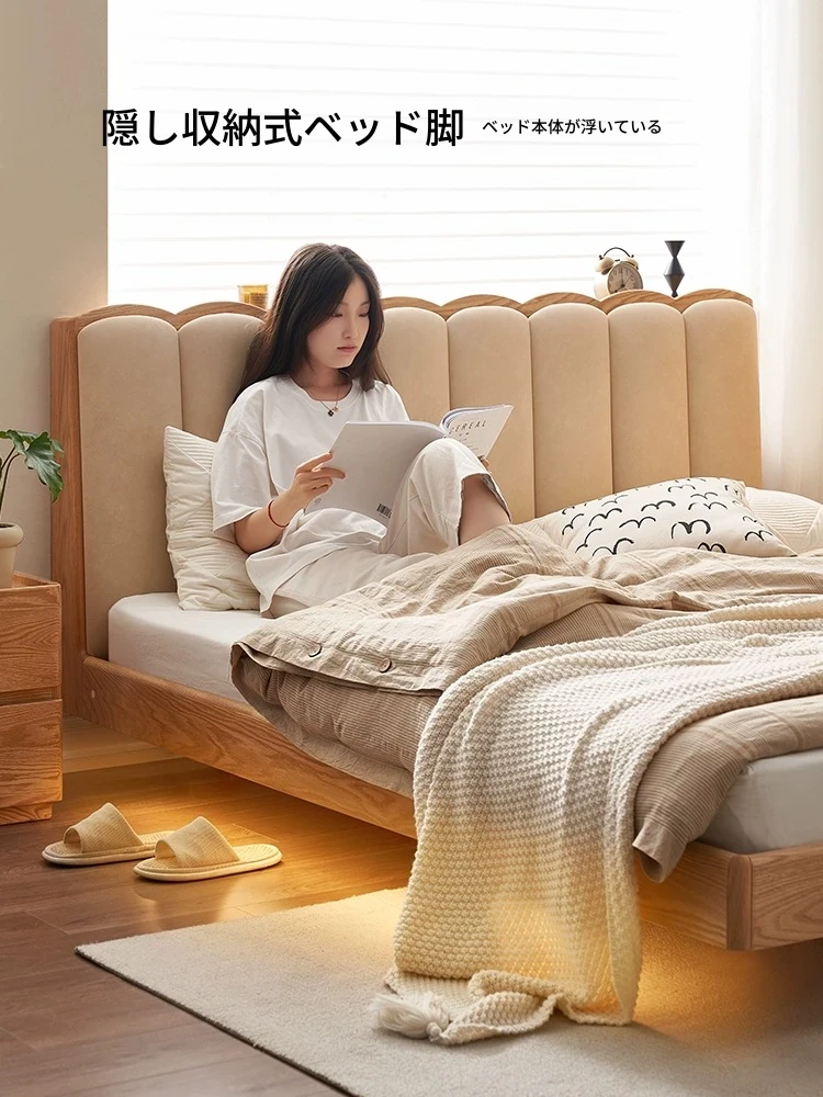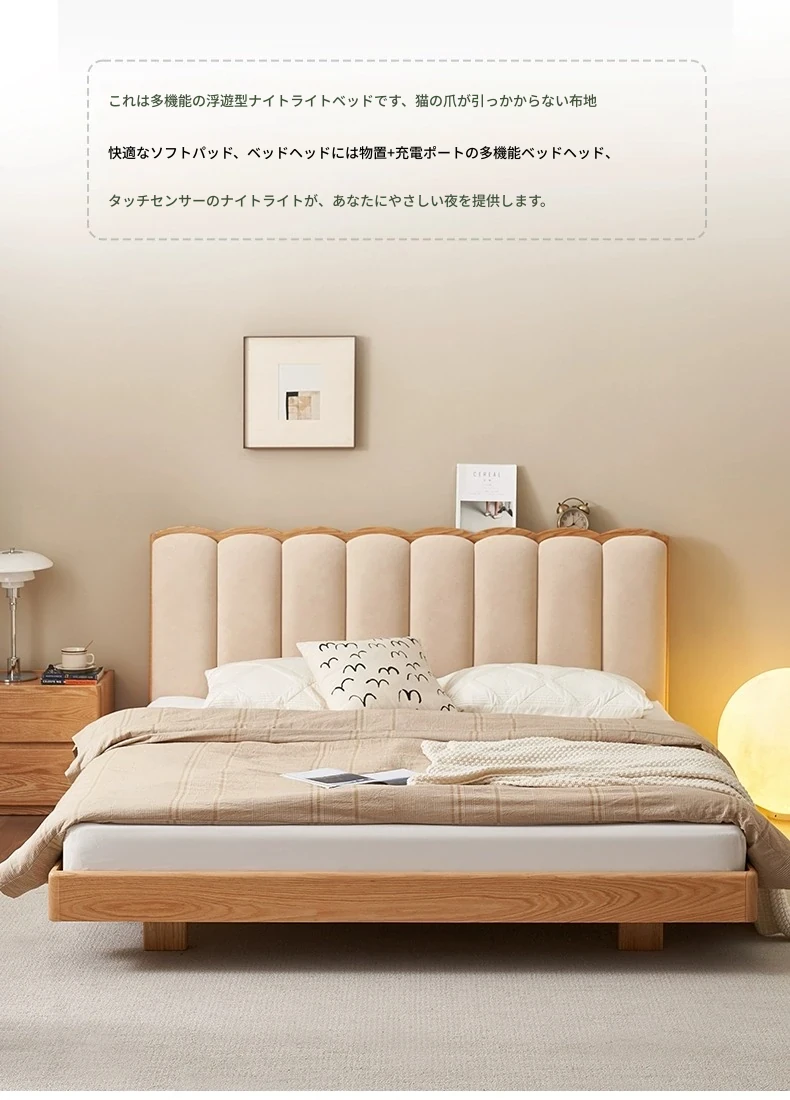 原始のエレメント、無垢材のシンプルモダンオーク花びらベッド - フレンチクリームスタイルの浮遊ベッド! 快適なダブルサイズで、あなたの寝室に優雅さと自然美をプラス。