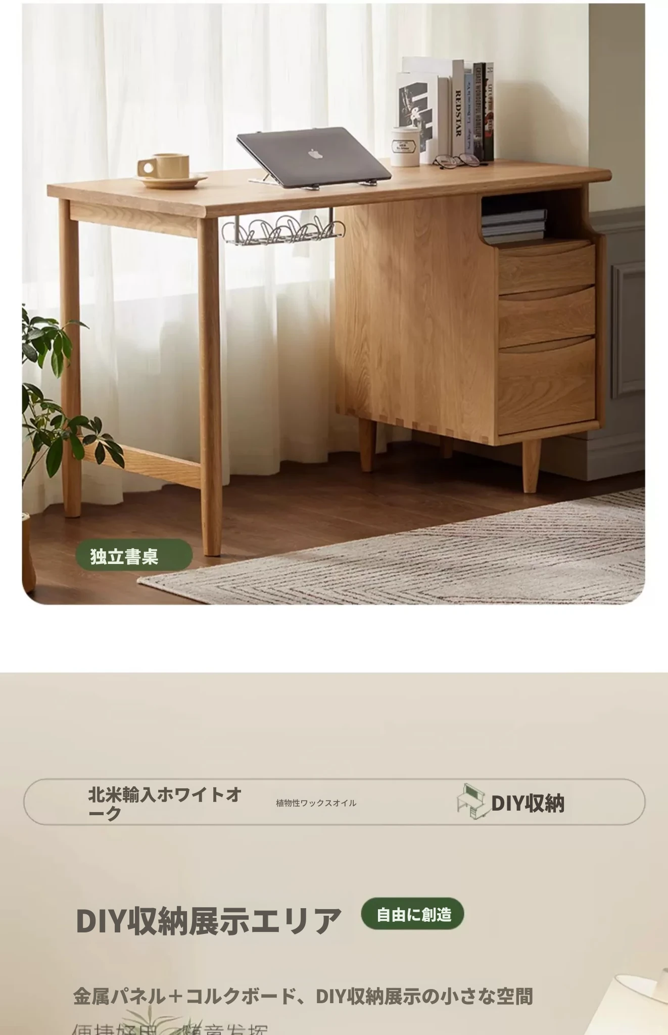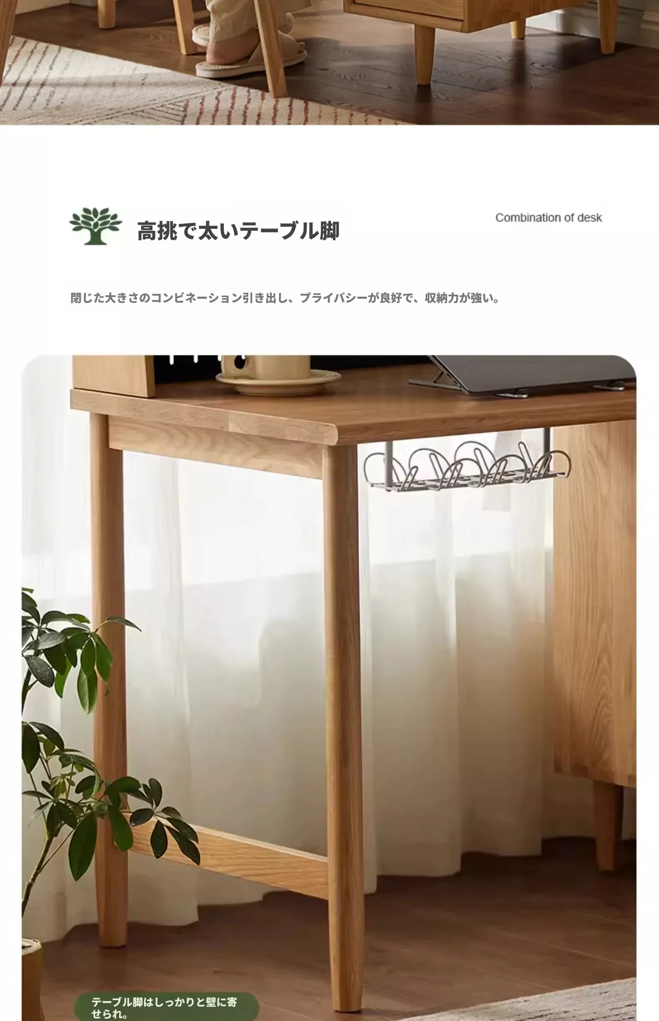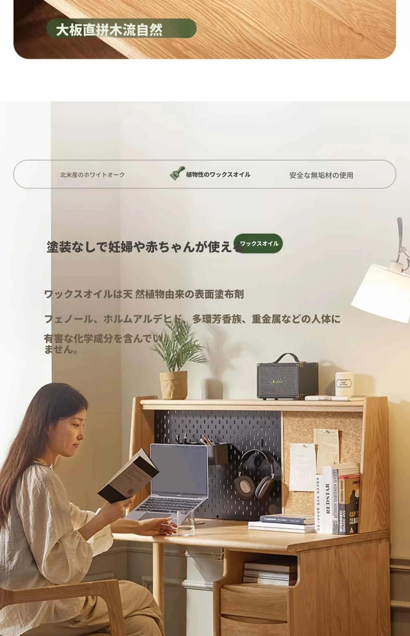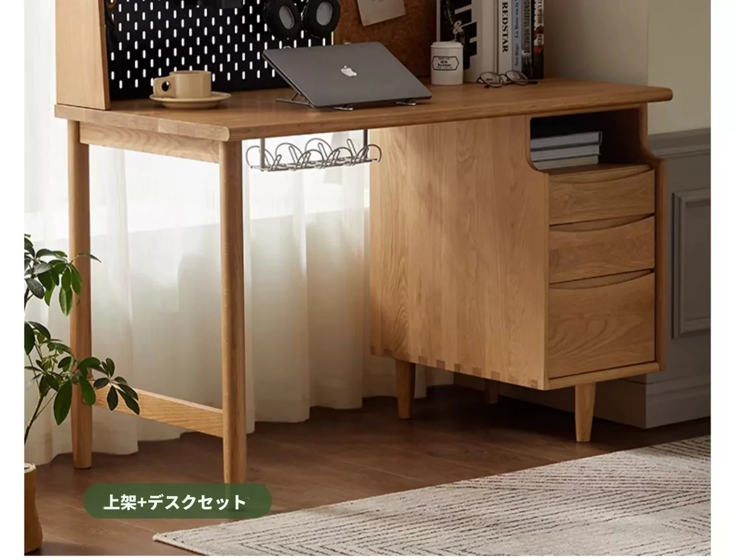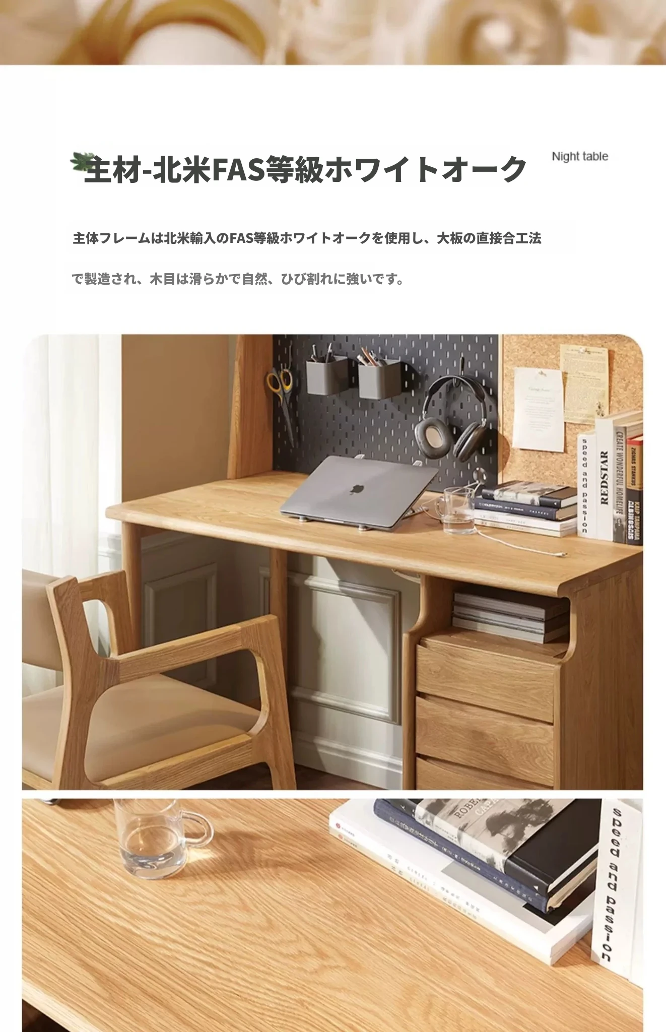 原木のオフィスデスク&書棚セット - ホワイトオーク製、シンプルでスタイリッシュなデザイン、自宅学習や仕事に最適!快適な作業空間を実現し、収納力も抜群です。