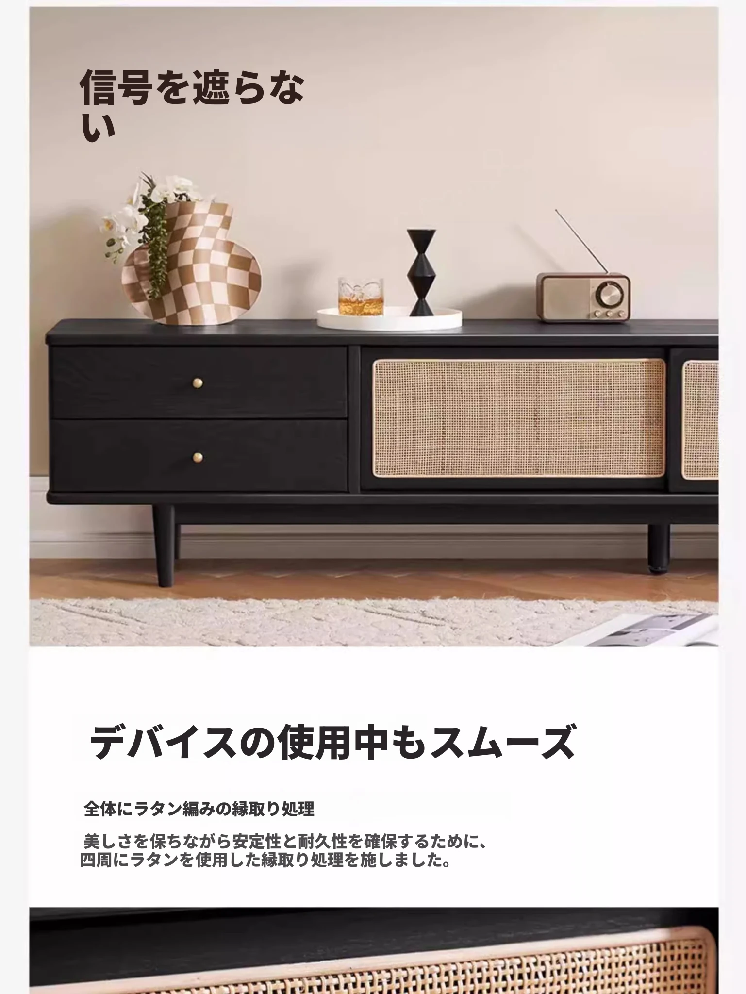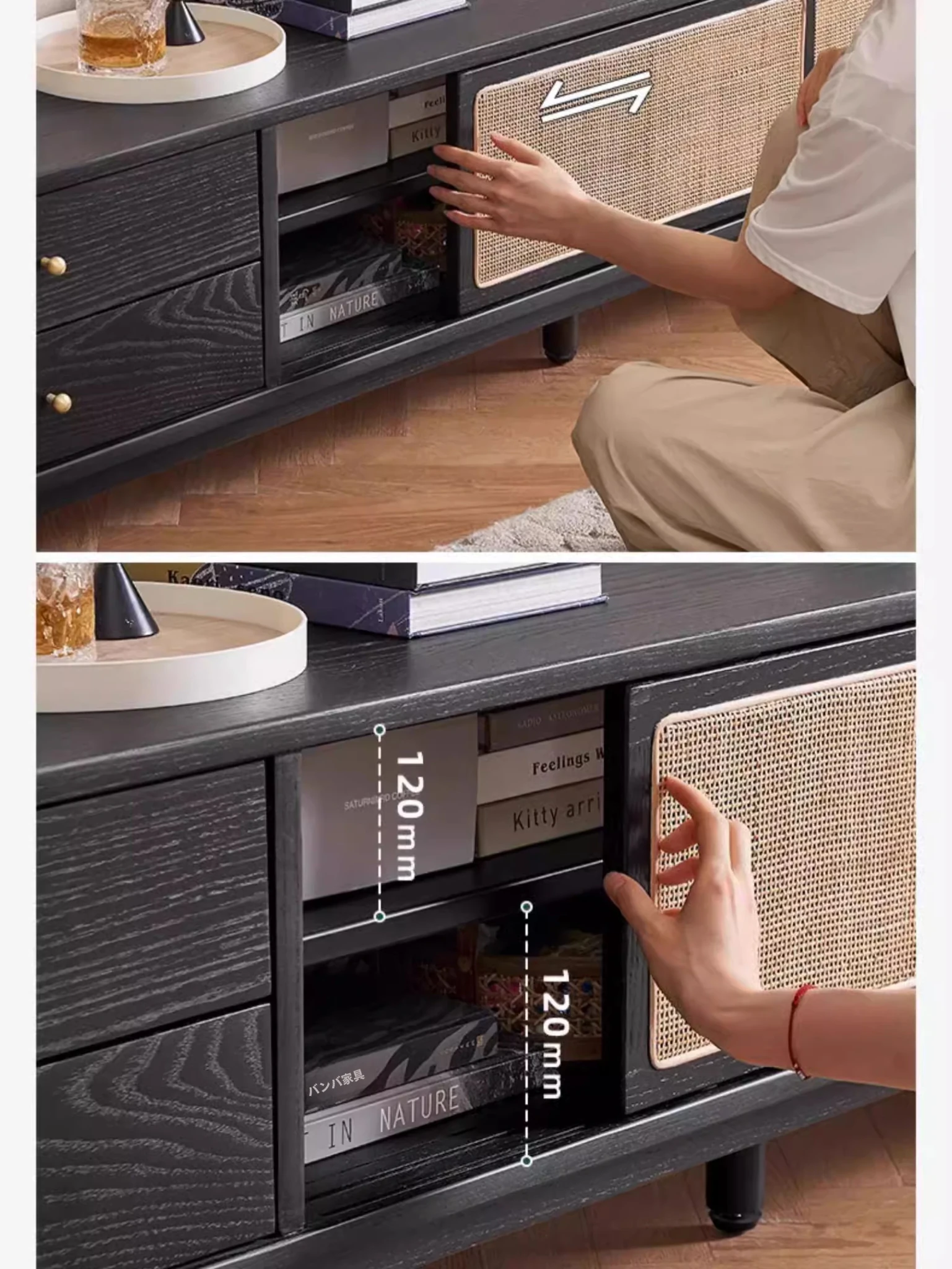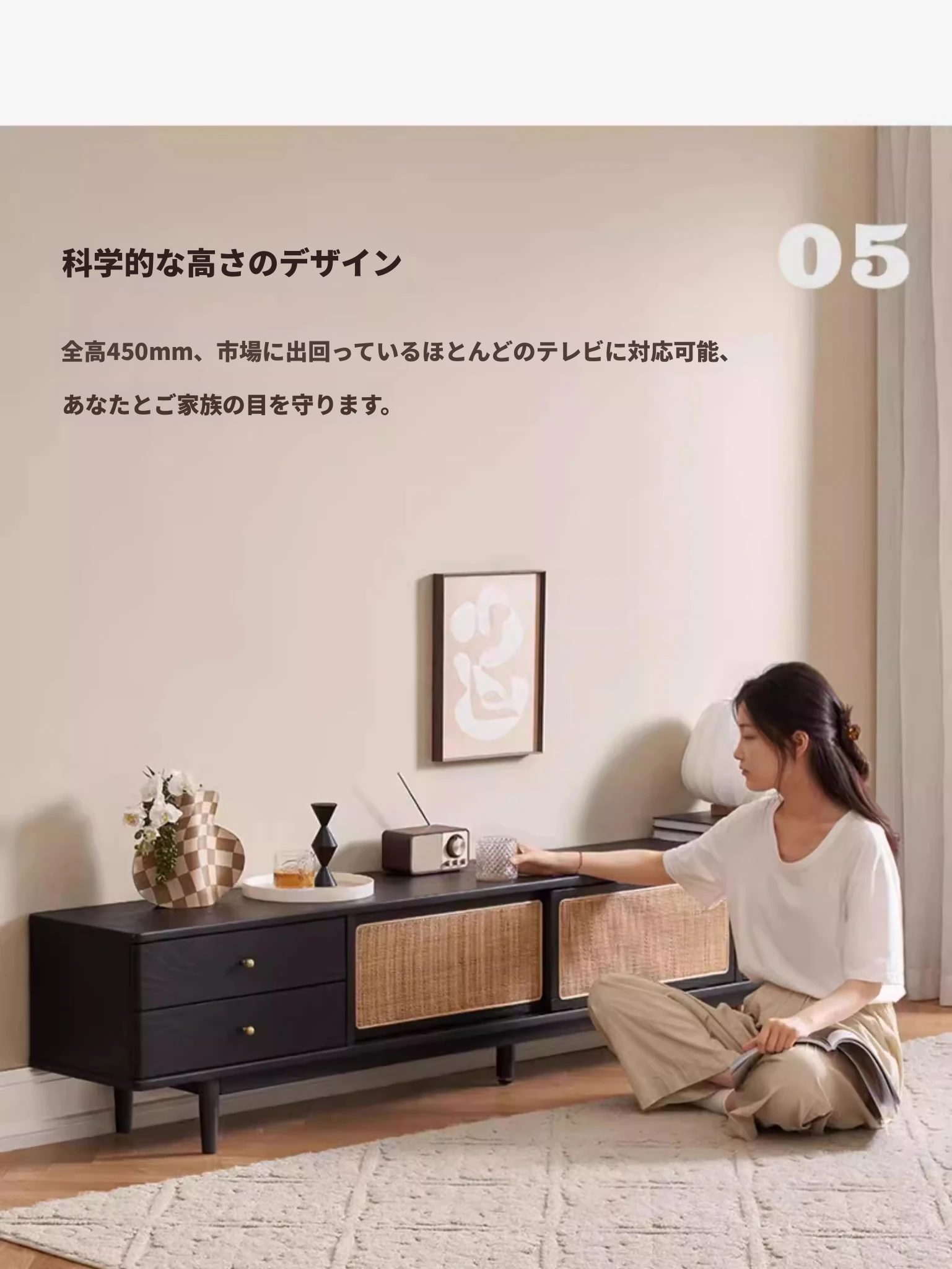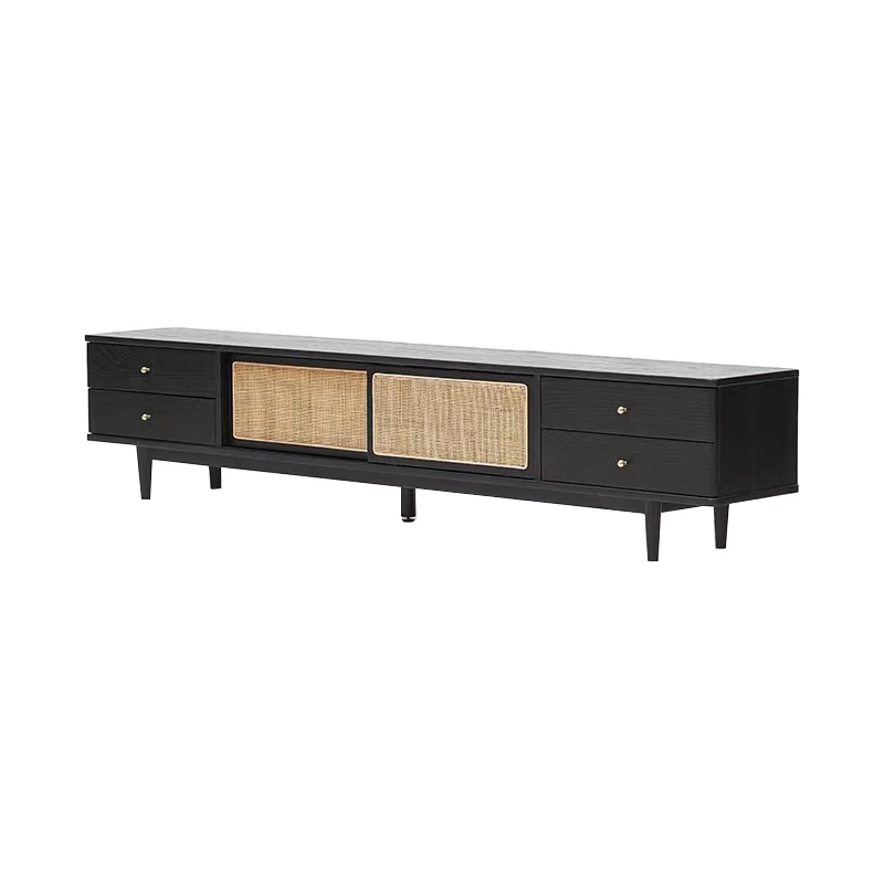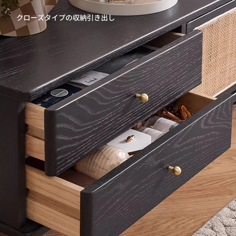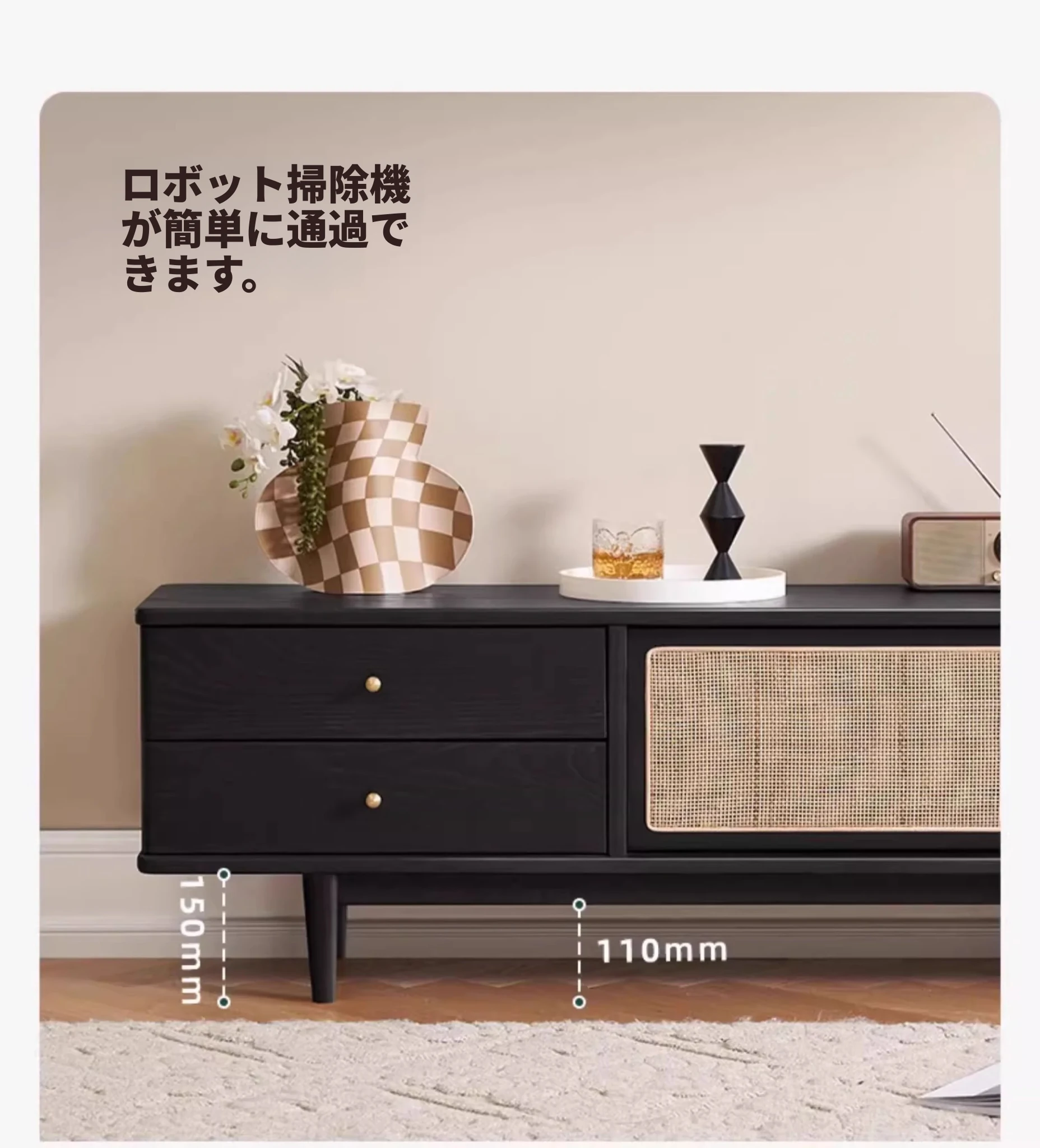 オーガニックバージン無垢材のテレビボード - ラグジュアリー感あふれる小型リビングにぴったりなオーク&ラタンの収納キャビネット。洗練されたデザインで、スタイリッシュにお部屋を彩ります。収納力も抜群!