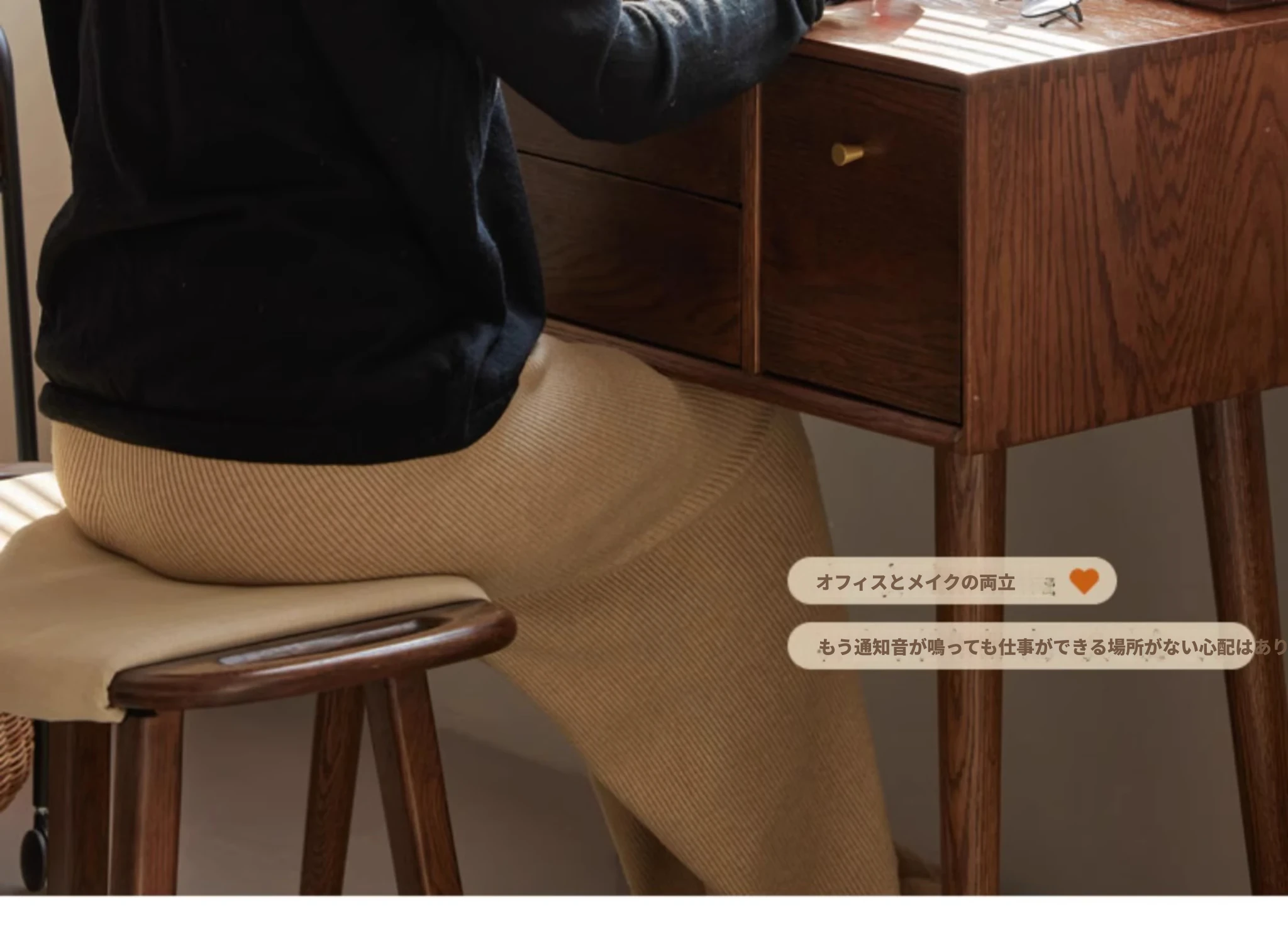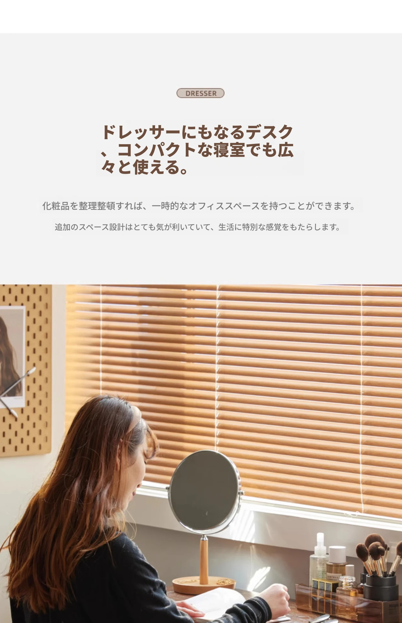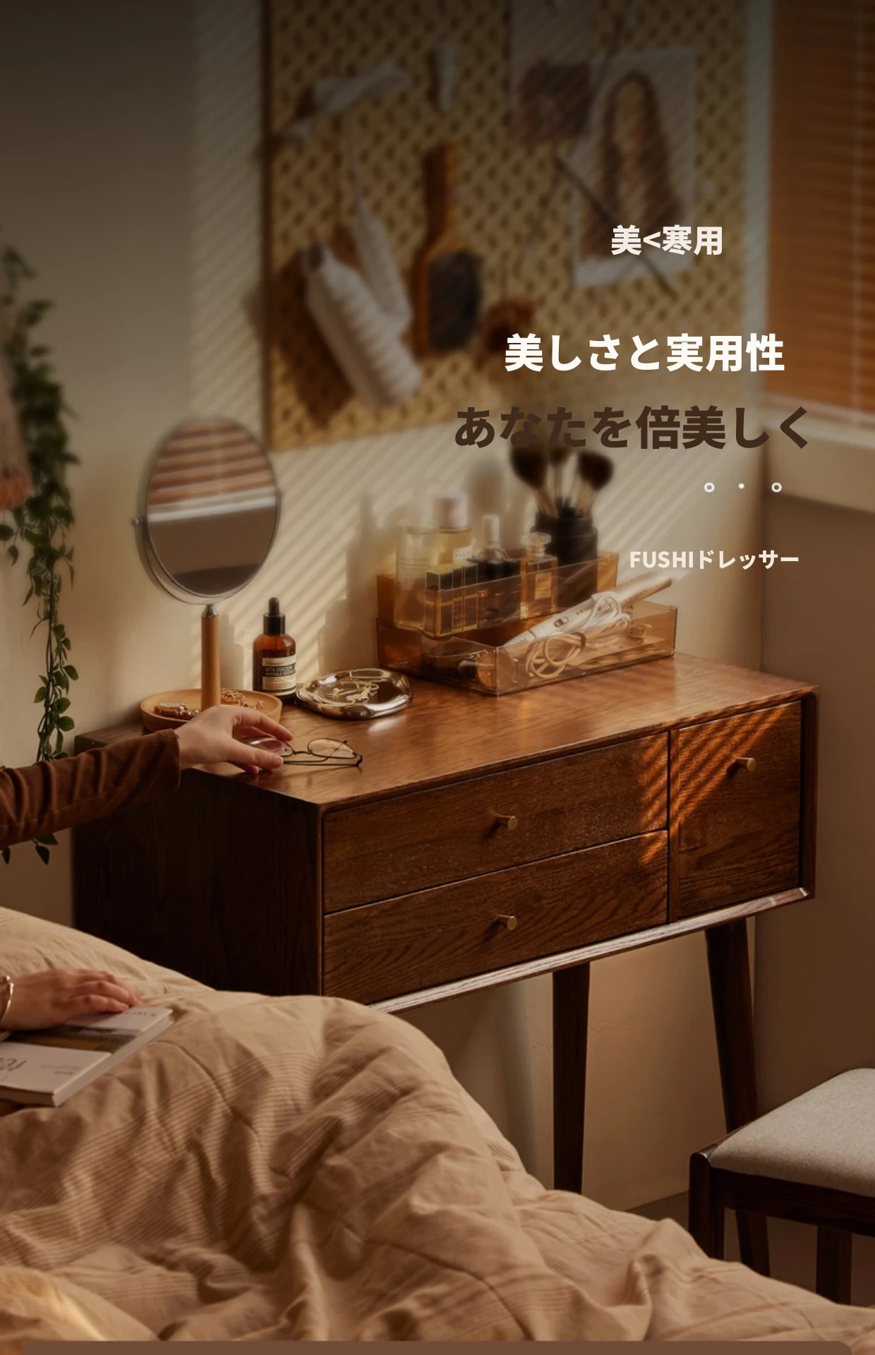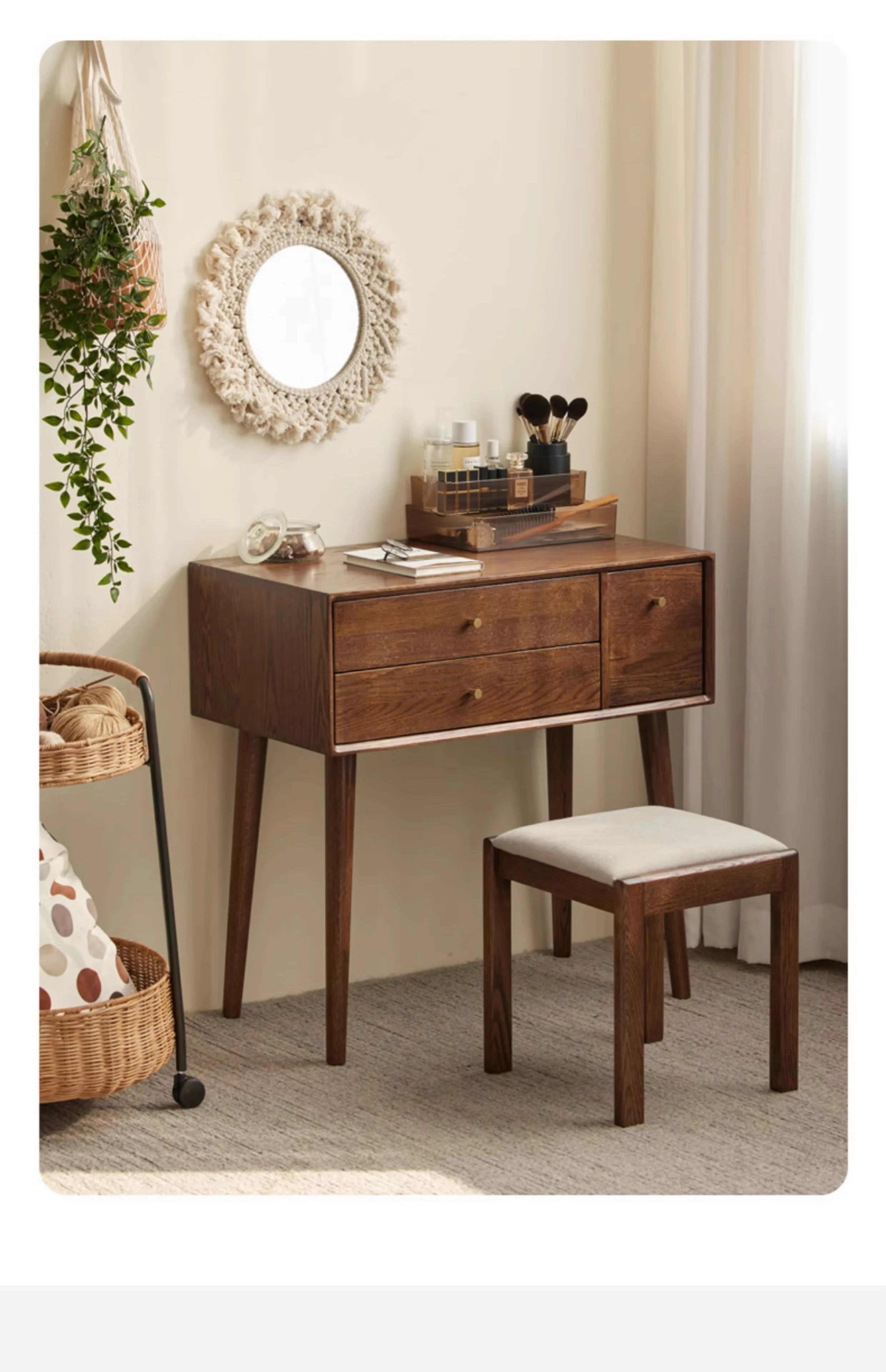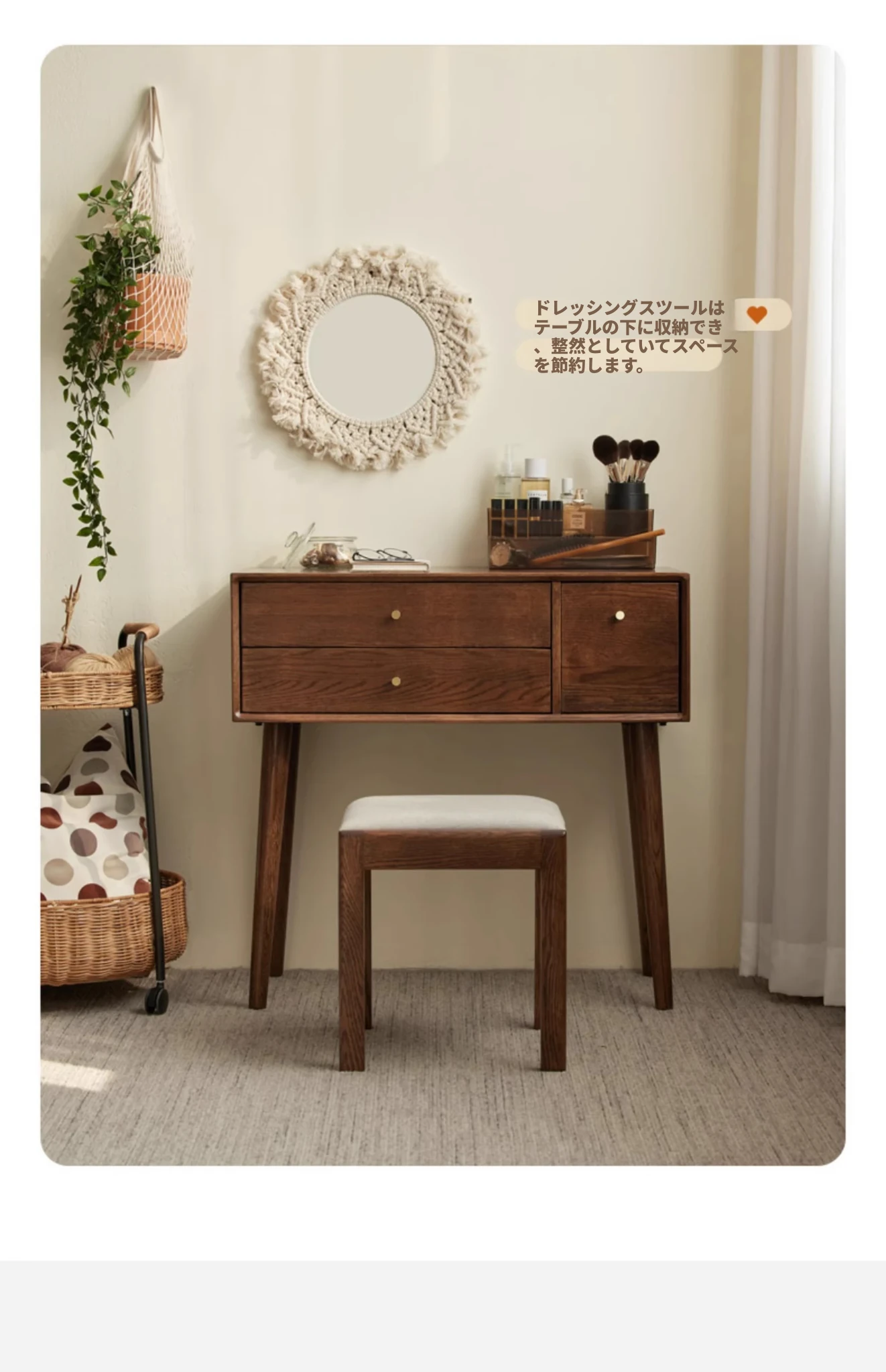 オリジナル無垢材化粧台|北欧スタイルのコンパクトデザイン|収納付きで使い勝手抜群|小さなお部屋にぴったりなオーク製ドレッサー兼デスク【美しい仕上げで毎日のメイクアップが楽しくなる】