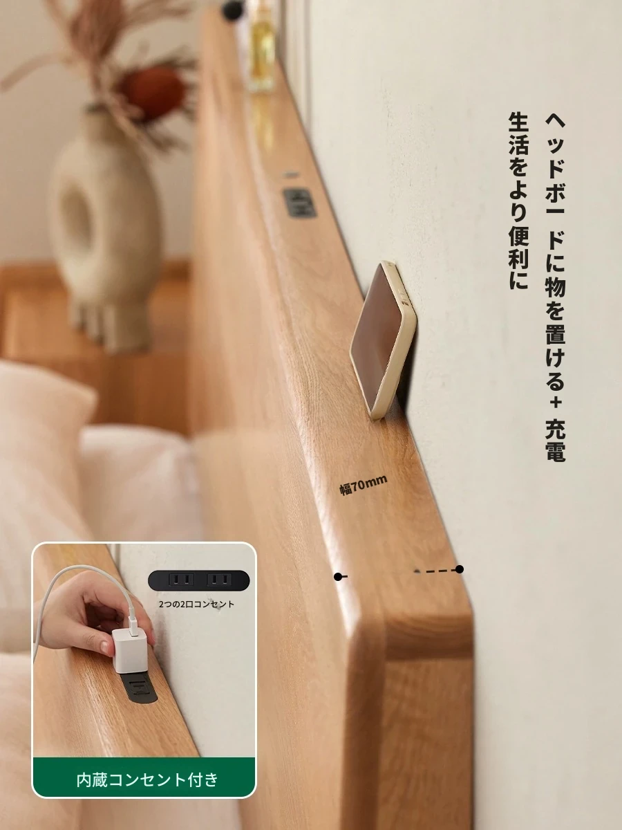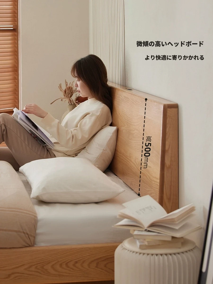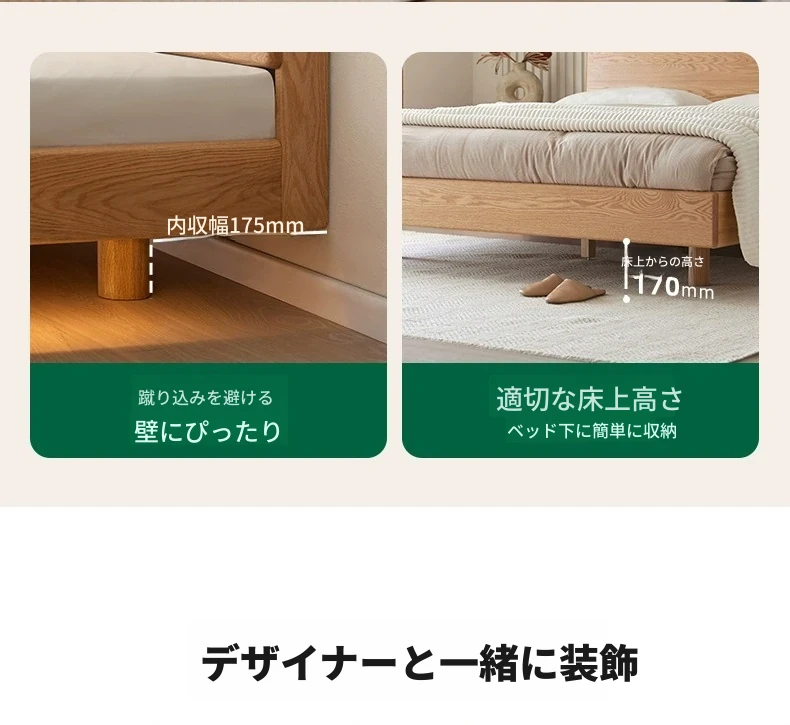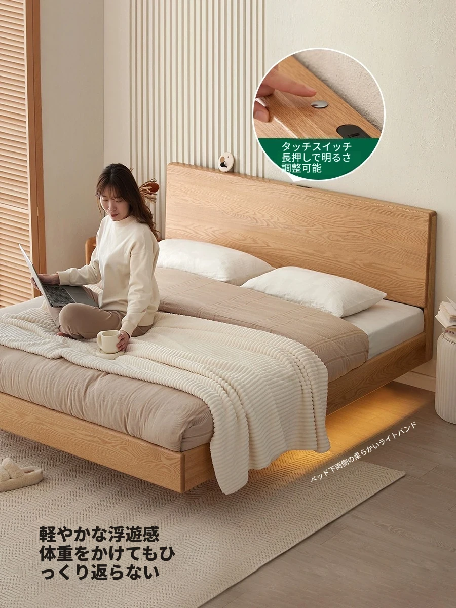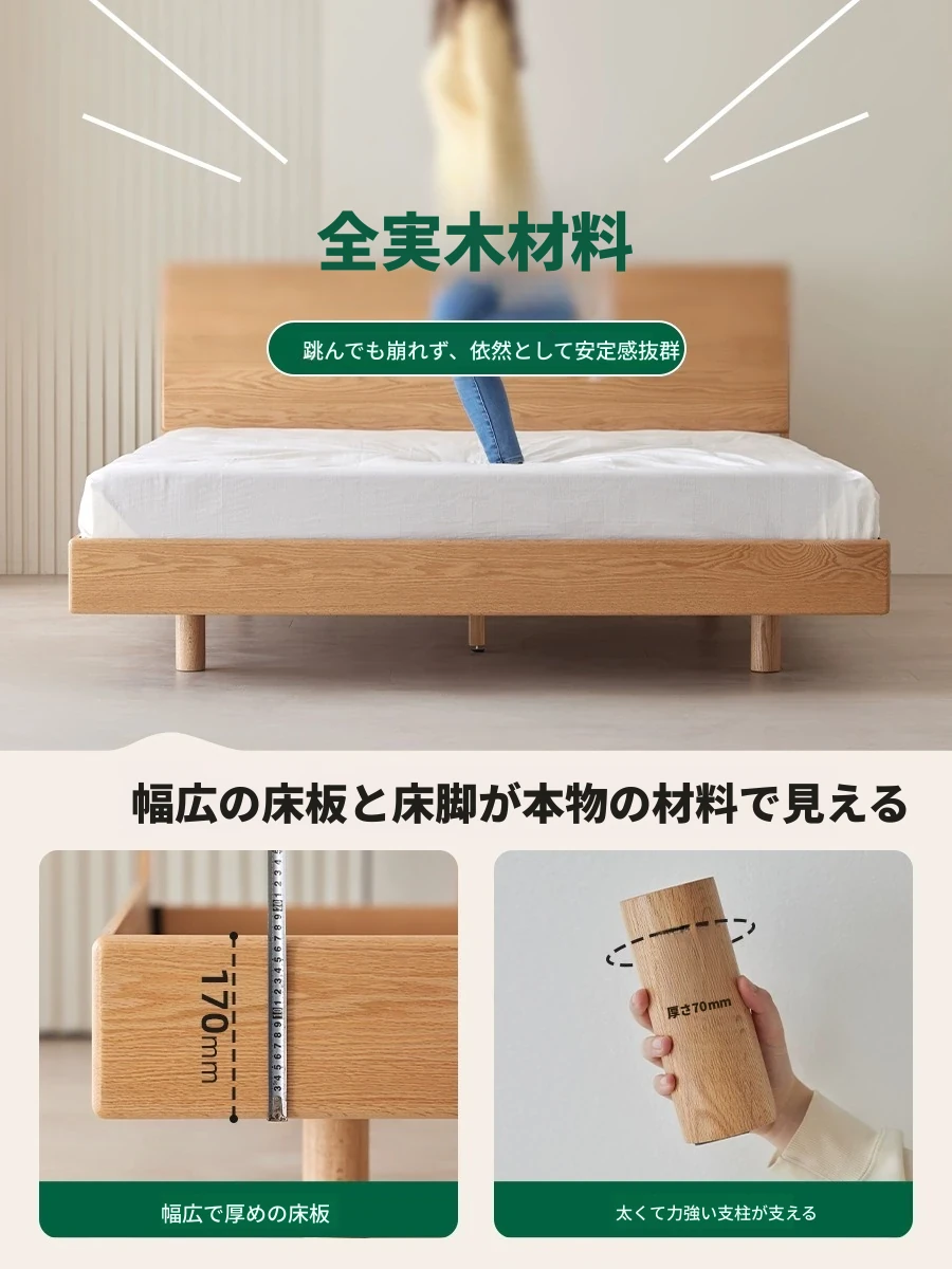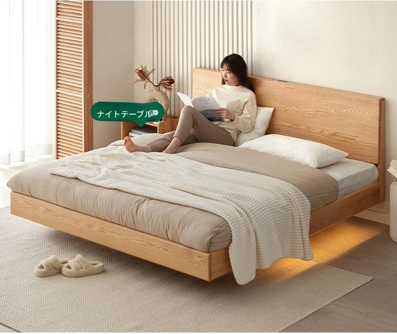 原始の天然素材を活かした全木製モダンミニマリストダブルベッド - オーク製浮遊感のあるデザイン、主寝室に最適な大きな板のベッド!シンプルで洗練された空間を演出します。