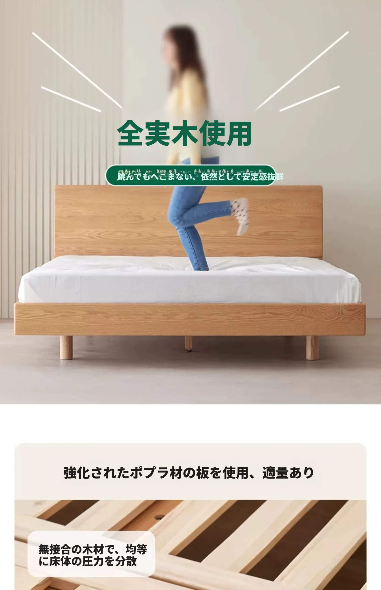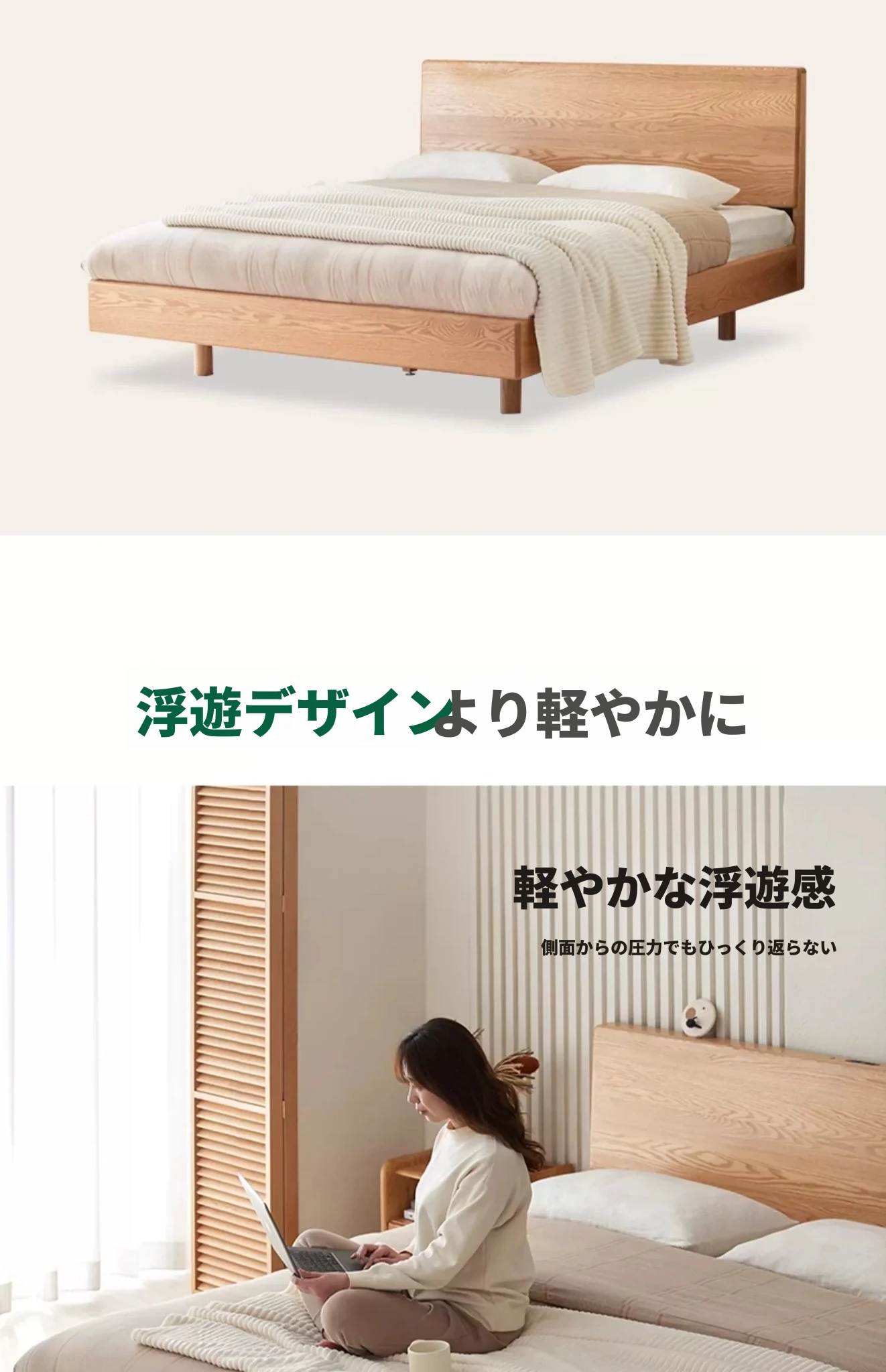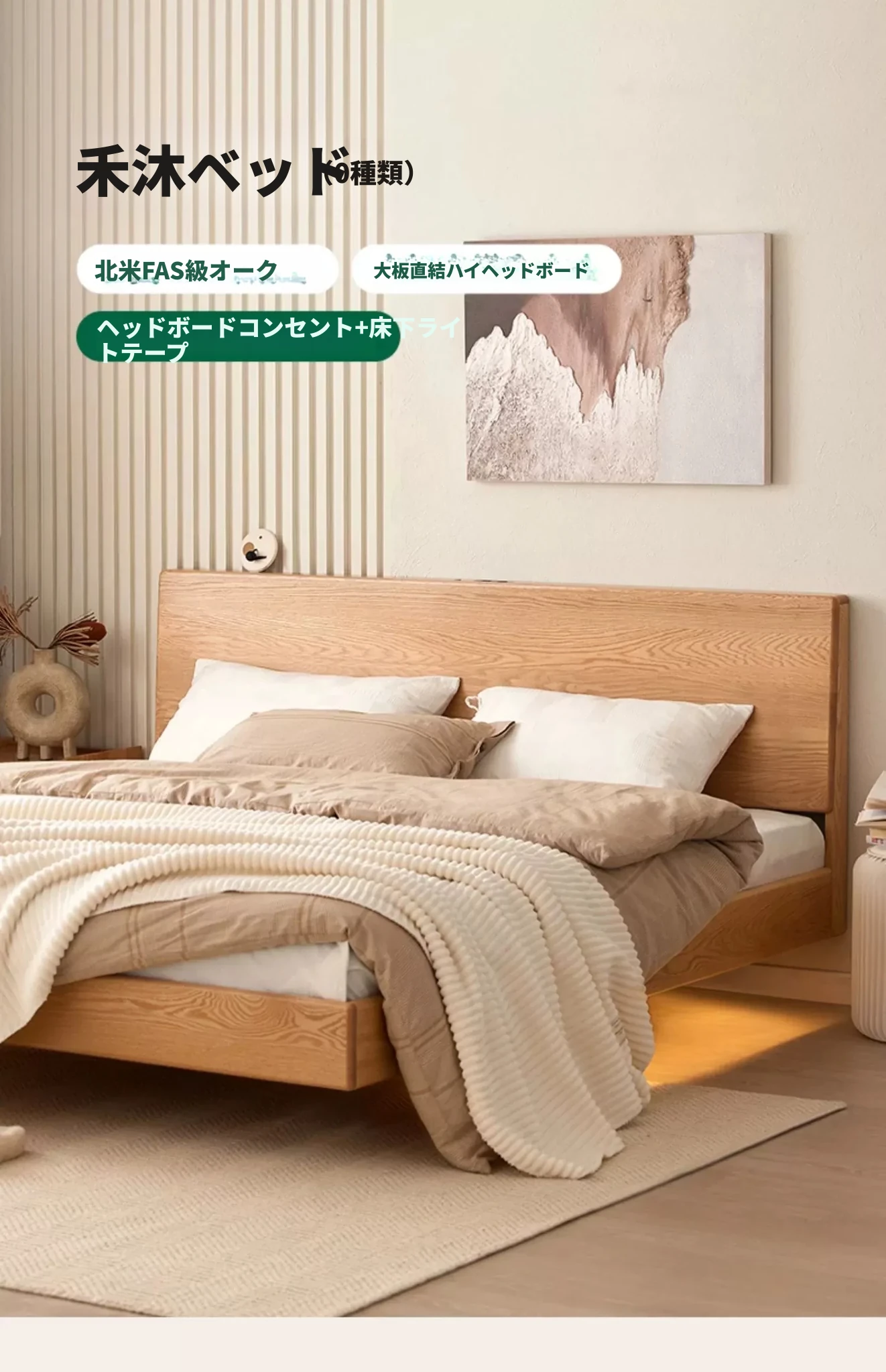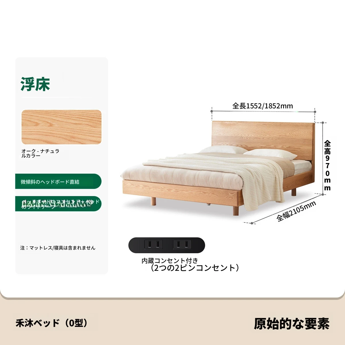 原始の天然素材を活かした全木製モダンミニマリストダブルベッド - オーク製浮遊感のあるデザイン、主寝室に最適な大きな板のベッド!シンプルで洗練された空間を演出します。