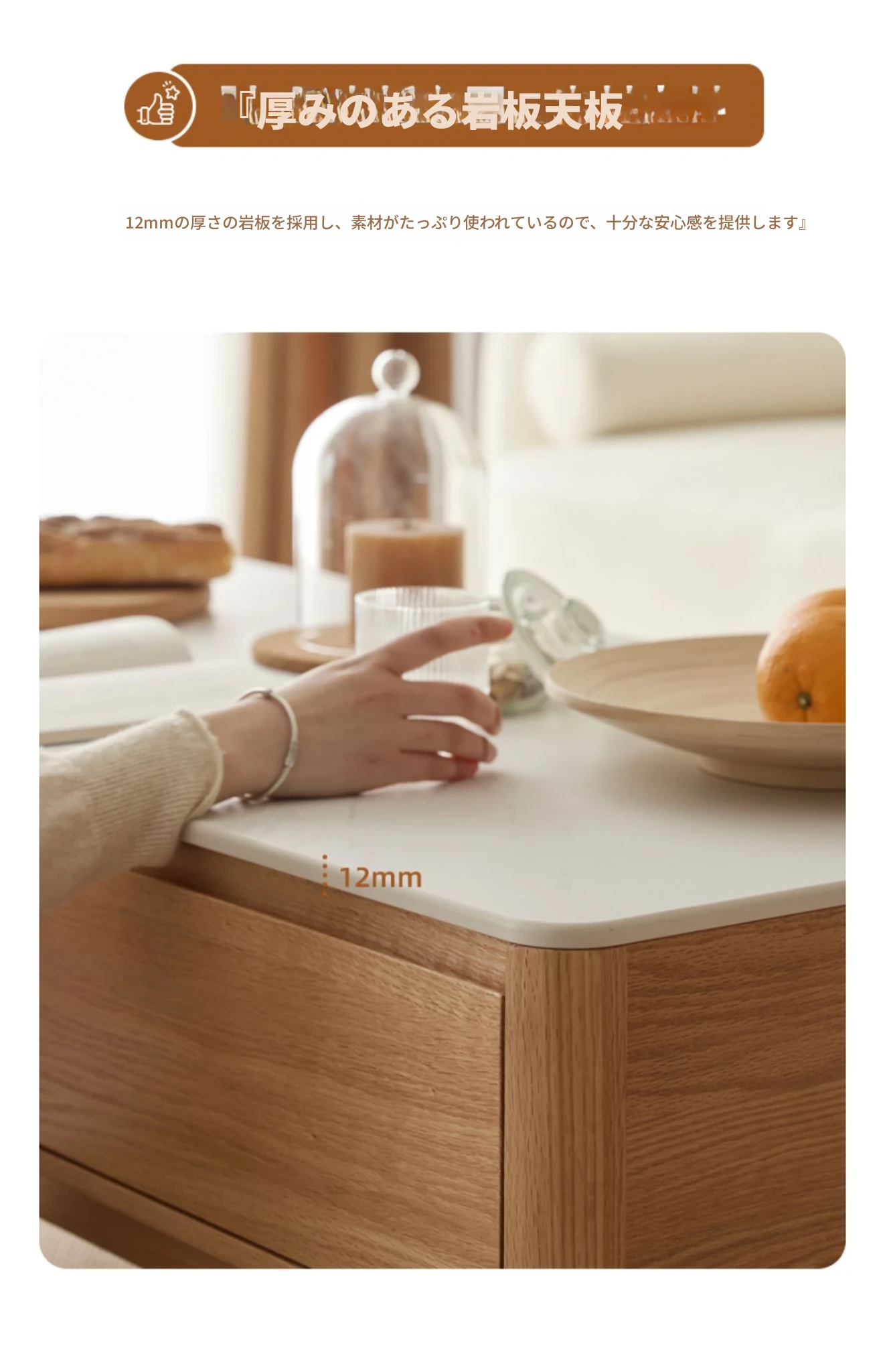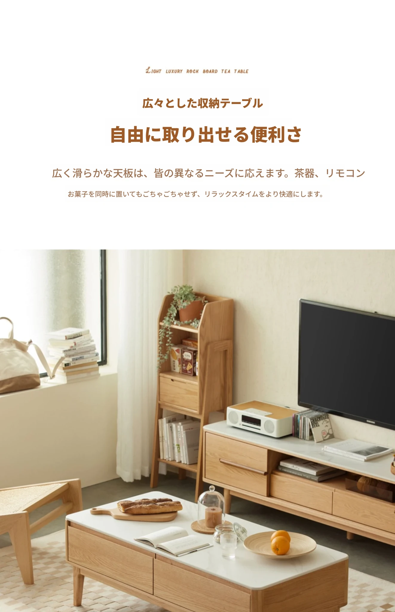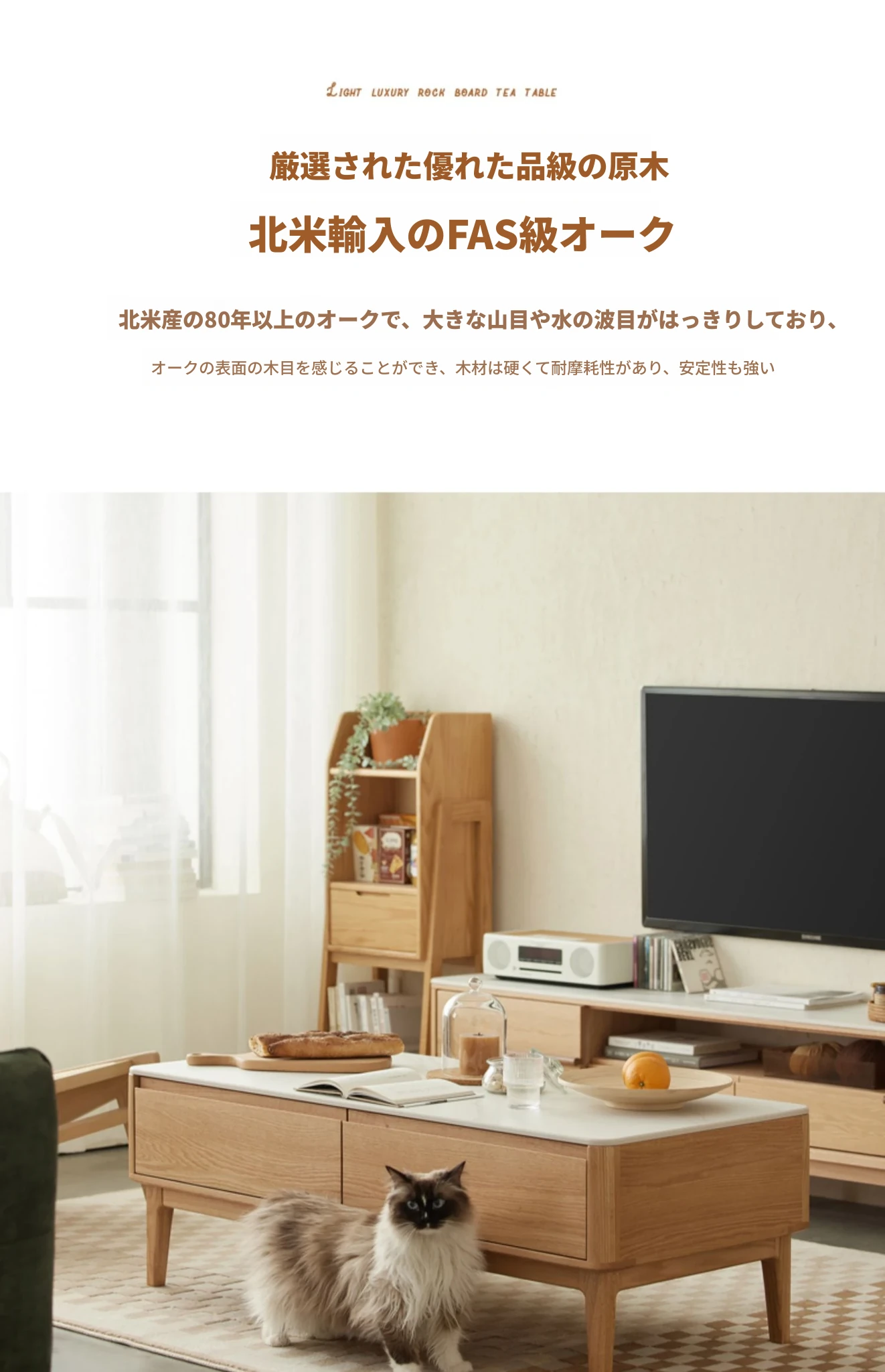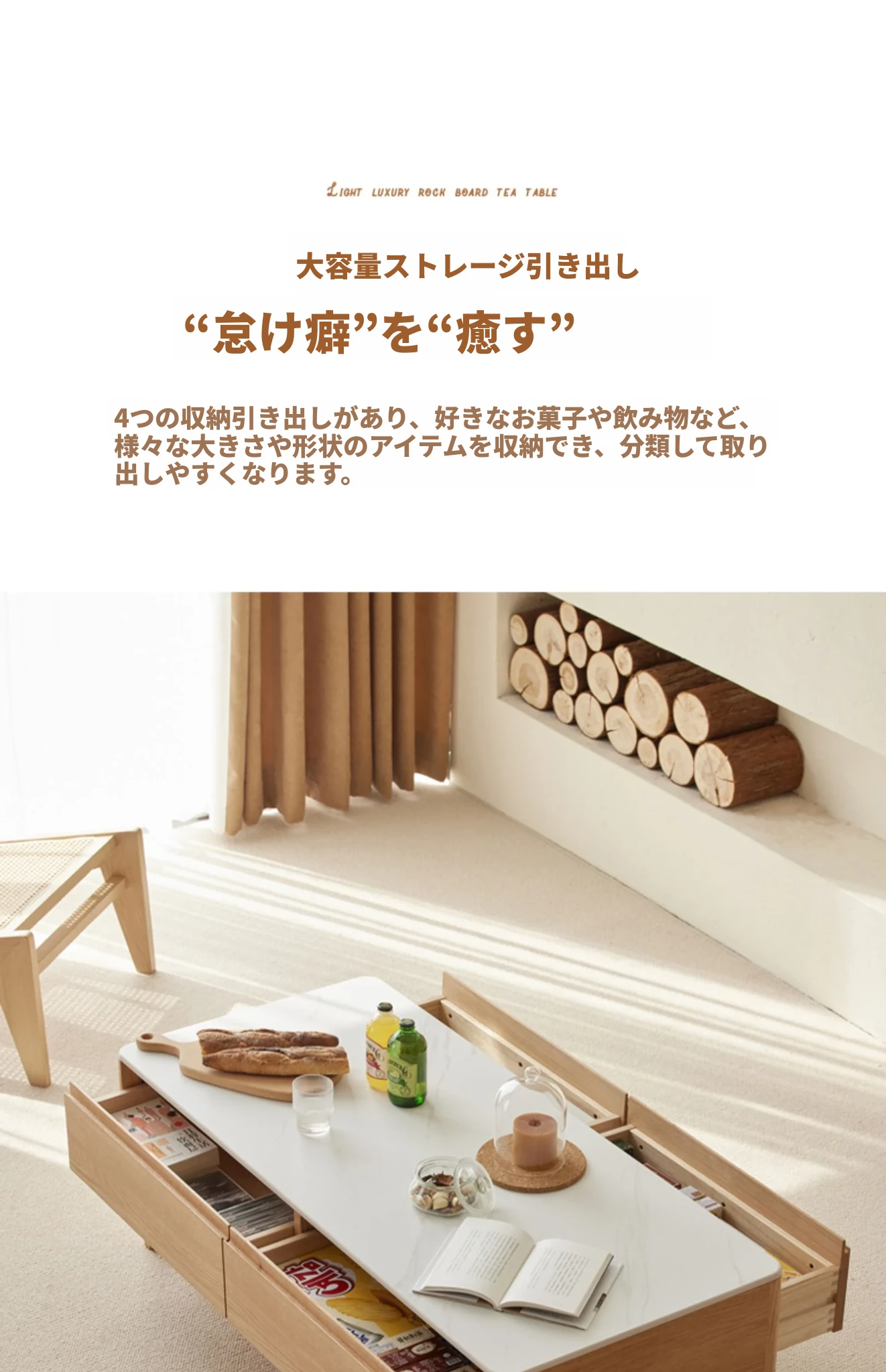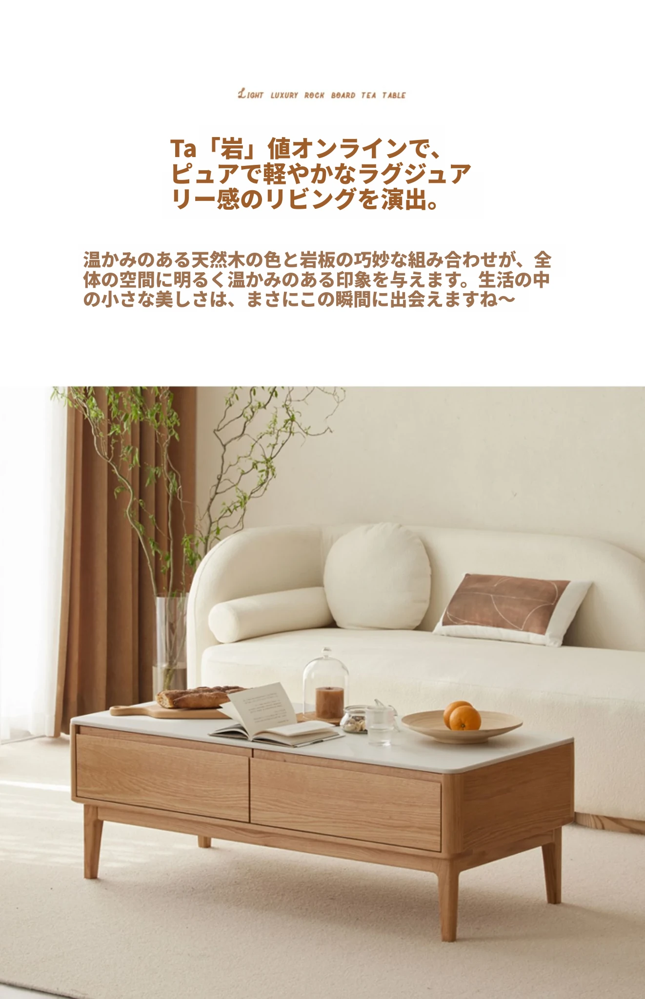 原木の魅力、モダンなデザインの小型リビングテーブル - 岩板仕様のオーク製茶卓、狭いスペースにも最適!家庭用にぴったりなスタイリッシュな茶台。