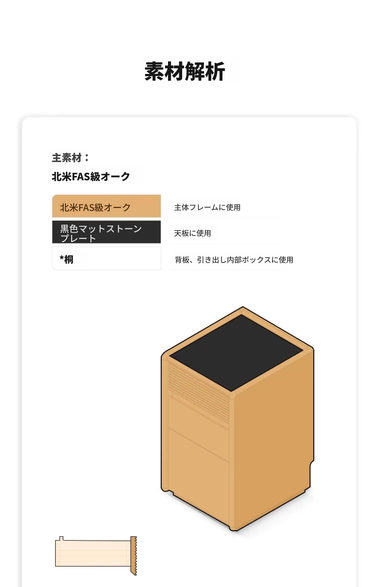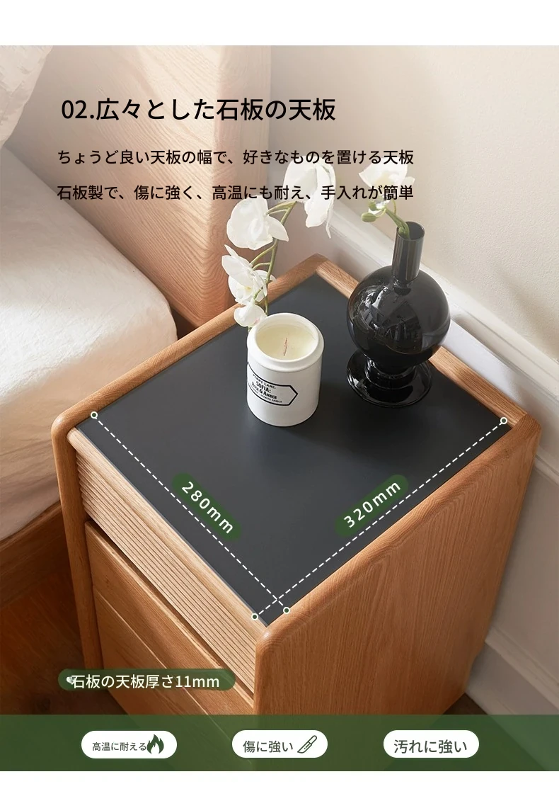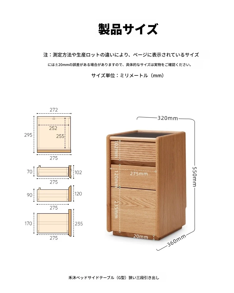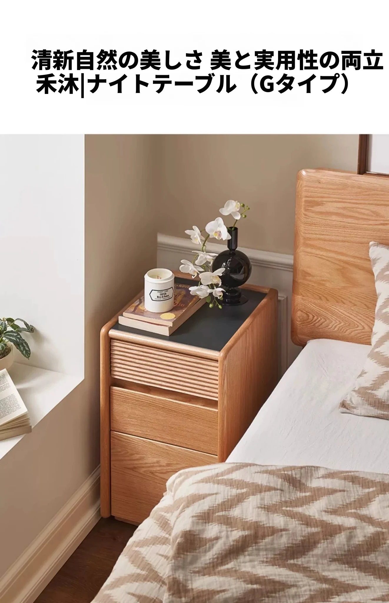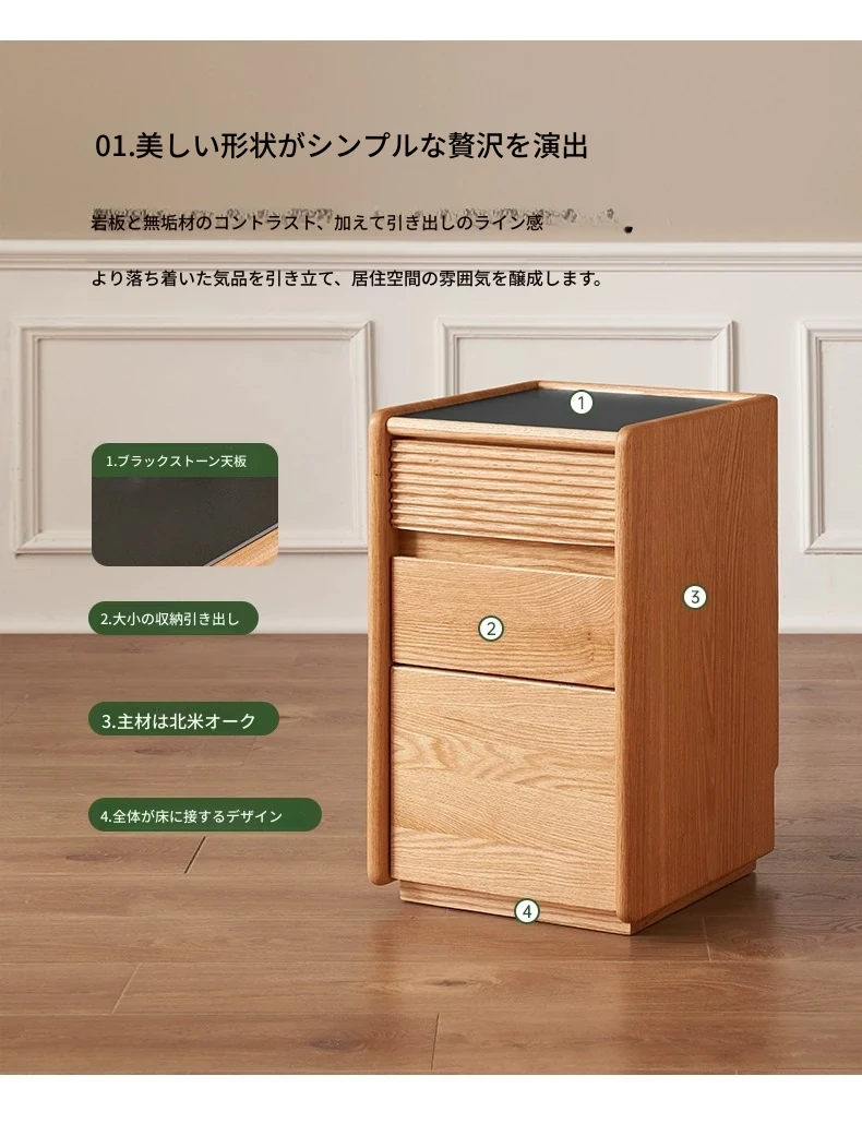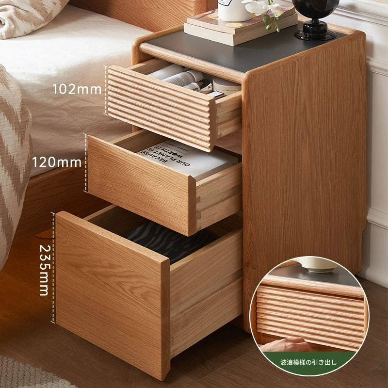 【オーク-ナチュラルカラー】禾沐ベッドサイドテーブル(G型)ナロー三段引き出し