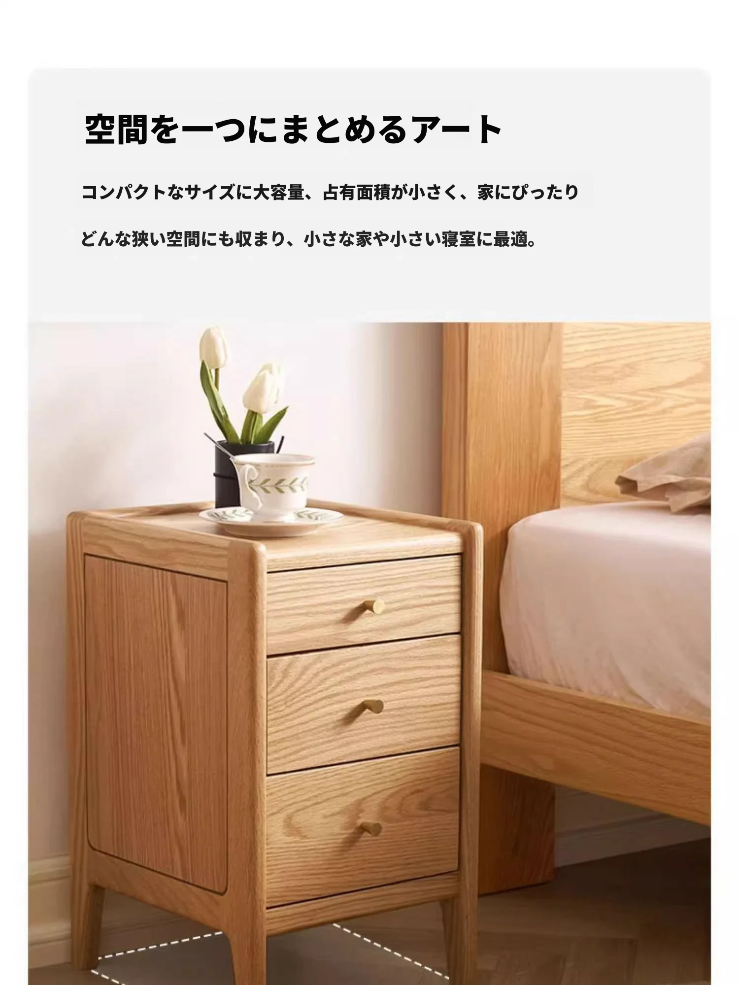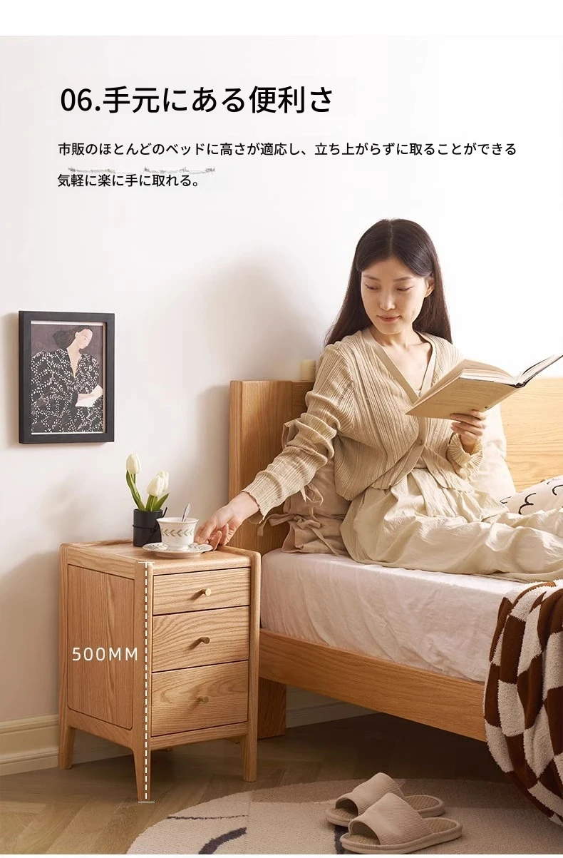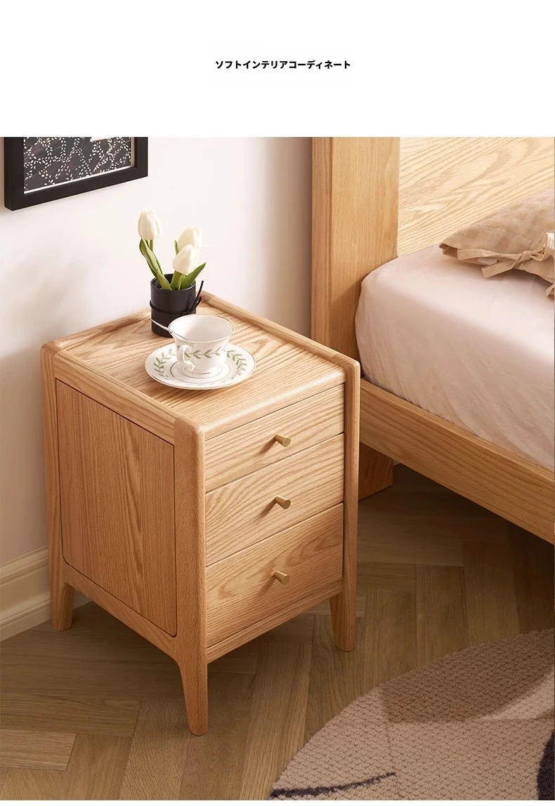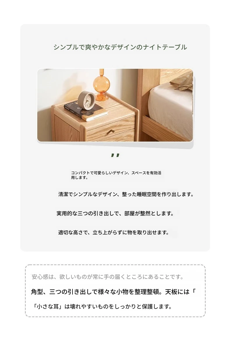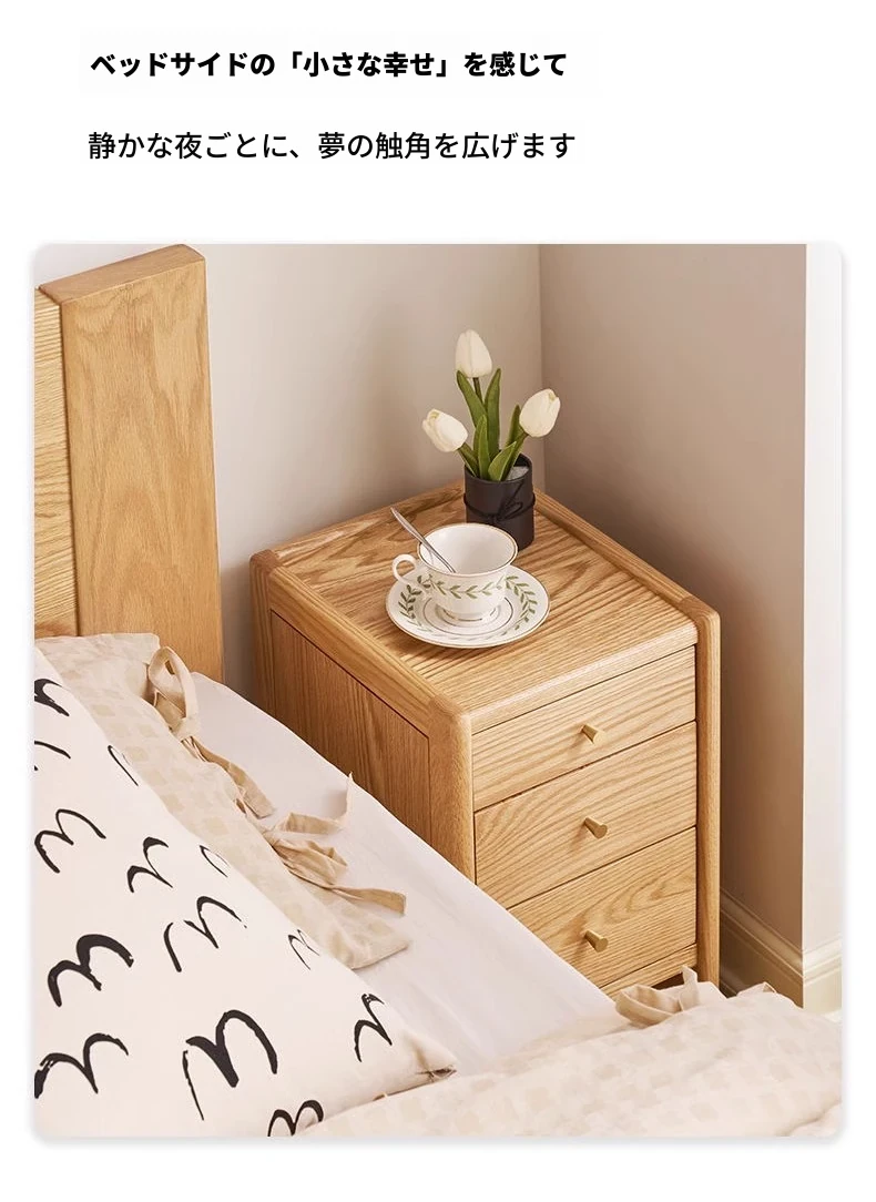オリジナルエレメント無垢材ベッドサイドテーブル | スリムデザインのモダンナチュラル | オーク製収納引き出し3段 | スペースを有効活用!シンプルで洗練された寝室にぴったりのアイテムです。