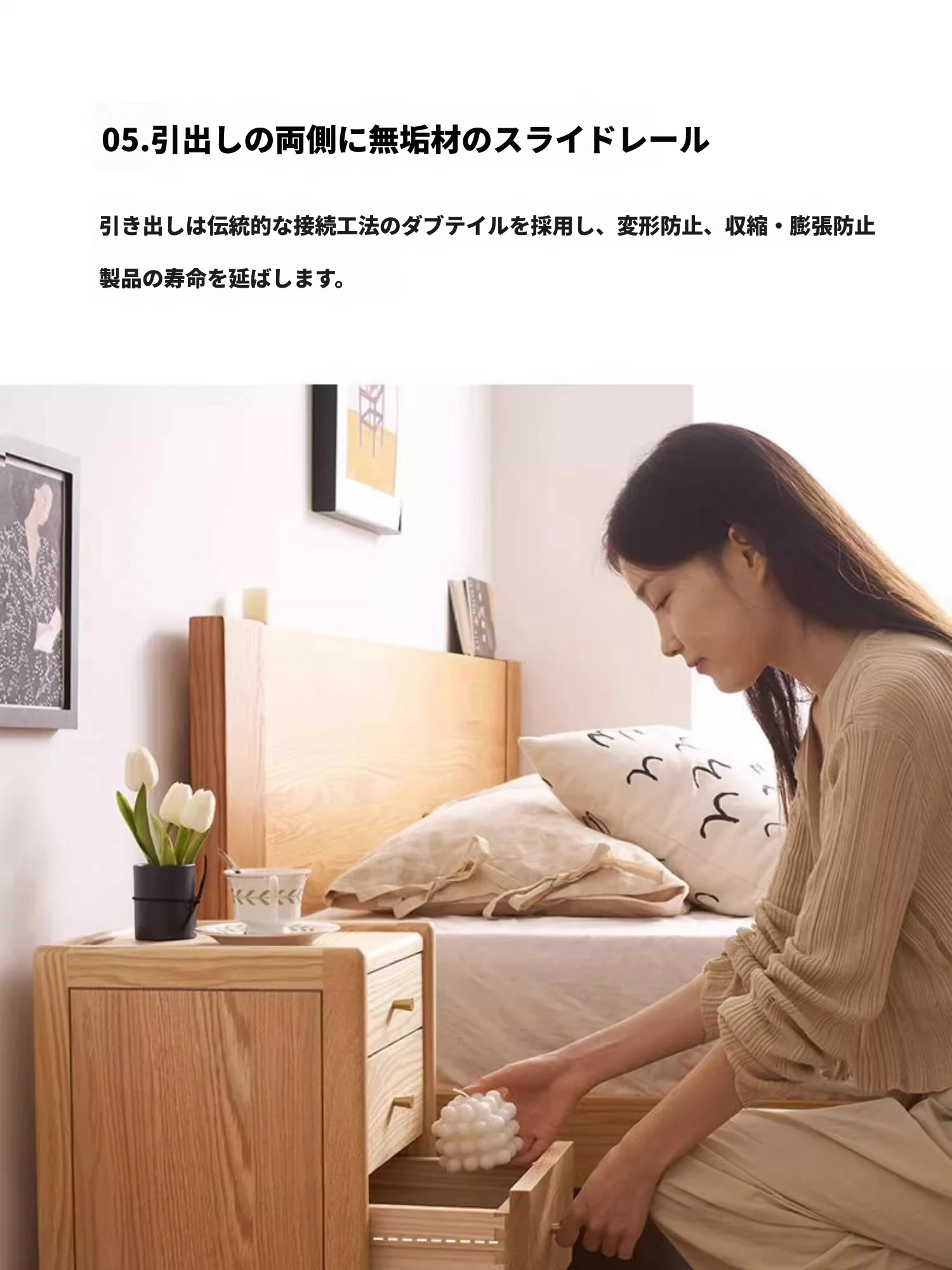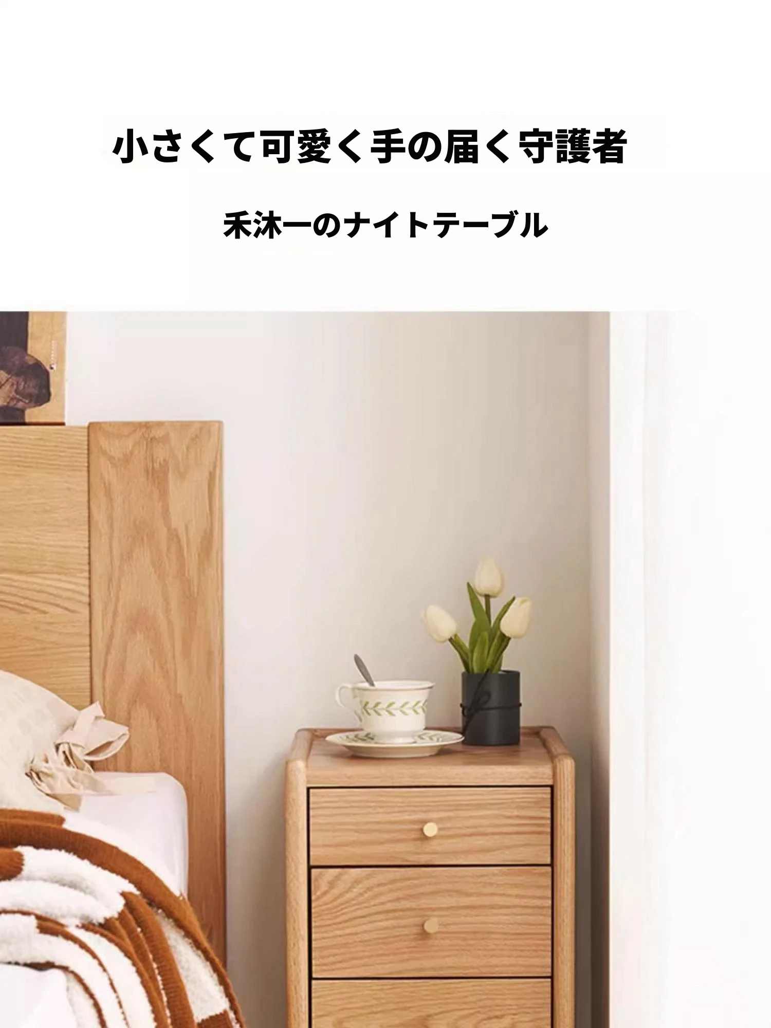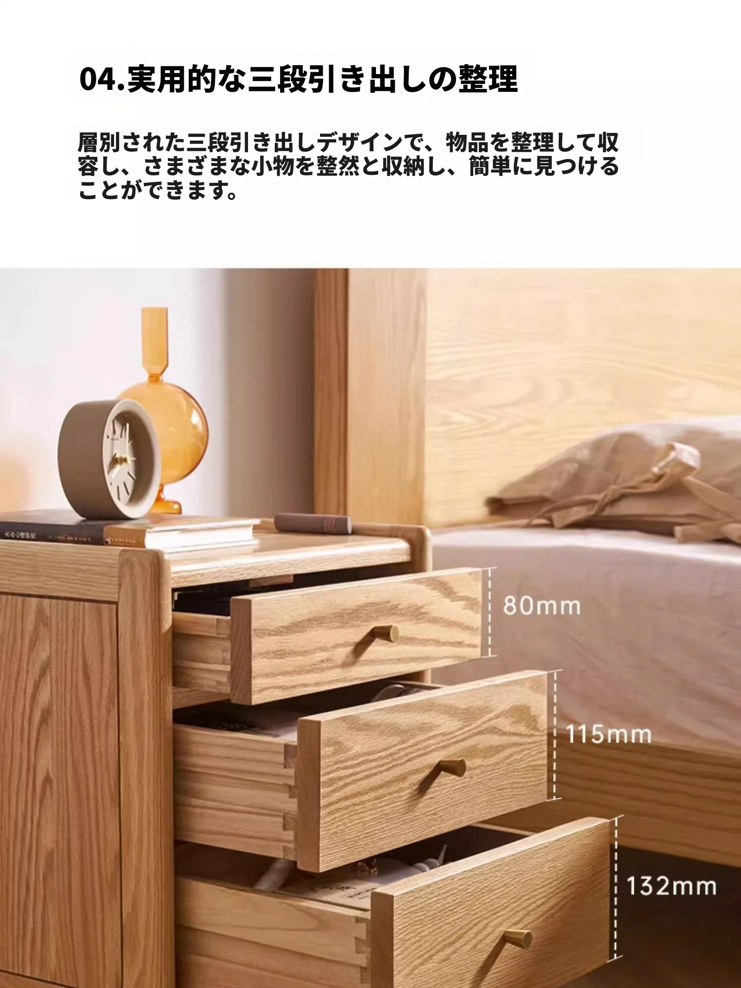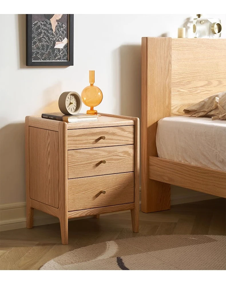 オリジナルエレメント無垢材ベッドサイドテーブル | スリムデザインのモダンナチュラル | オーク製収納引き出し3段 | スペースを有効活用!シンプルで洗練された寝室にぴったりのアイテムです。