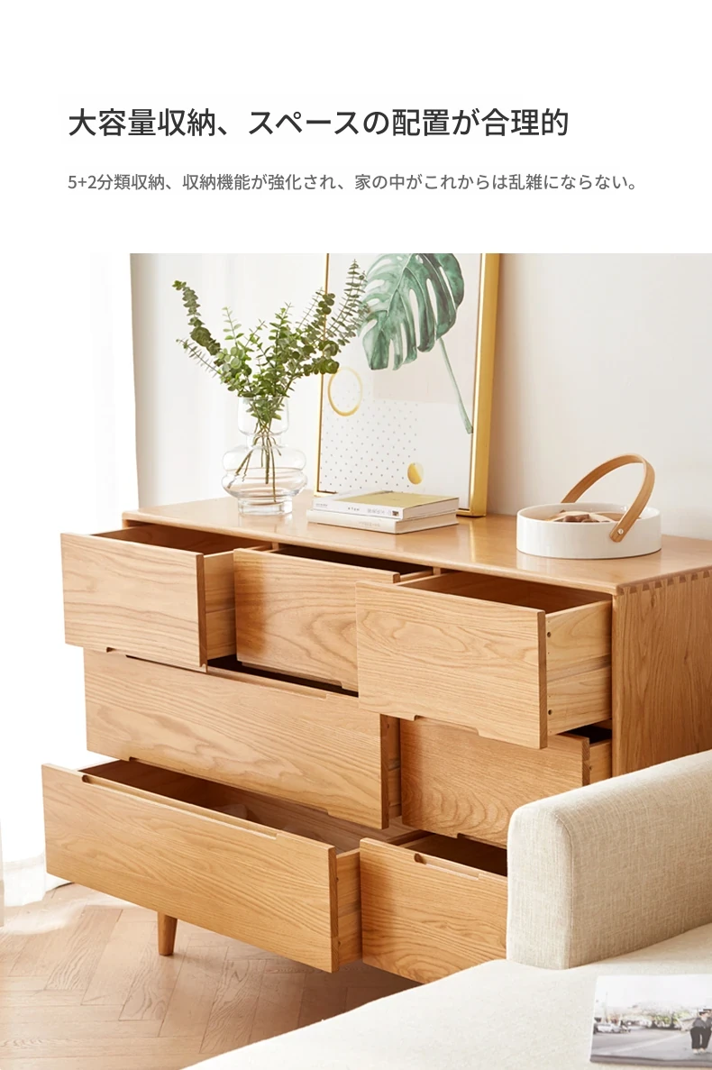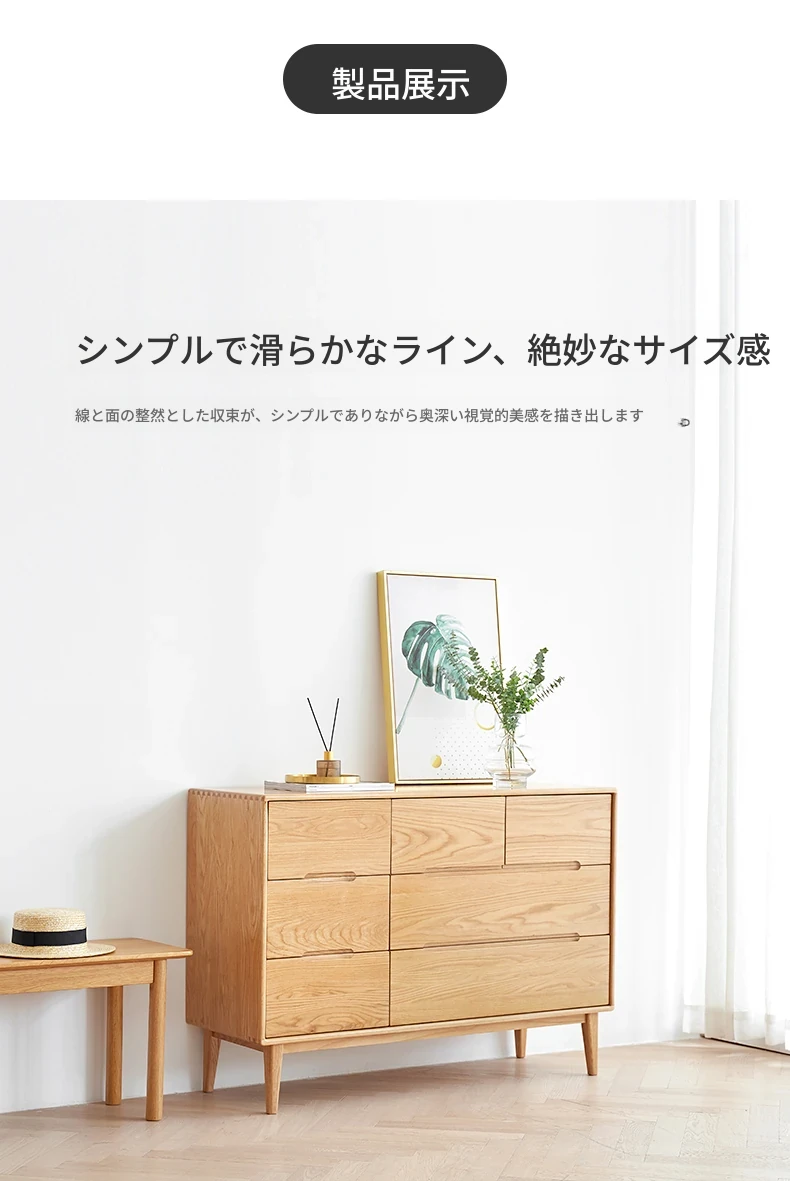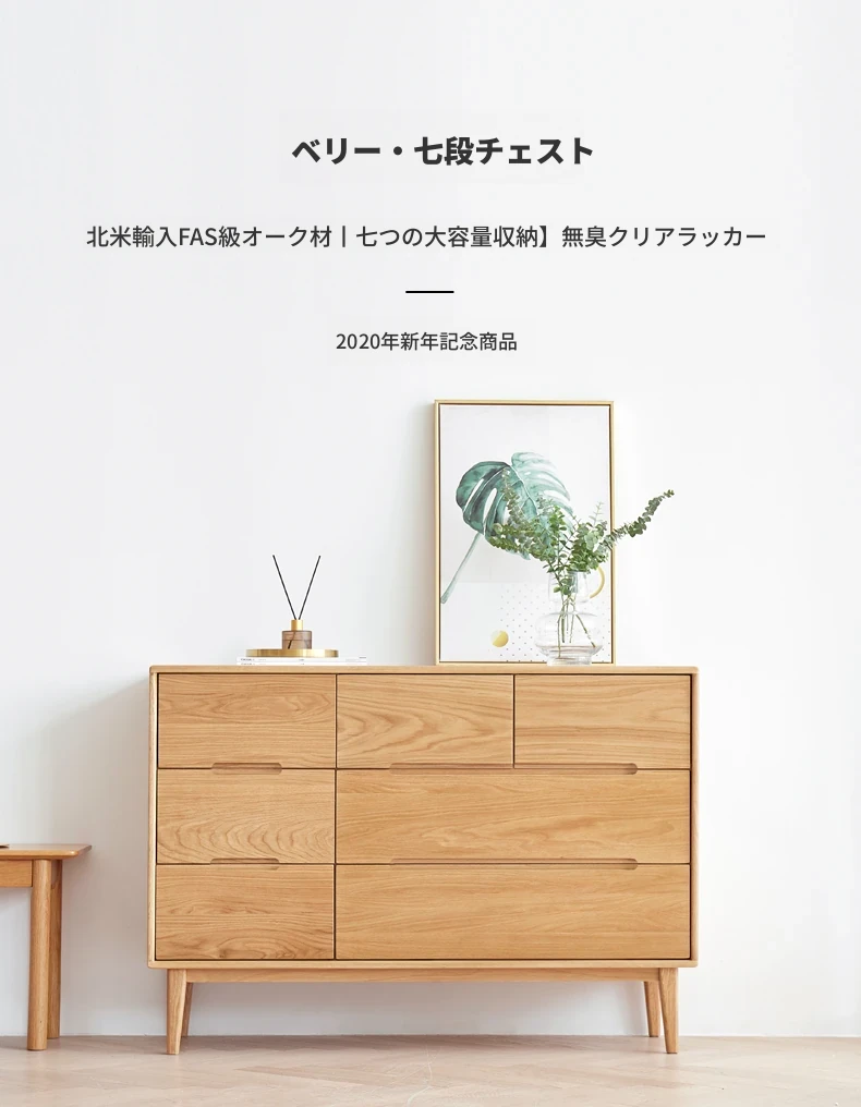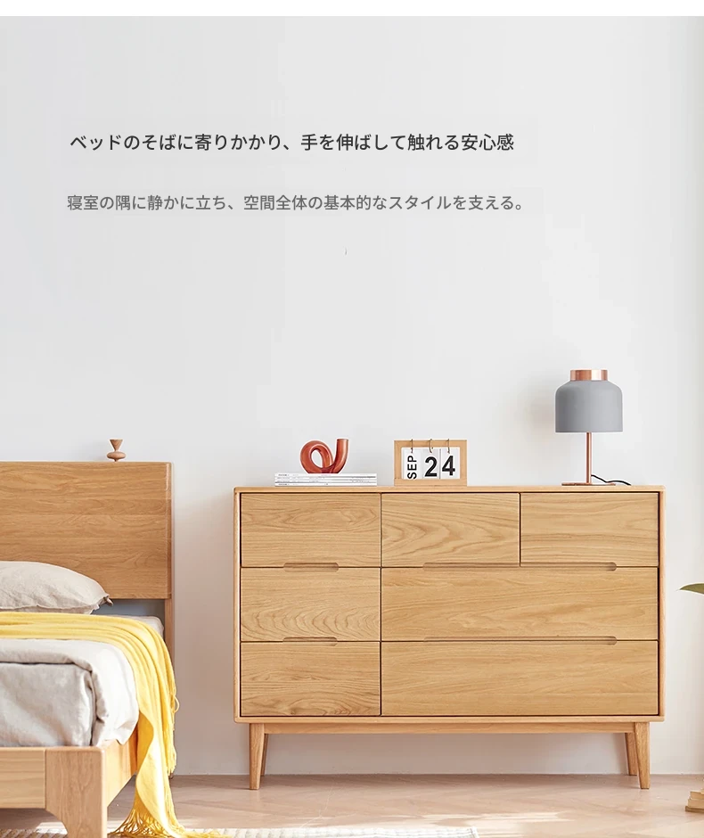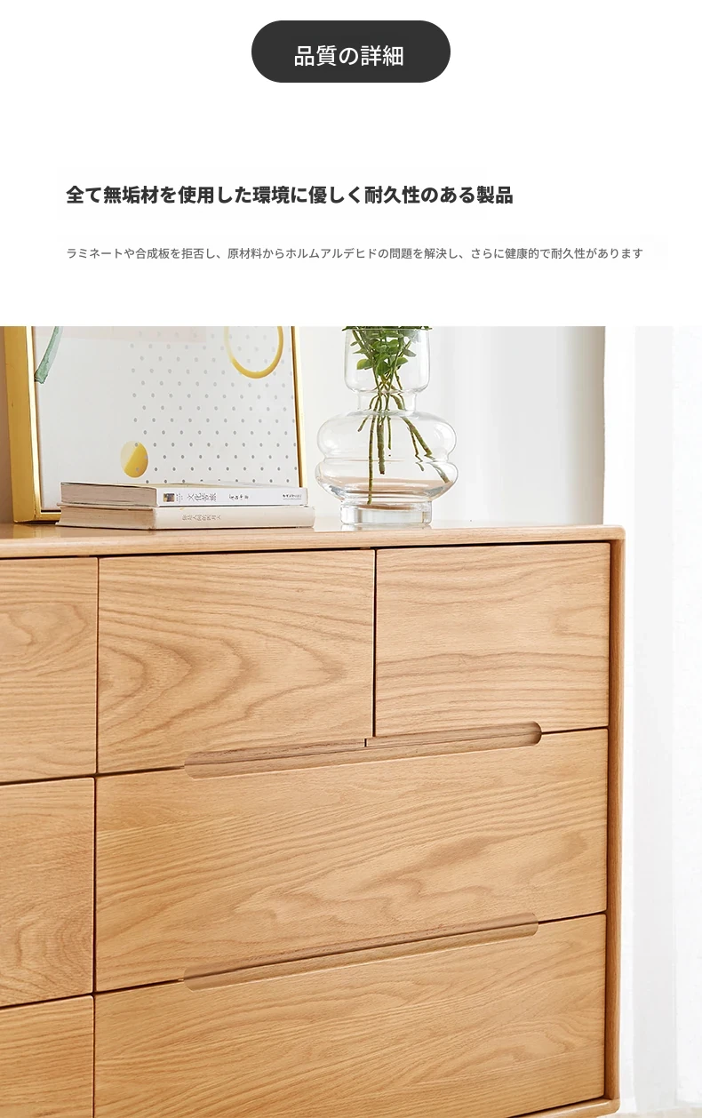 原材料にこだわった全てが無垢材のモダンシンプルな七段チェスト。高品質の北欧オーク材を使用し、寝室を美しく彩る収納力抜群の収納家具。あなたの暮らしを豊かにする一品です!