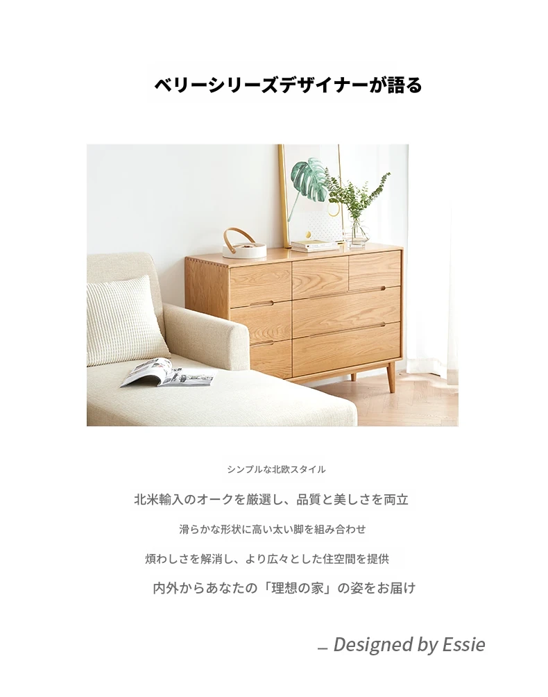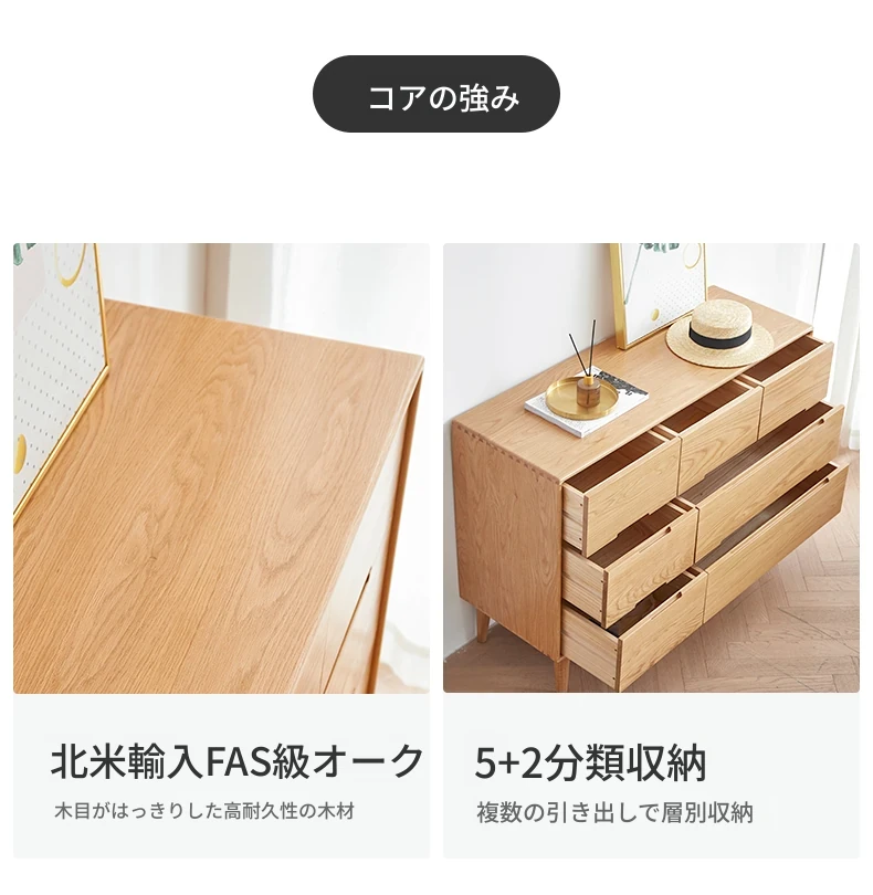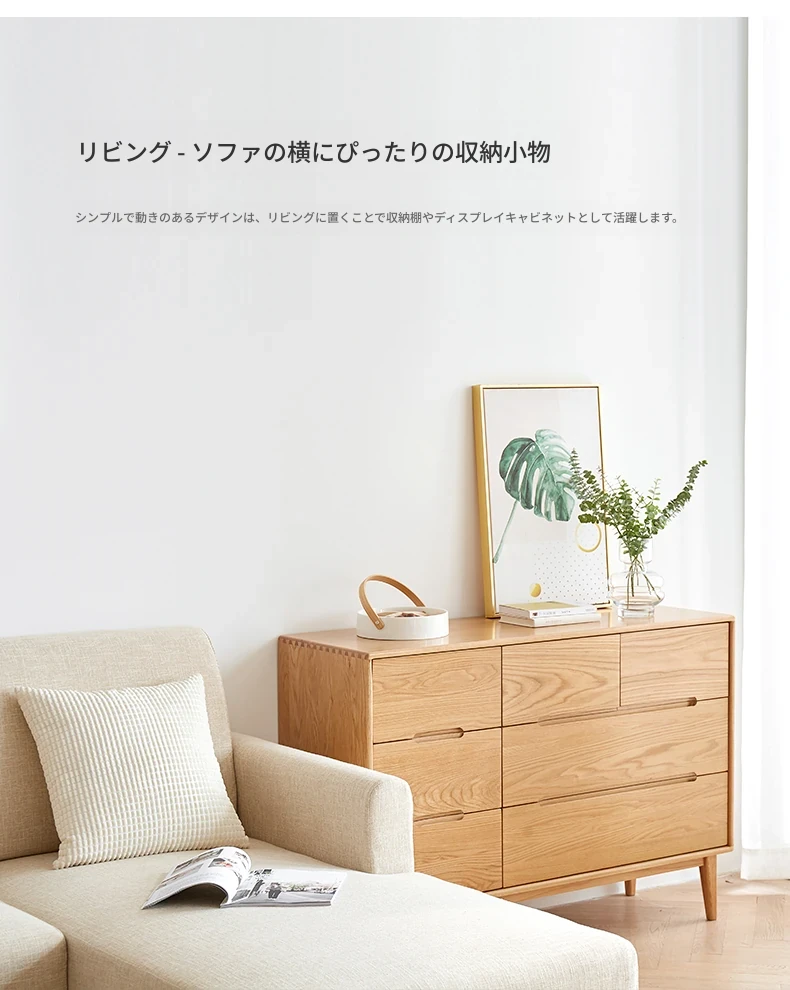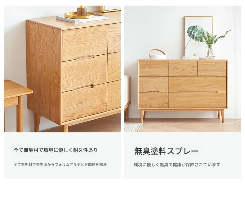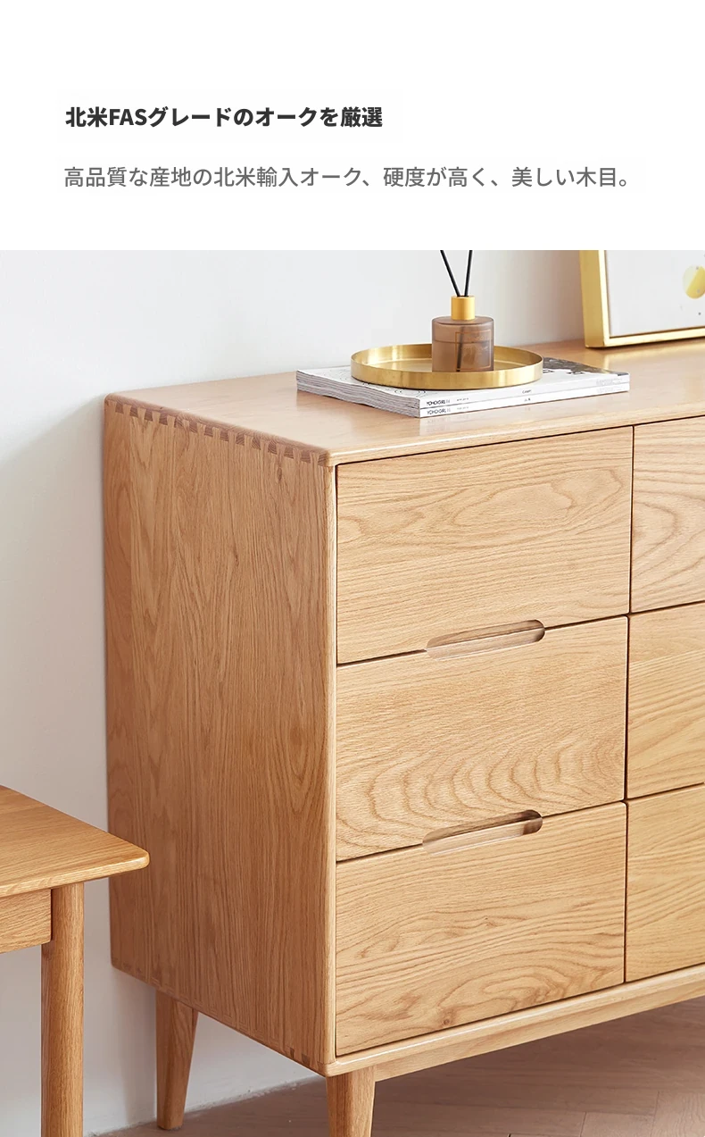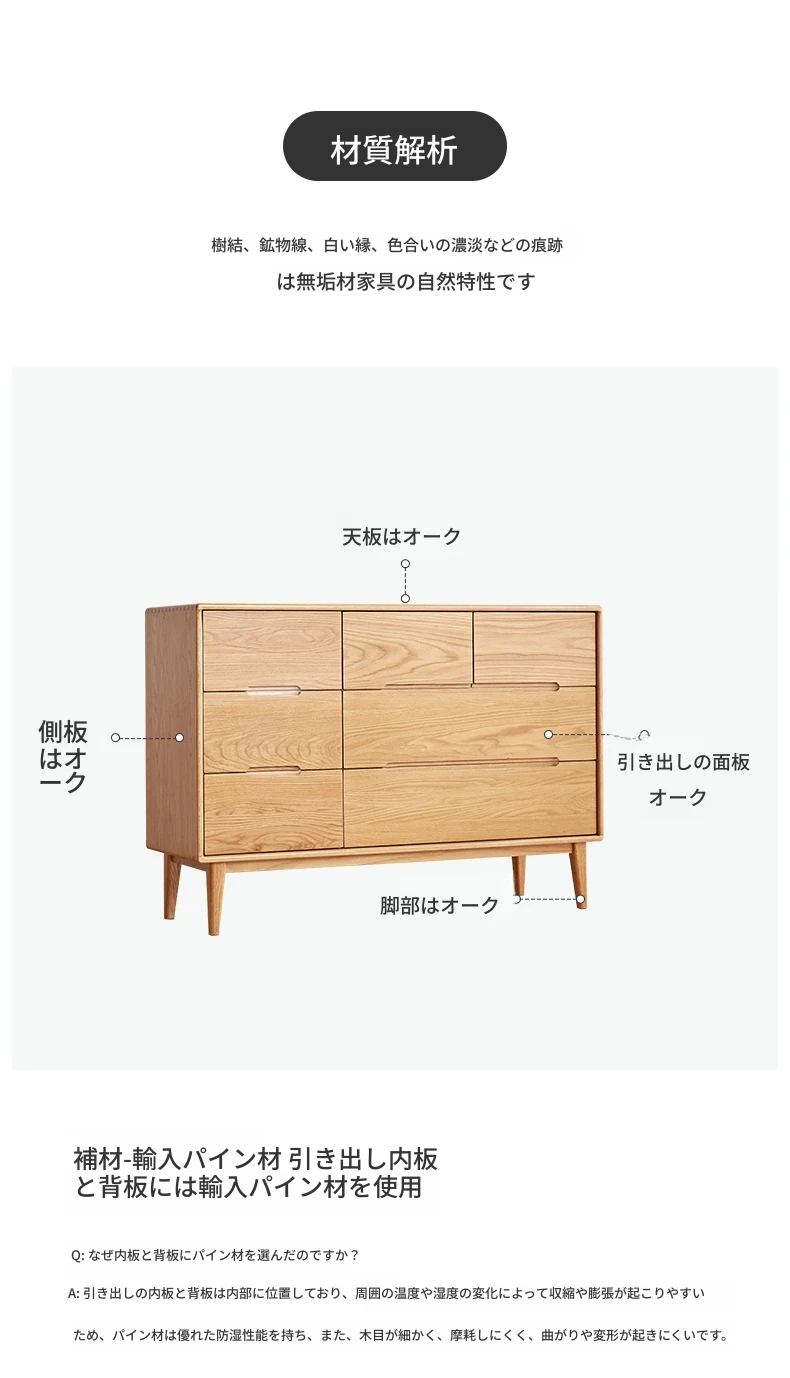 原材料にこだわった全てが無垢材のモダンシンプルな七段チェスト。高品質の北欧オーク材を使用し、寝室を美しく彩る収納力抜群の収納家具。あなたの暮らしを豊かにする一品です!