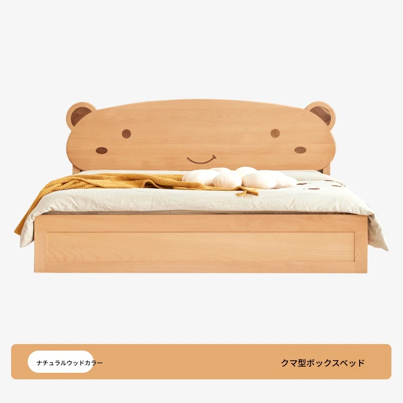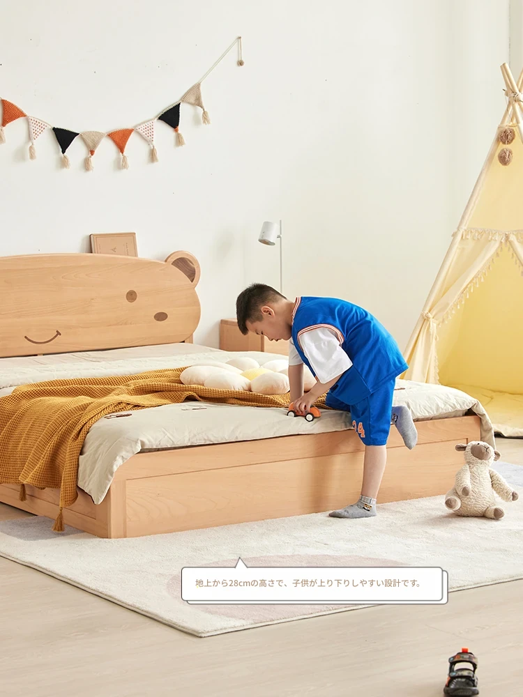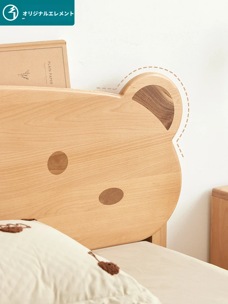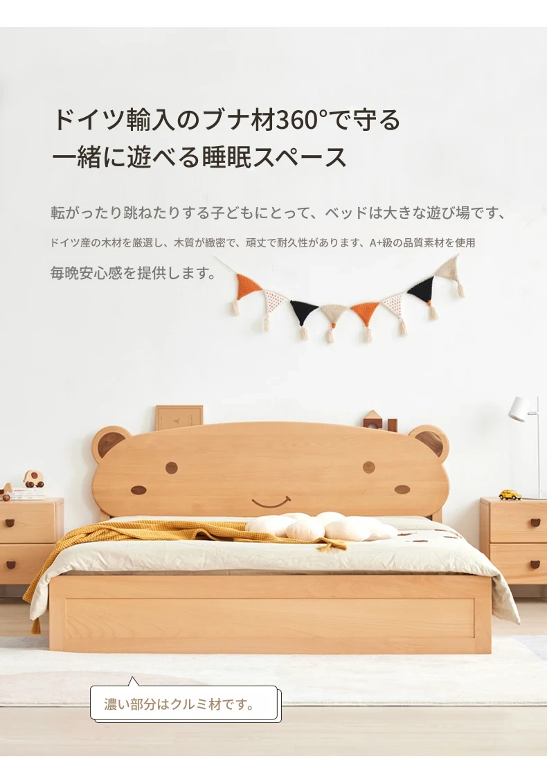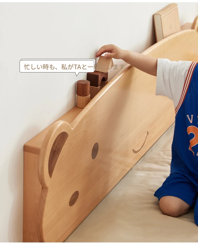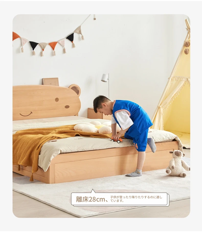 原始原素の無垢材子供用ベッド|モダンでシンプルなデザイン|収納力抜群のハイタイプ|可愛いクマのキャラクター付き|おしゃれで快適な一人用ベッド|子供部屋にぴったり!