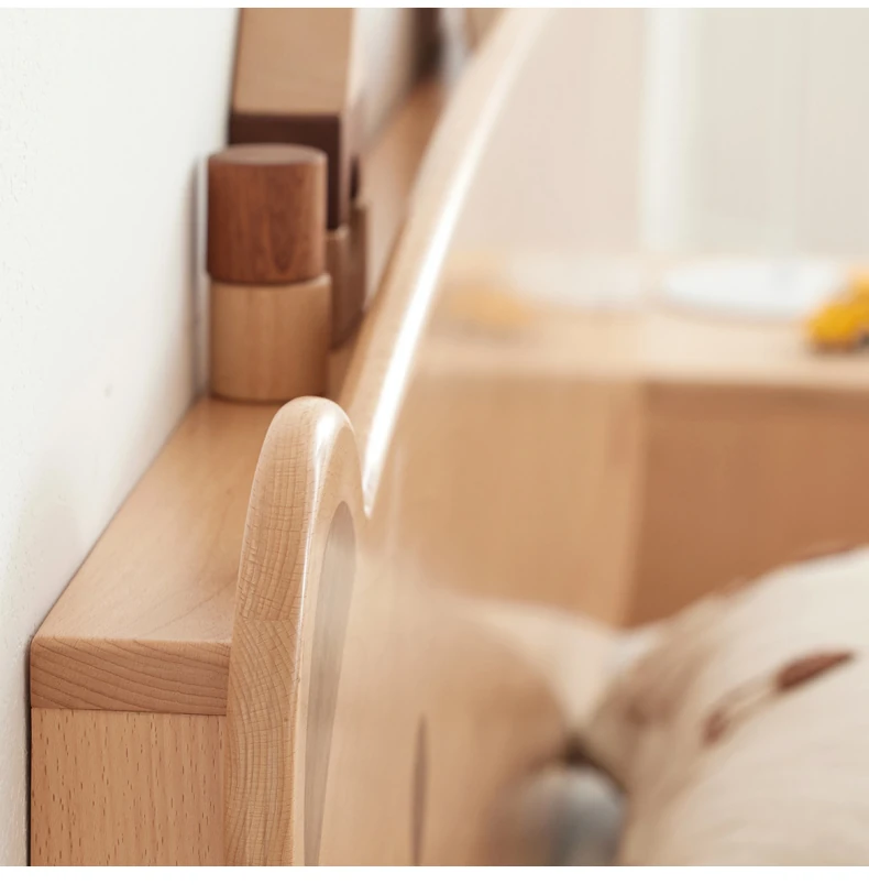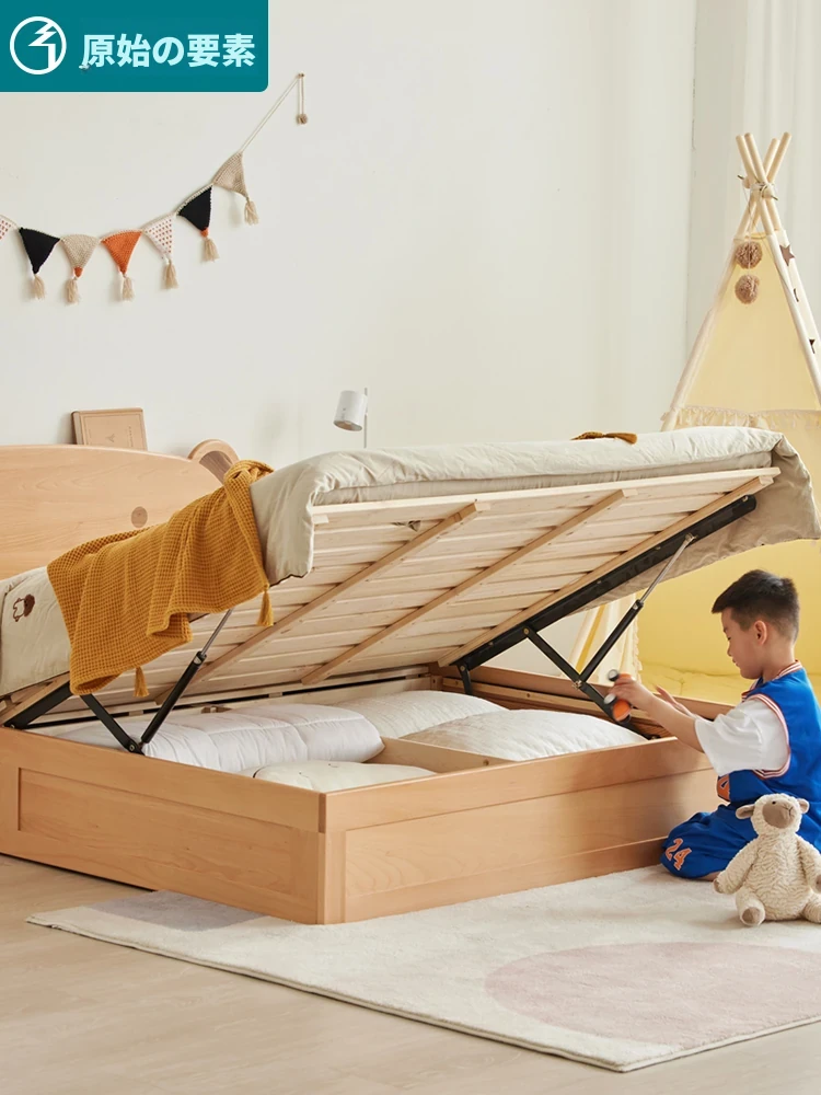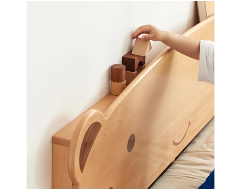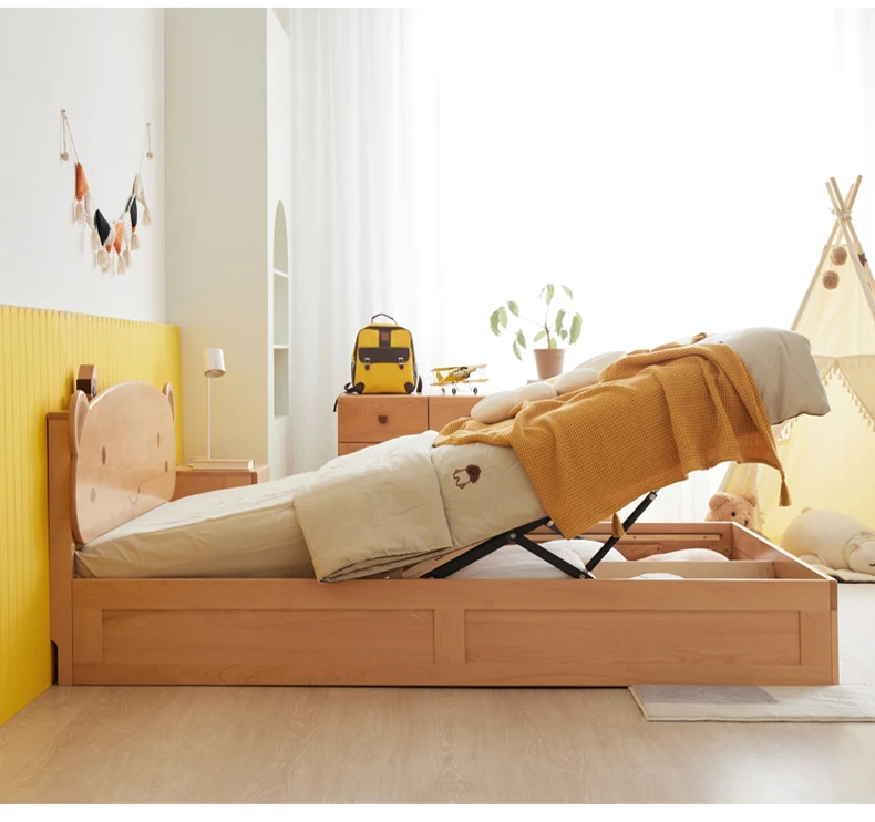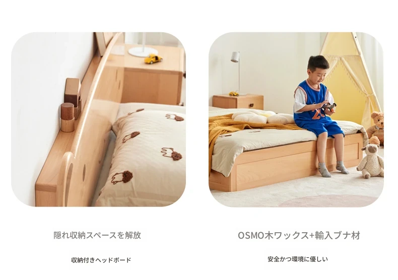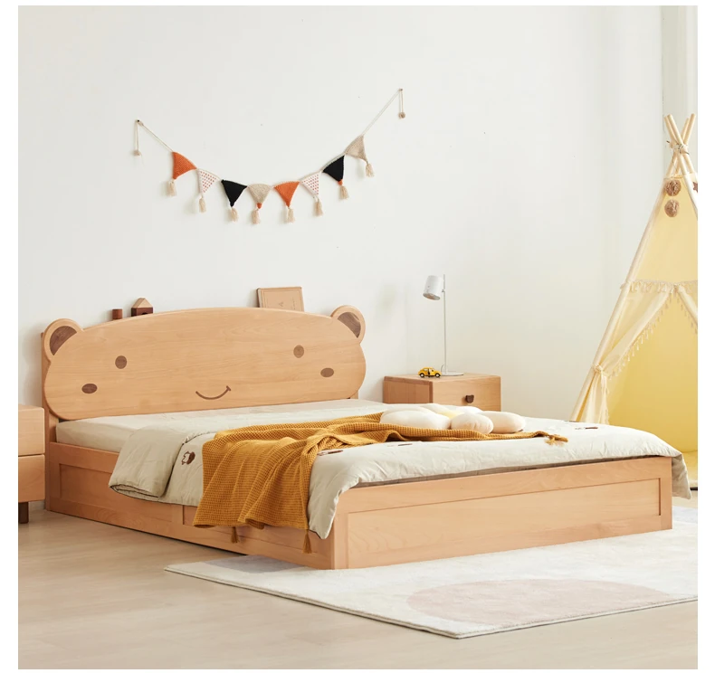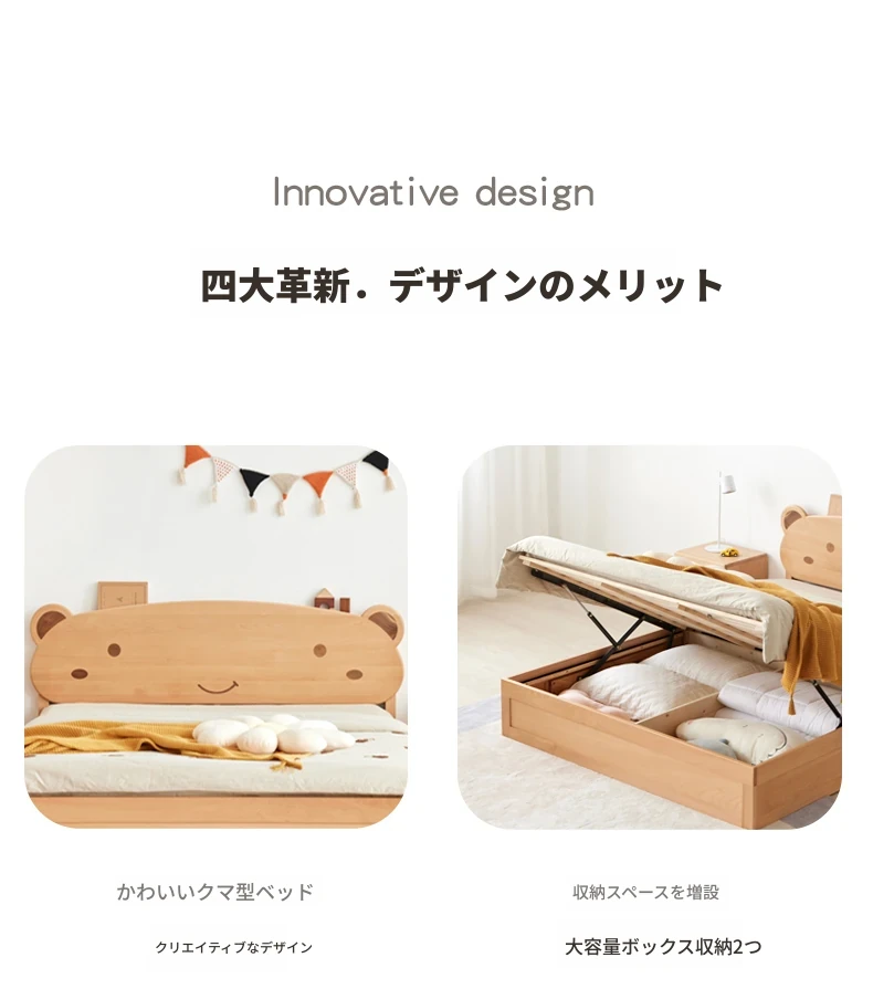 原始原素の無垢材子供用ベッド|モダンでシンプルなデザイン|収納力抜群のハイタイプ|可愛いクマのキャラクター付き|おしゃれで快適な一人用ベッド|子供部屋にぴったり!