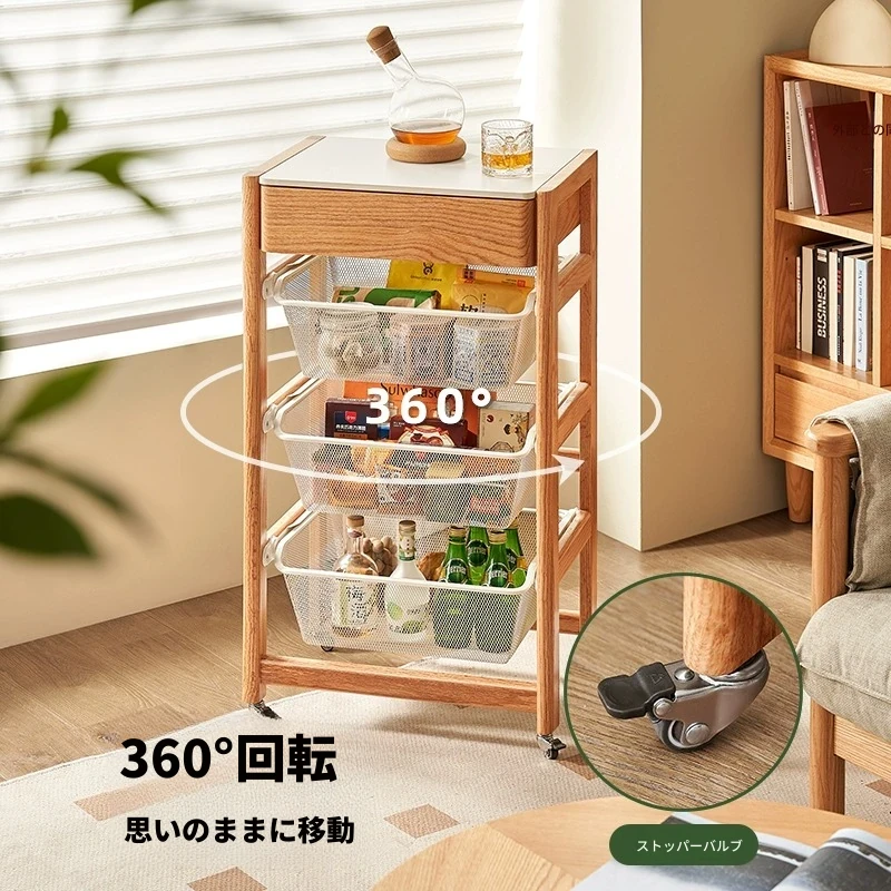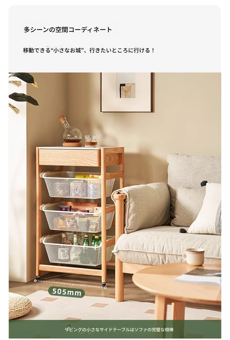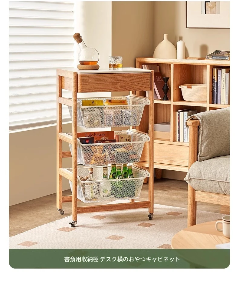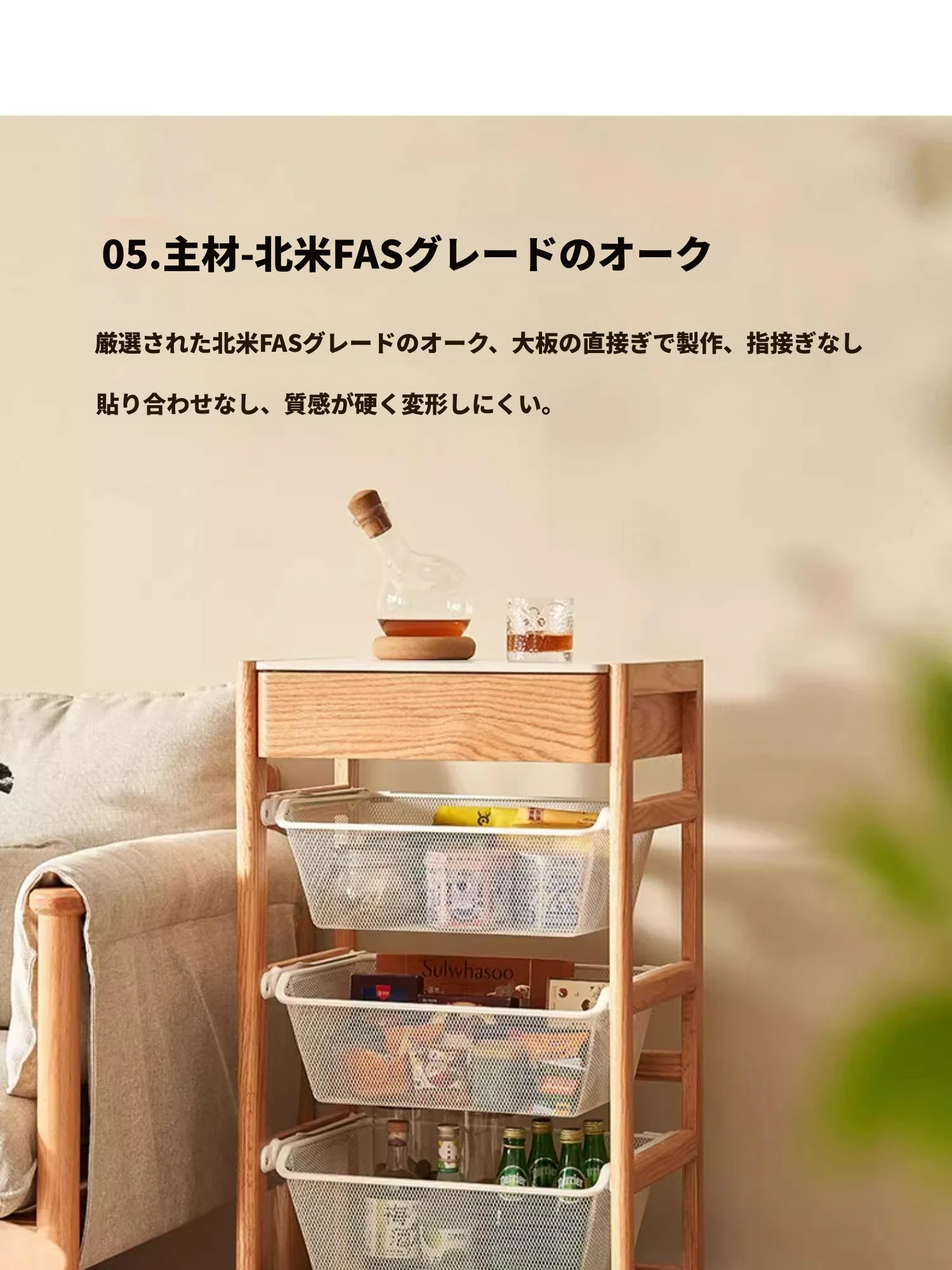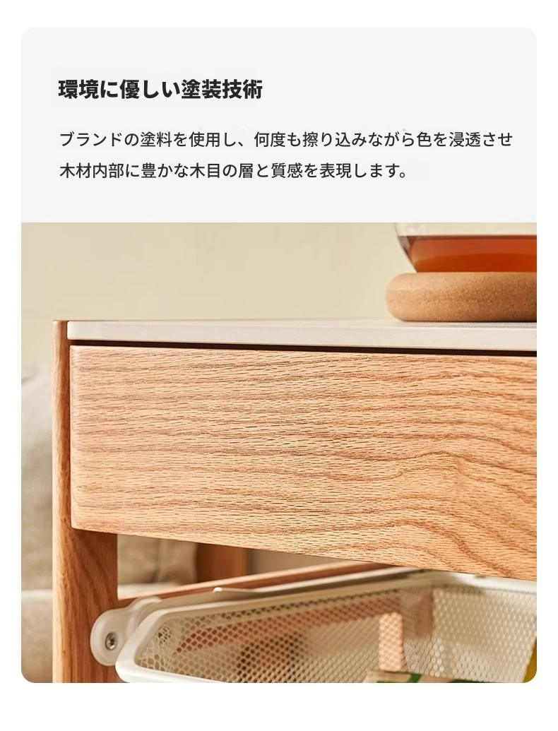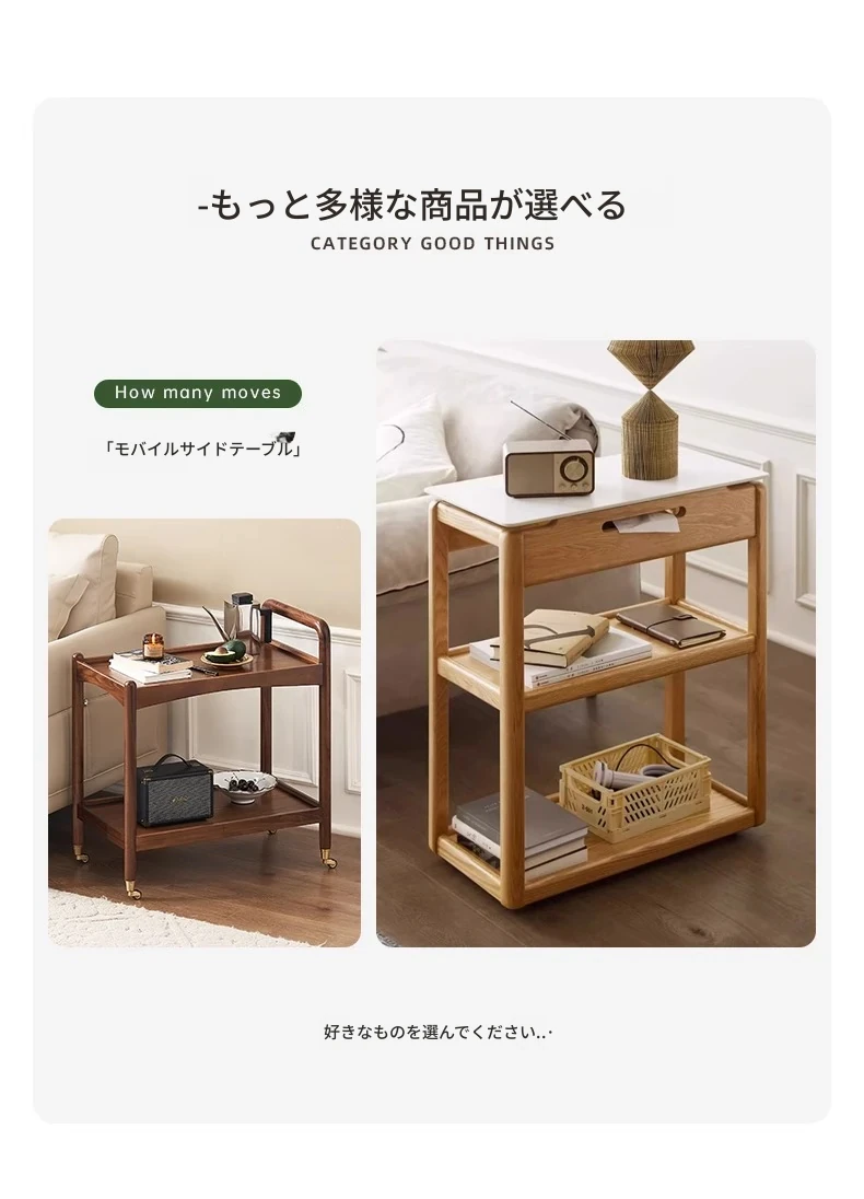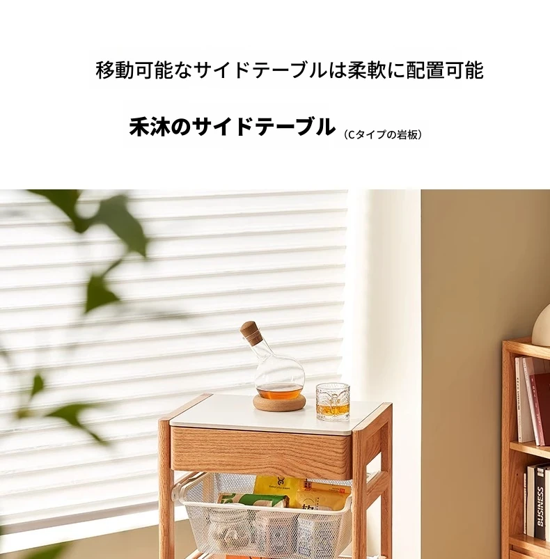 オーガニック無垢材のモバイルサイドテーブル - オークの岩板デザイン、収納力抜群のお菓子棚&置き場、便利な小型キャリーソファサイドテーブル!シンプル&スタイリッシュなインテリアにぴったりです。