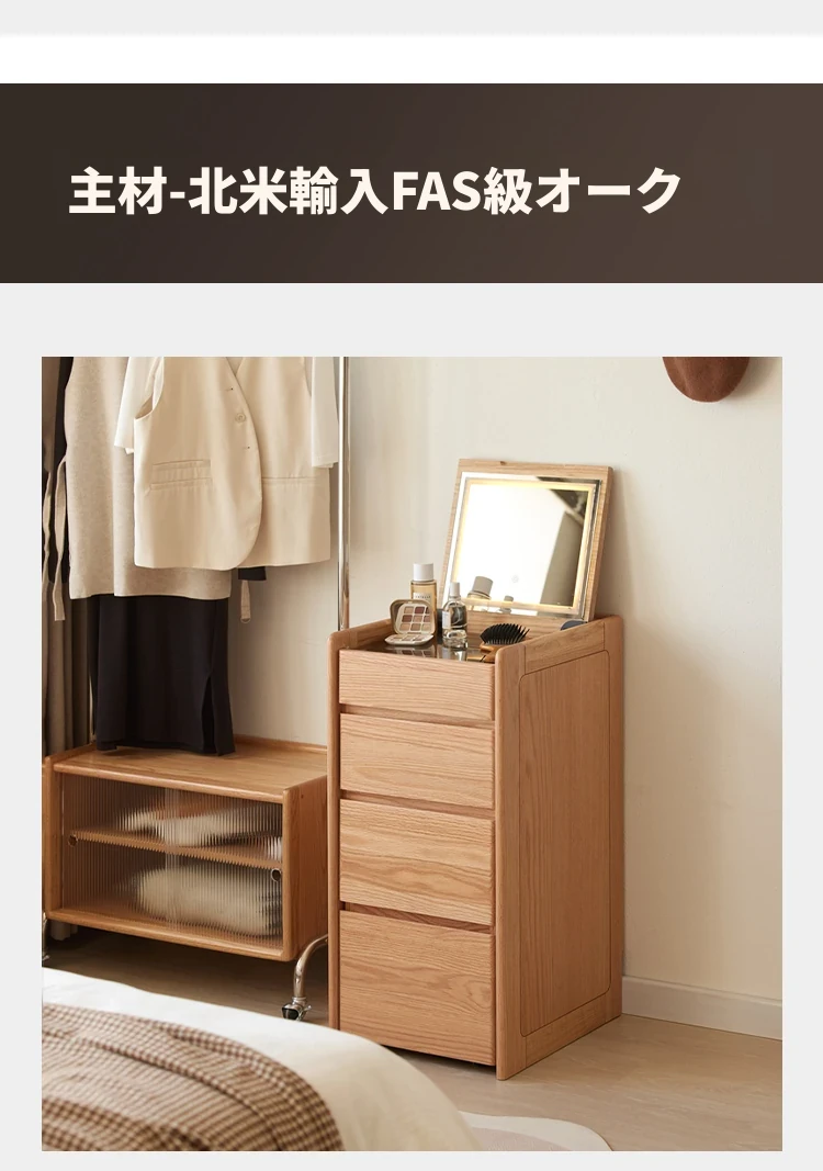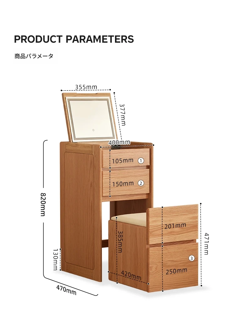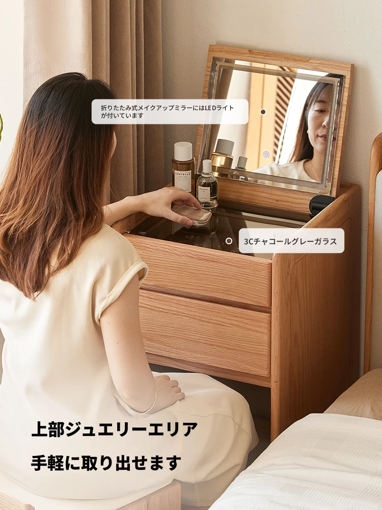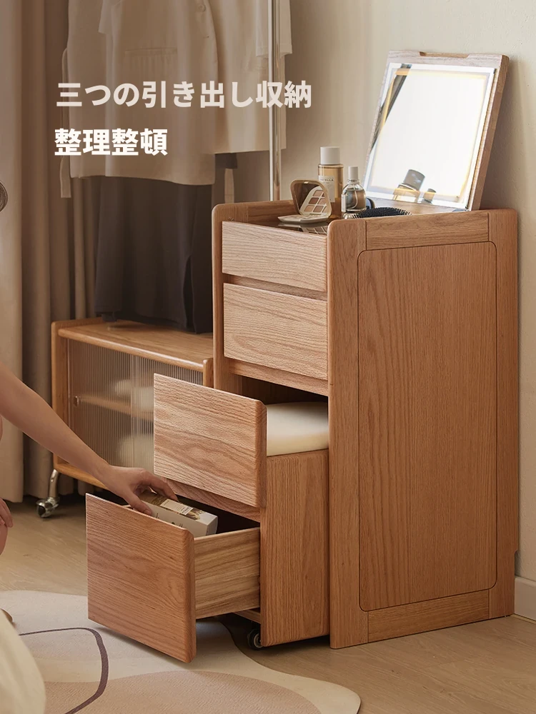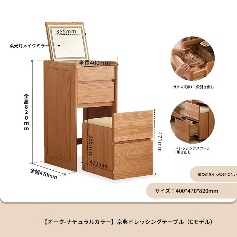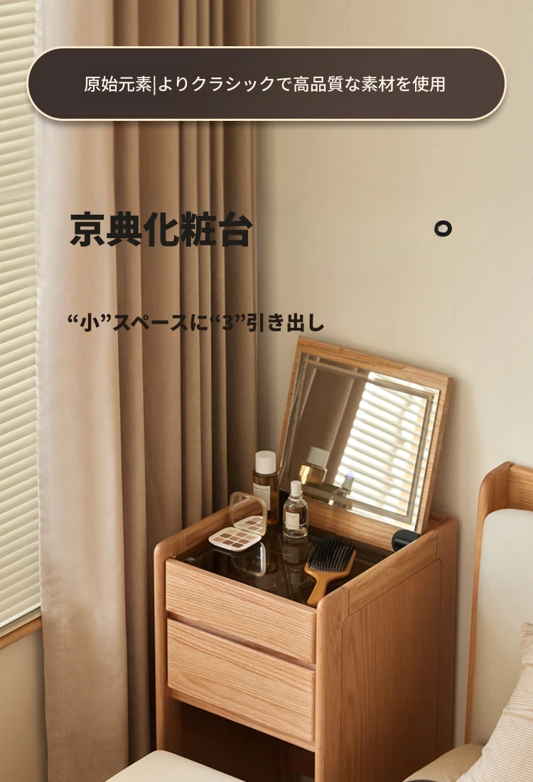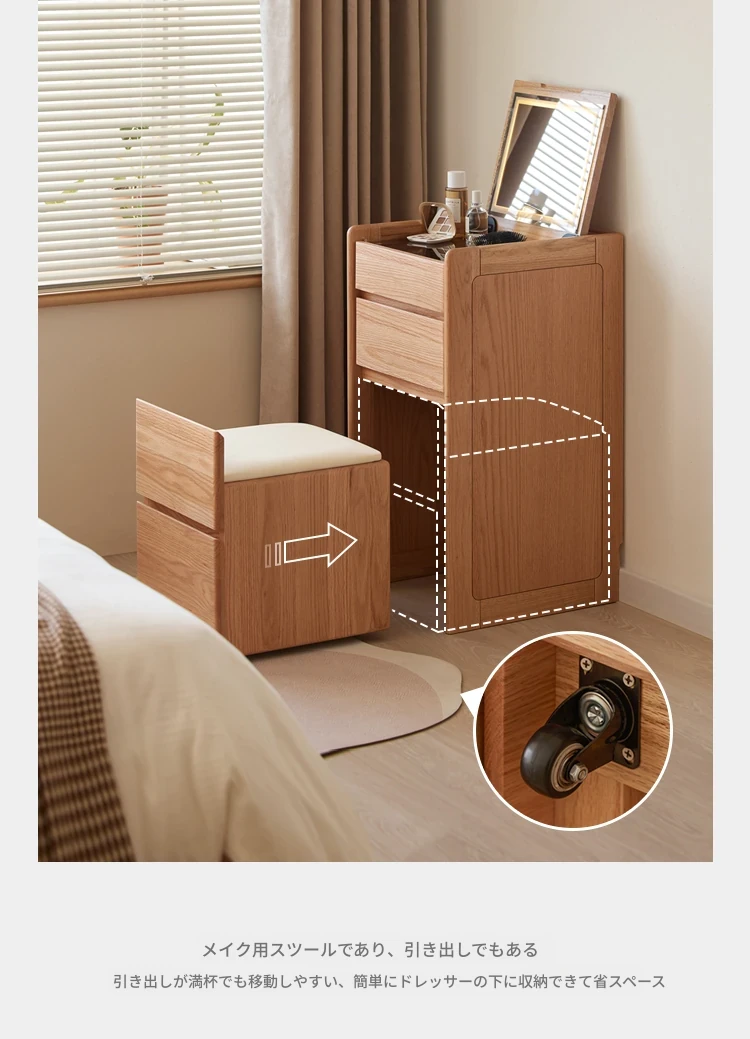 オーク材の極狭デザイン!一体型の実木ドレッサー&スツールセット。おしゃれで機能的な寝室用コスメテーブル、小スペースにぴったりのベッドサイド化粧台。あなたのメイクアップタイムを特別に演出!