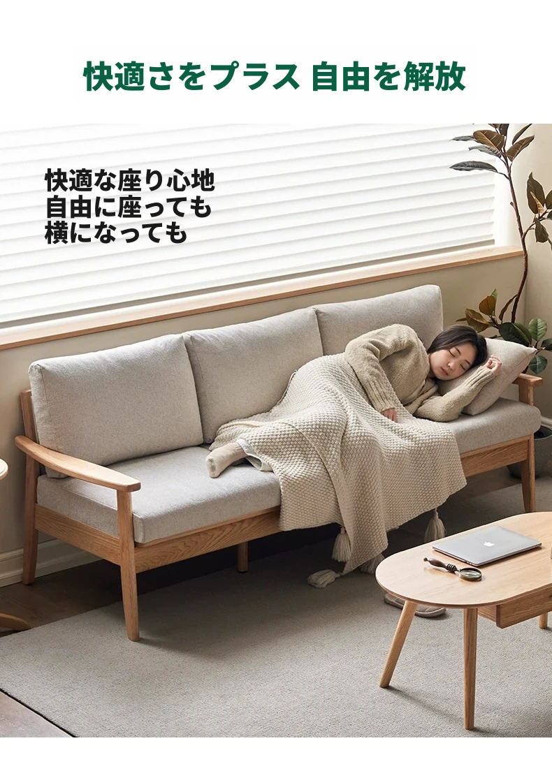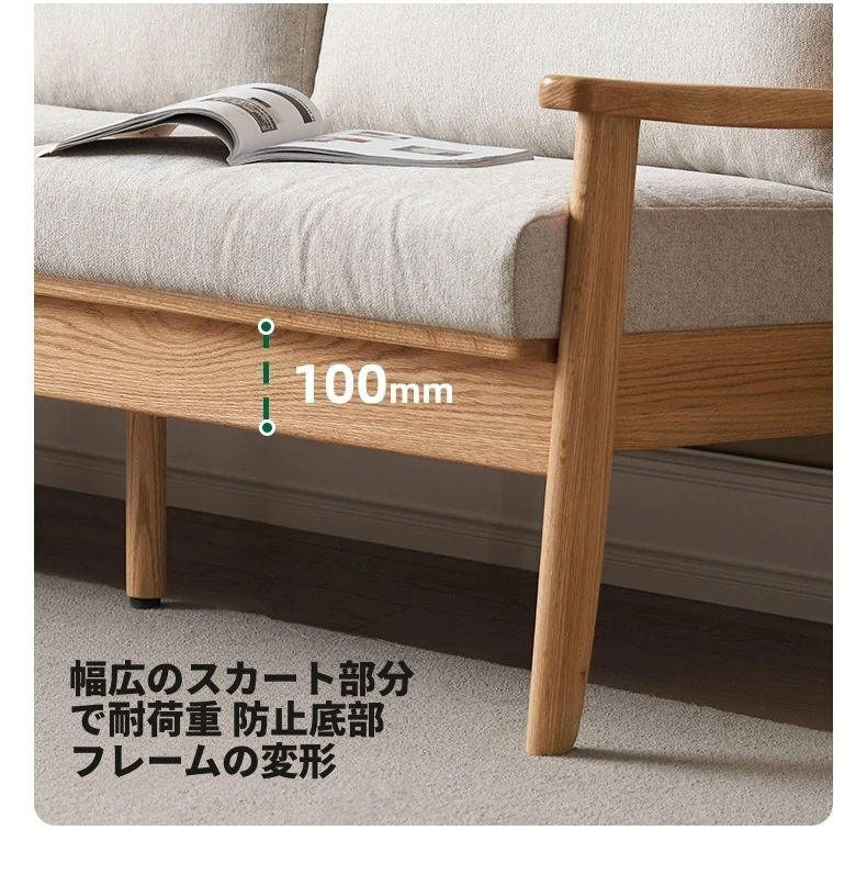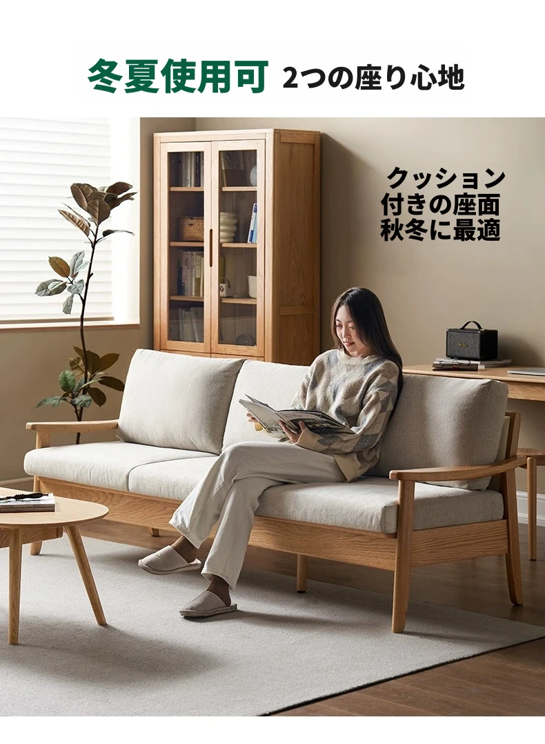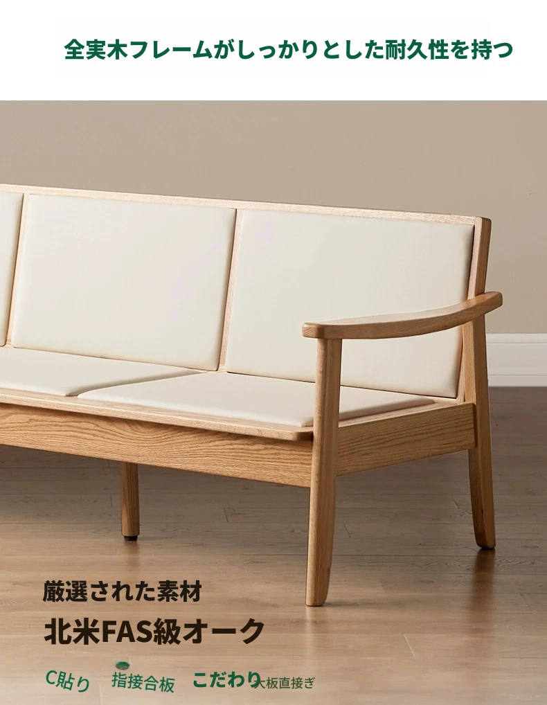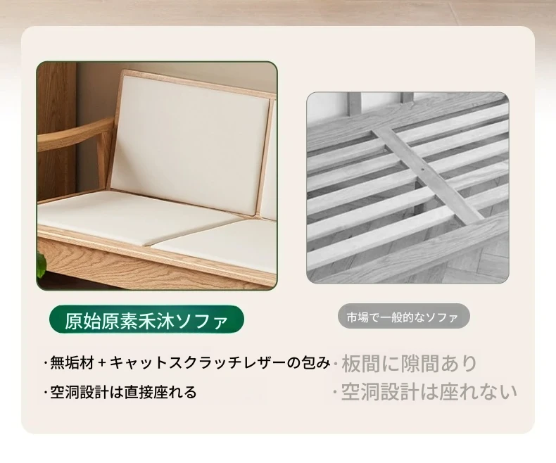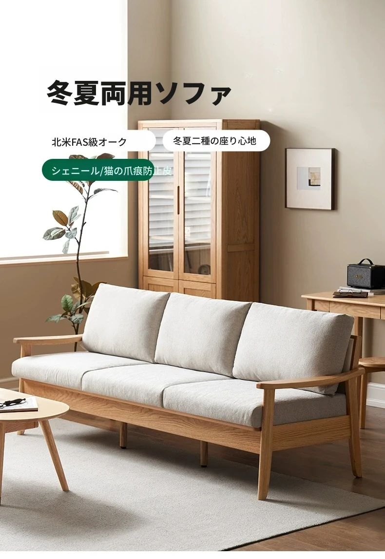 全原木の素朴な3人掛けソファ - オーク材使用!小型リビングに最適。冬も夏も快適に過ごせる、猫の爪も気にならない耐久性抜群のデザインで、あなたの空間をおしゃれに彩ります。