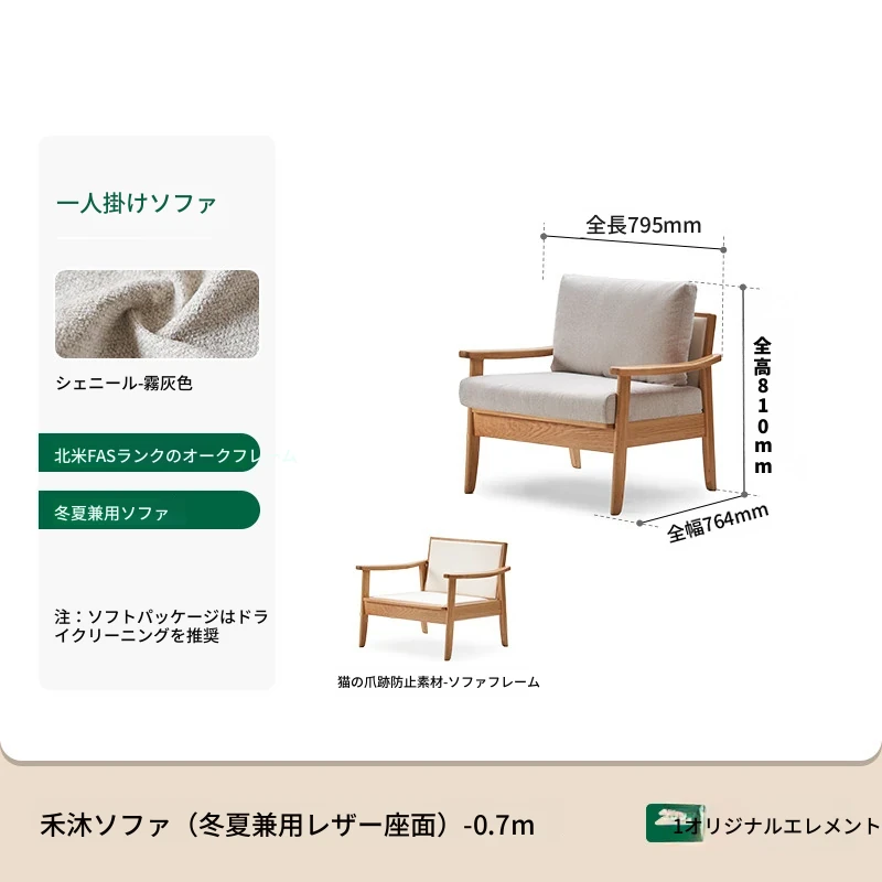 【オーク-ナチュラルカラー】0.79メートル1人掛けソファ(シェニール-霧灰色)(795*764*810mm)
