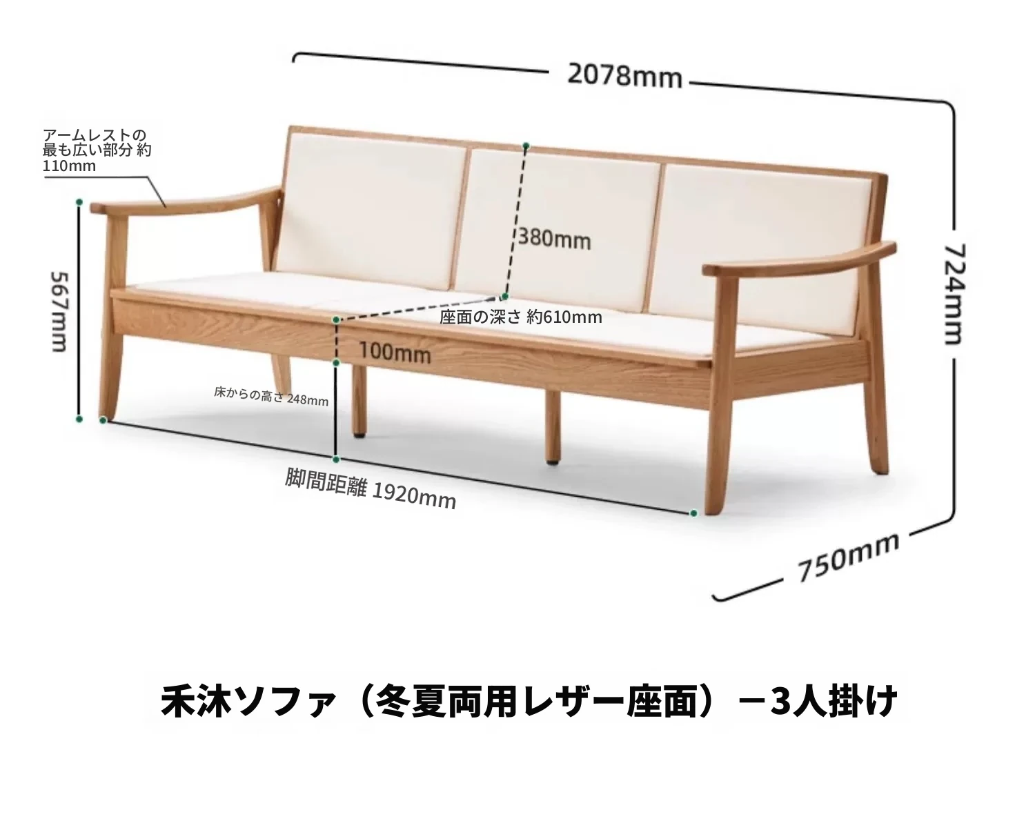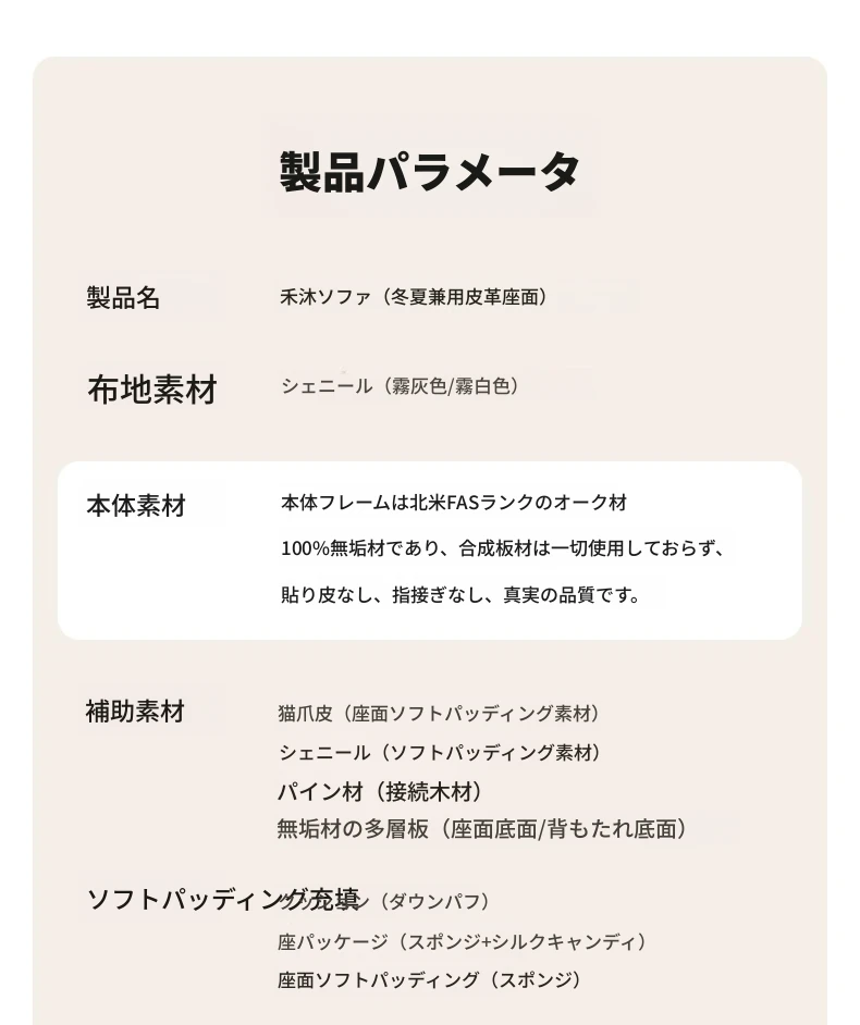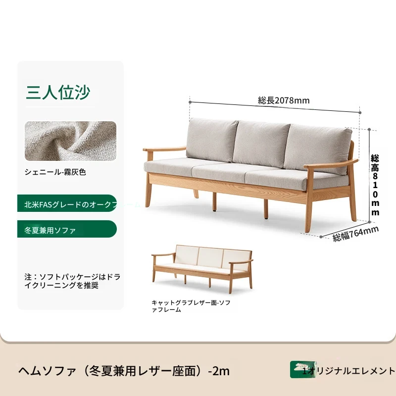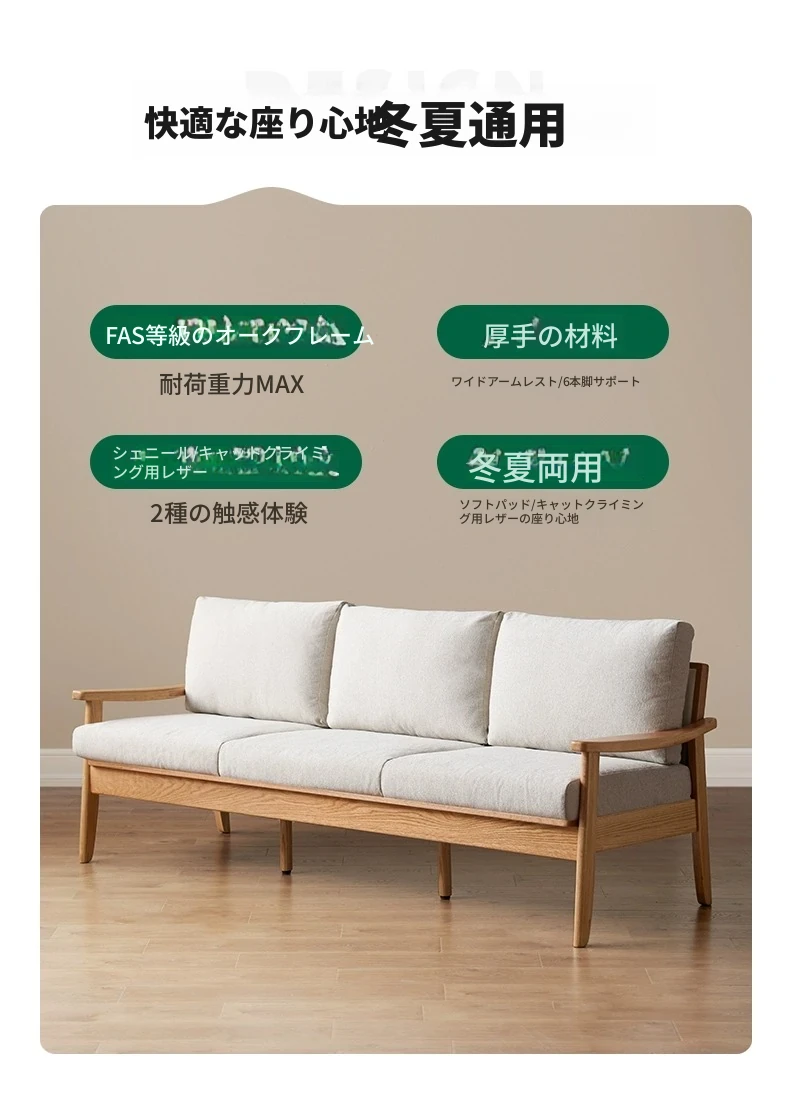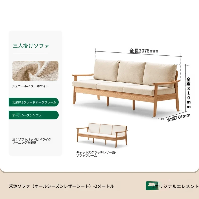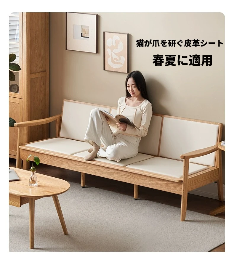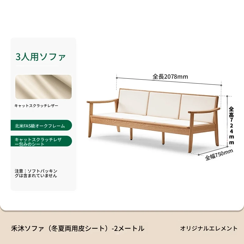 【オーク-ナチュラルカラー】2.07メートル3人掛けソファ(キャットスクラッチレザー-白月)(2078*750*724mm)
