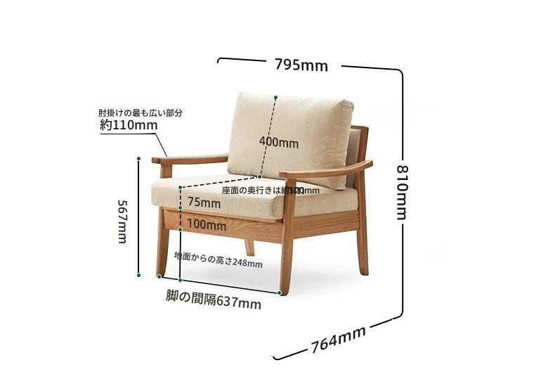 【オーク-ナチュラルカラー】0.79メートル1人掛けソファ(シェニール-霧白色)(795*764*810mm)