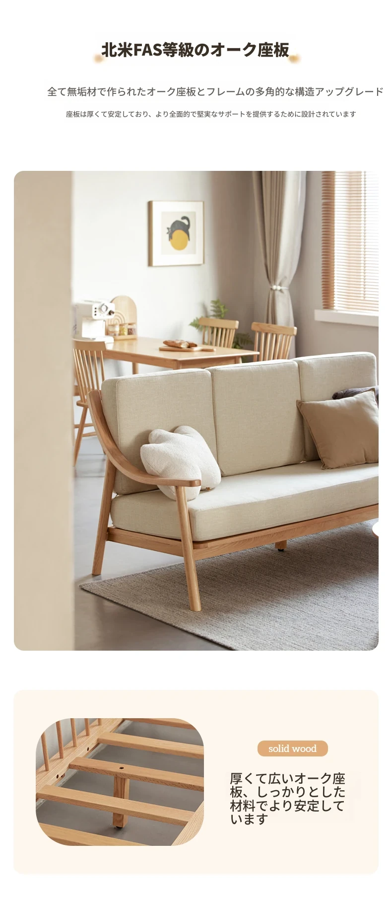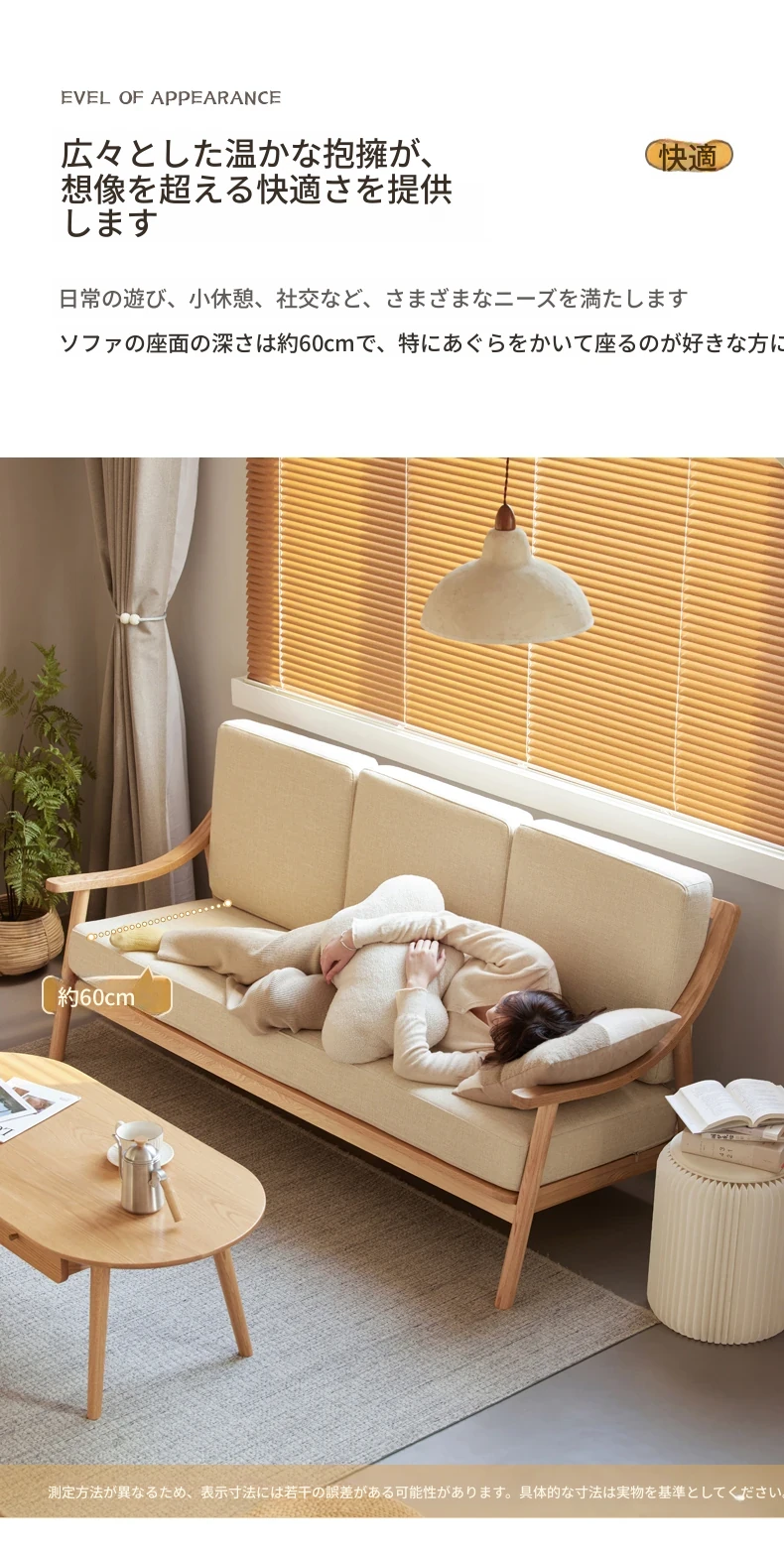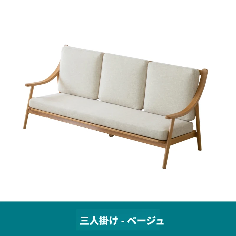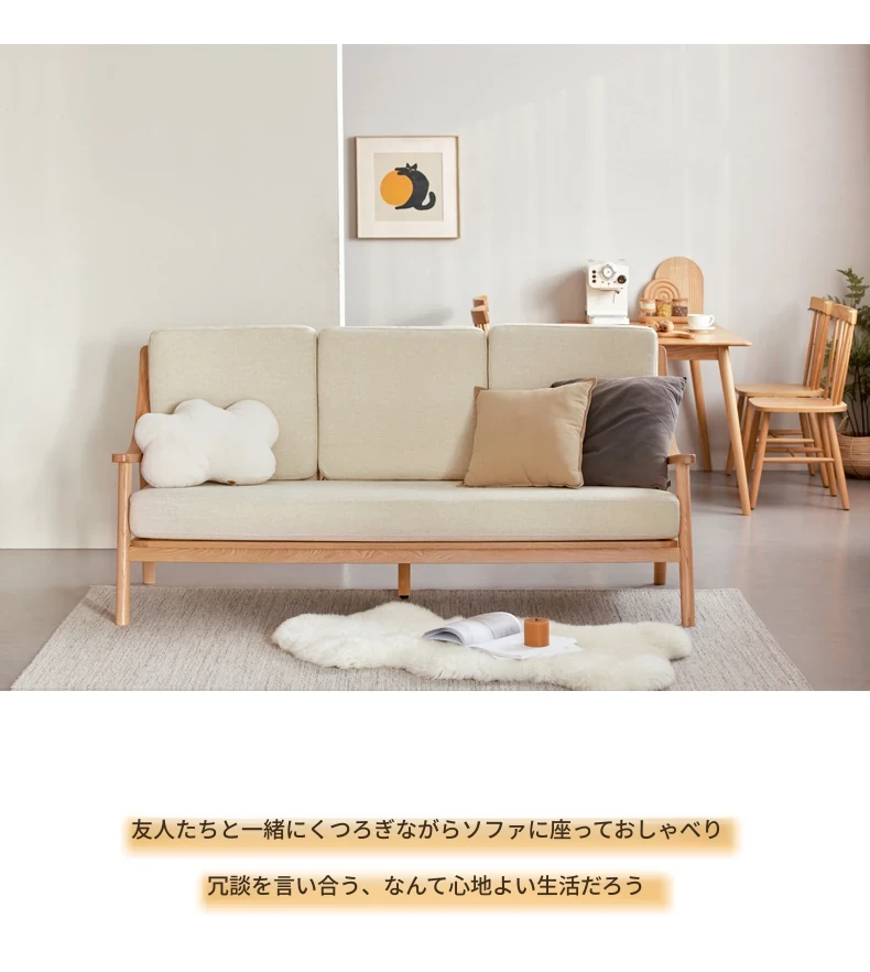 原材料の天然木を使用した北欧風・和風の3人掛けソファ - シンプルでスタイリッシュなデザイン、リラックスできる小さなお部屋にぴったり!居心地の良いリビング家具で、毎日のくつろぎタイムをお楽しみください。