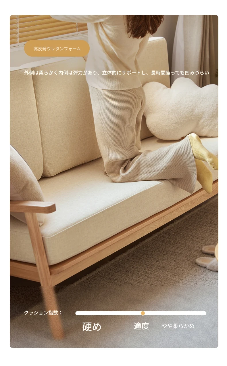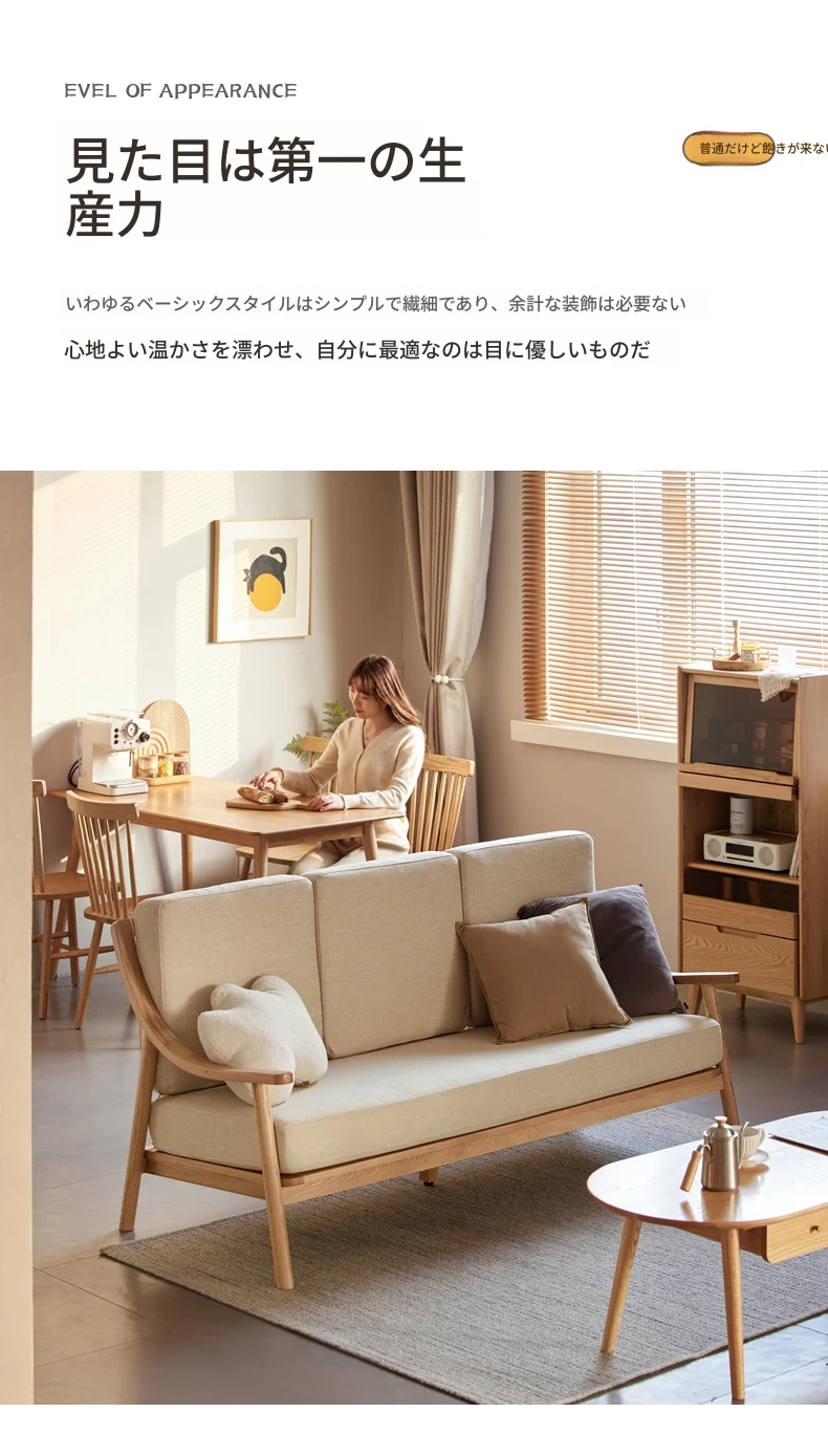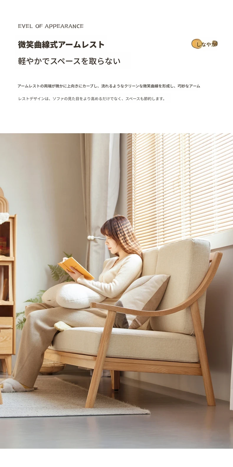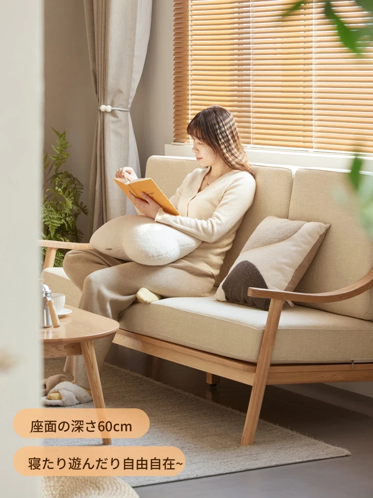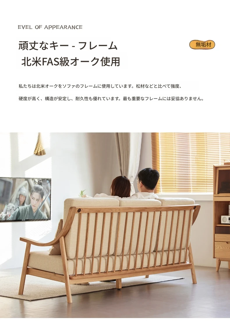 原材料の天然木を使用した北欧風・和風の3人掛けソファ - シンプルでスタイリッシュなデザイン、リラックスできる小さなお部屋にぴったり!居心地の良いリビング家具で、毎日のくつろぎタイムをお楽しみください。