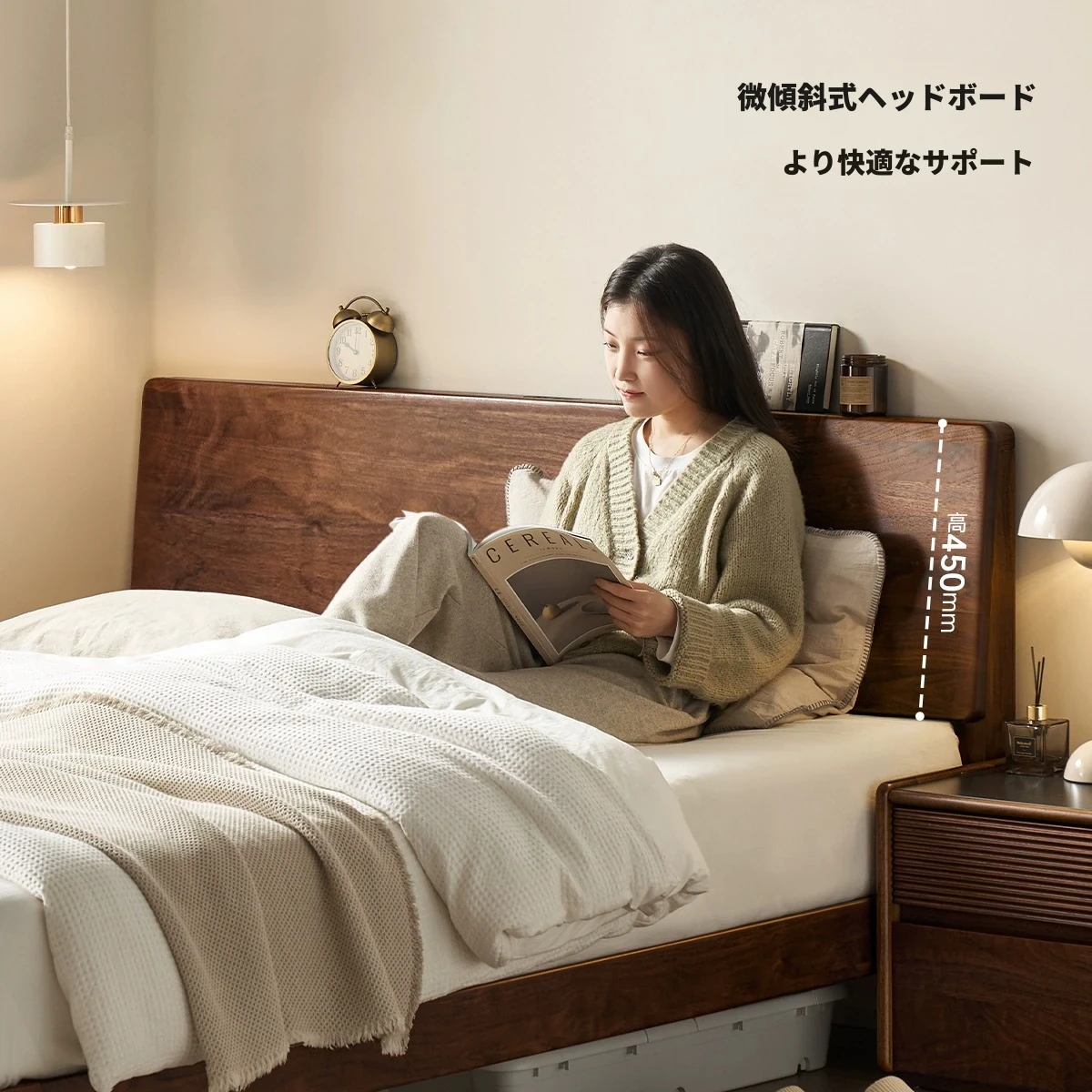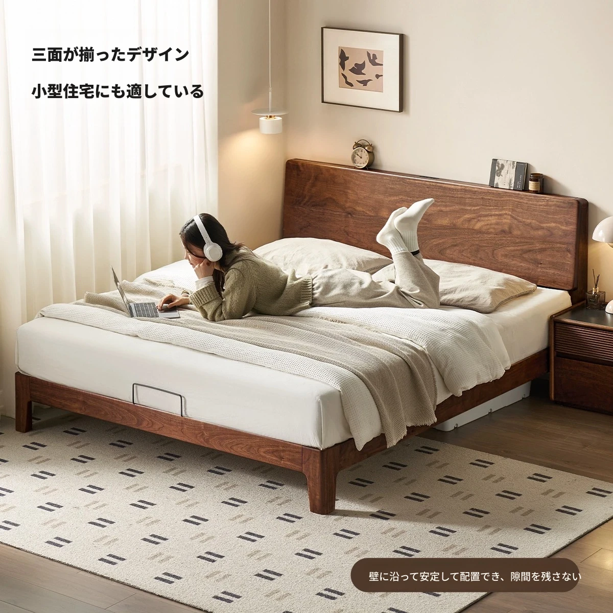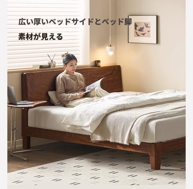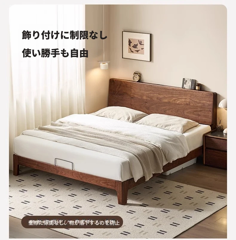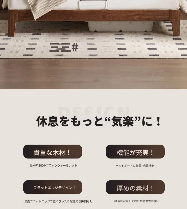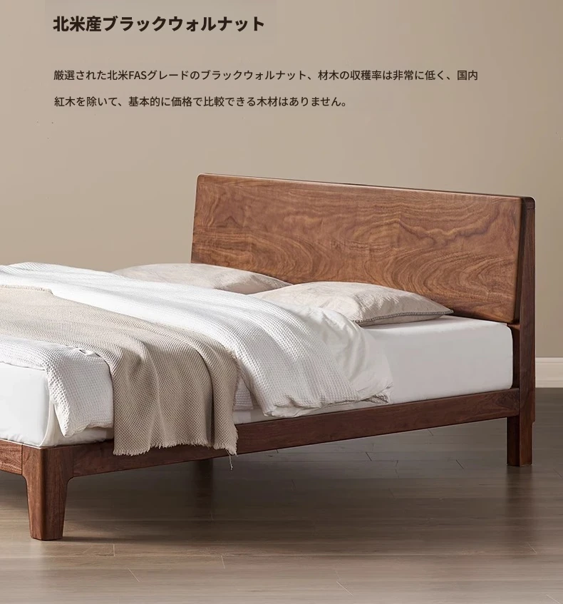 オーガニック無垢材使用!現代的な北米産ウォールナットの1.8mダブルベッド。小型住居にもぴったりなデザインで、主寝室をスタイリッシュに演出します。フラットエッジ仕様で安心感もバッチリ!