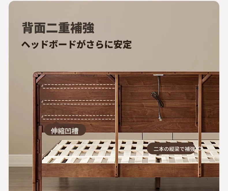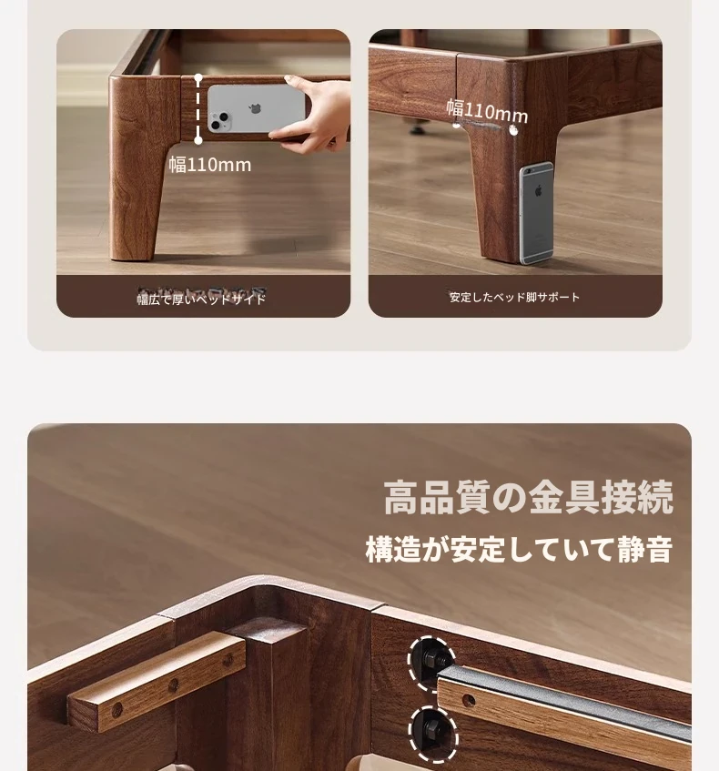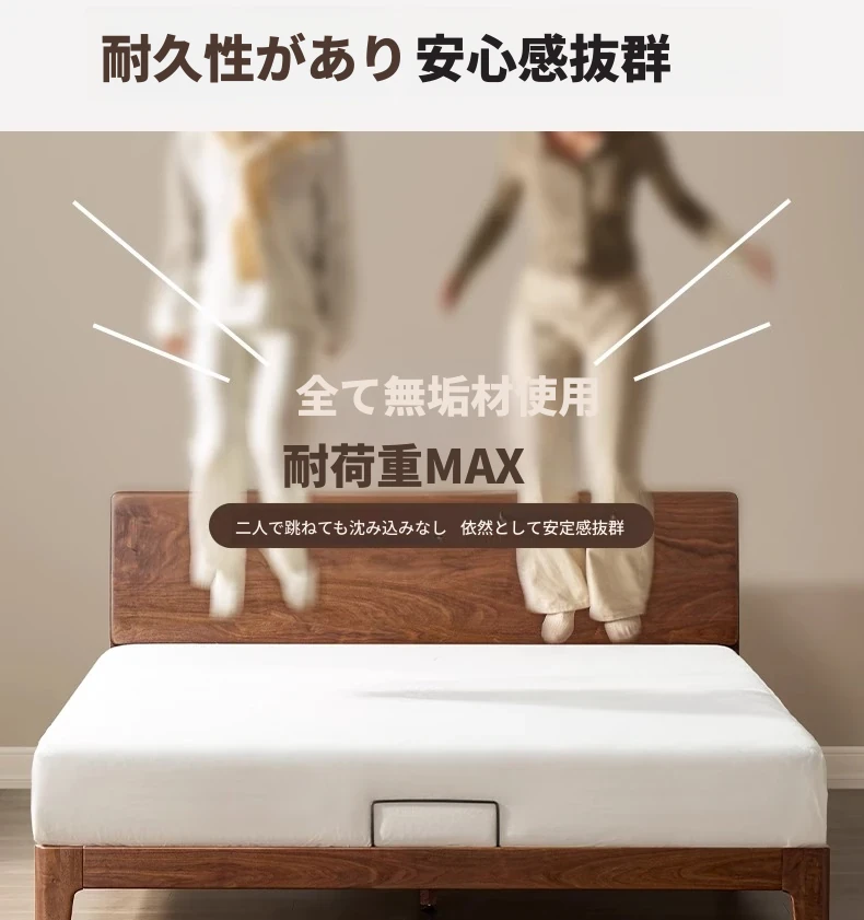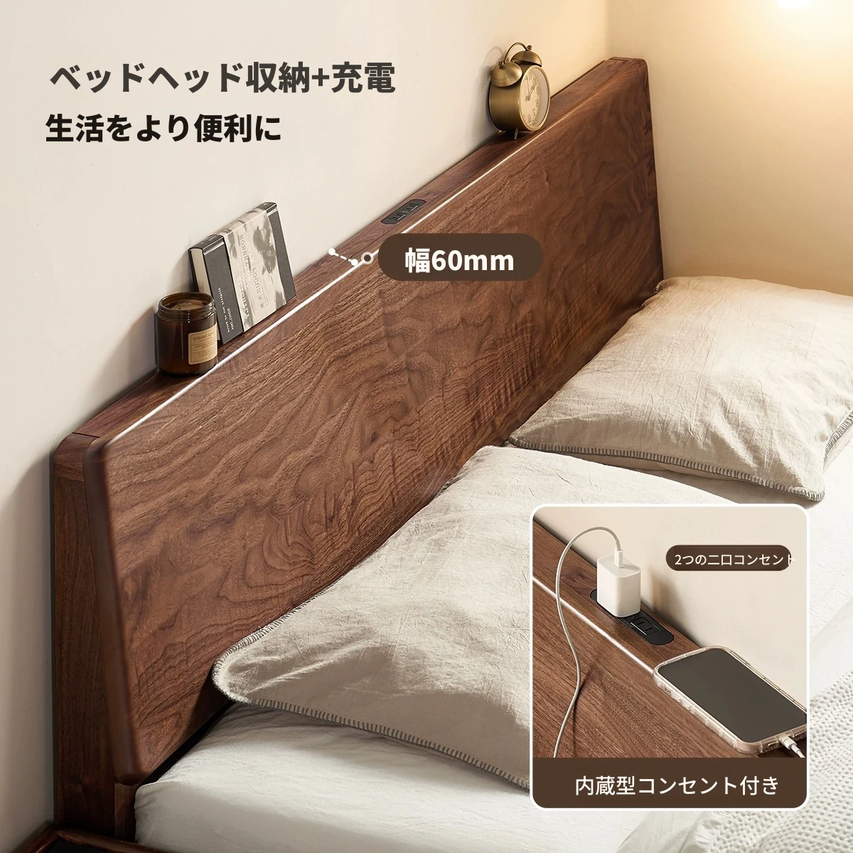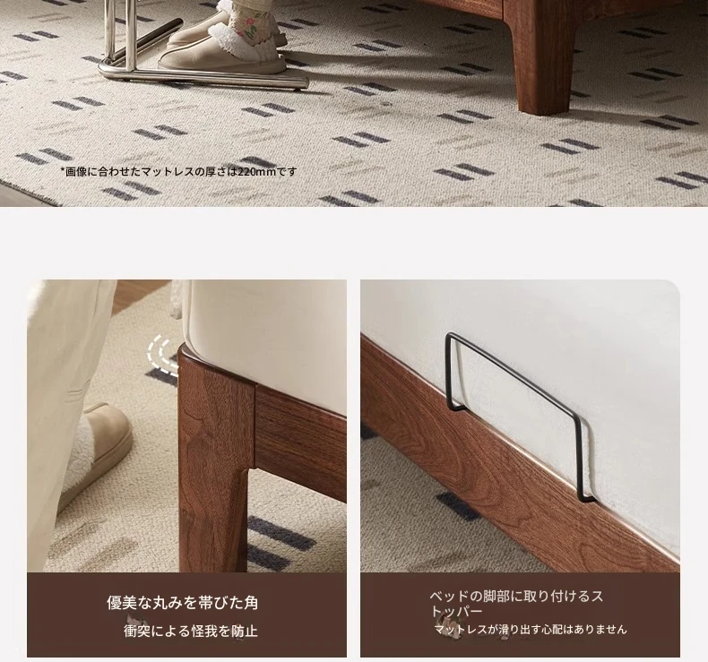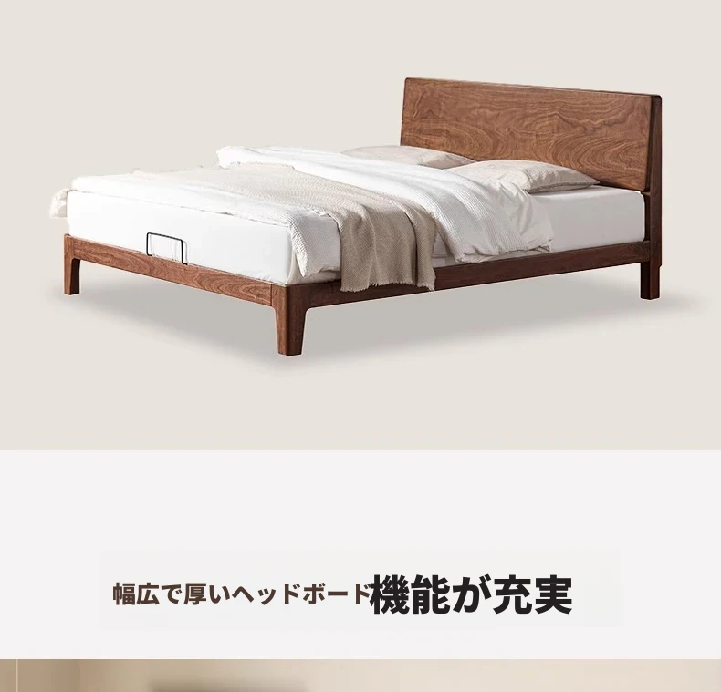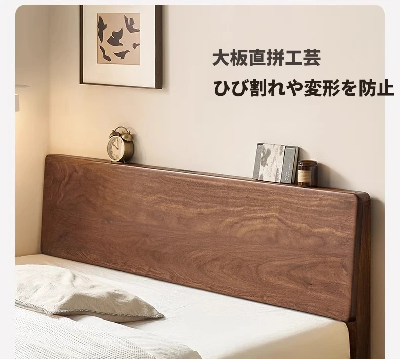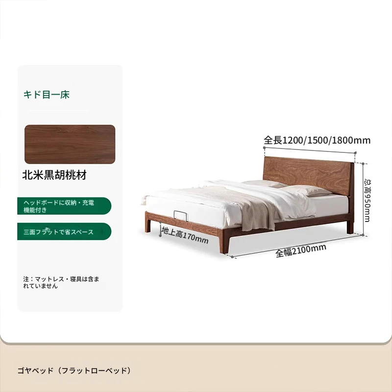 オーガニック無垢材使用!現代的な北米産ウォールナットの1.8mダブルベッド。小型住居にもぴったりなデザインで、主寝室をスタイリッシュに演出します。フラットエッジ仕様で安心感もバッチリ!