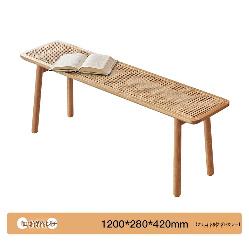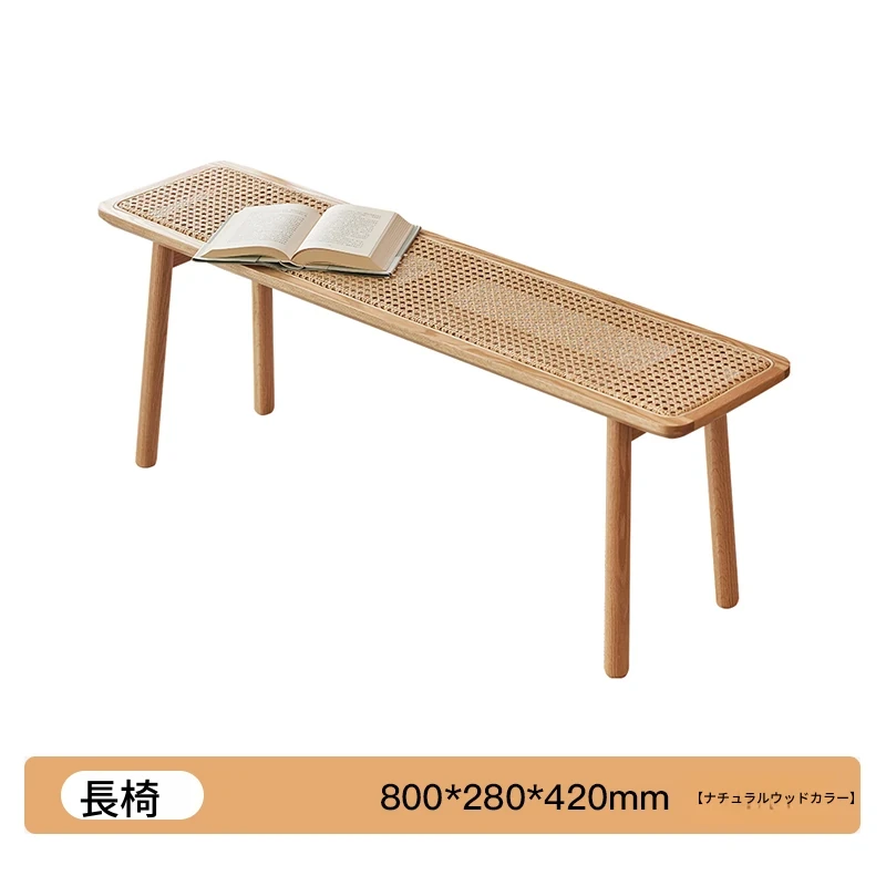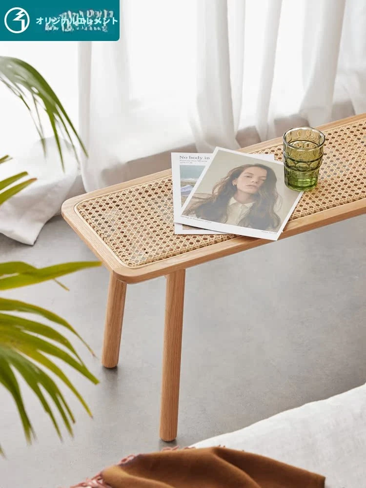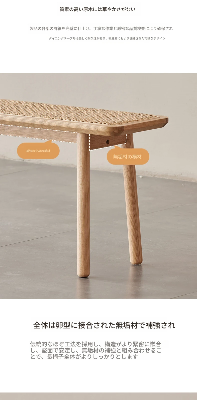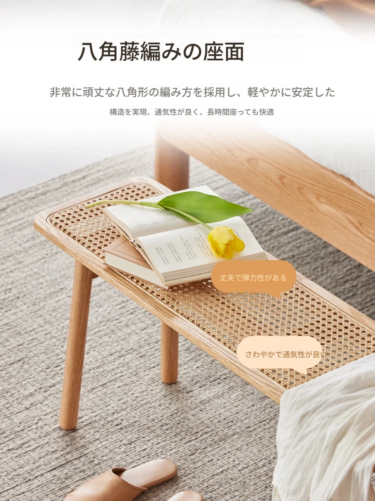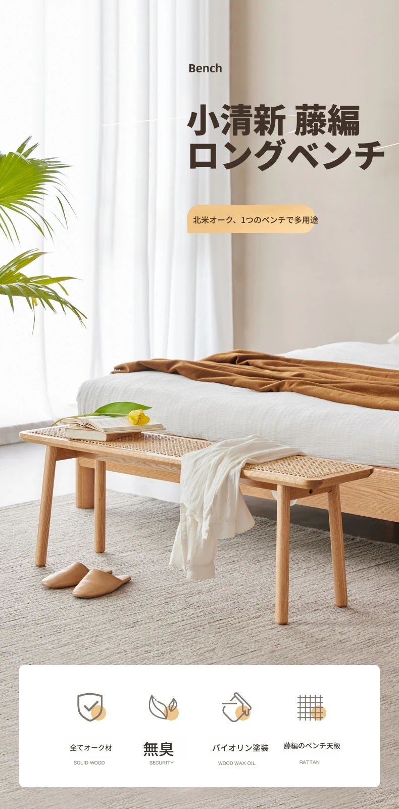 原木の魅力を引き出す!全実木製ロングベンチ - 小さな部屋にも最適なベッドサイドベンチ、オーク材使用の和風デザイン、ラタン編みスタイルでおしゃれな空間を演出。