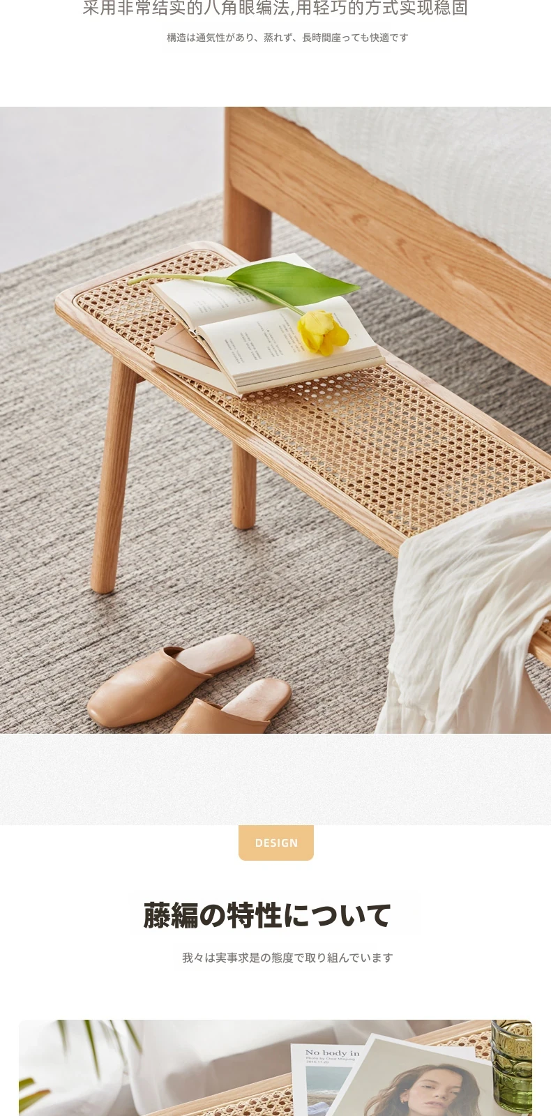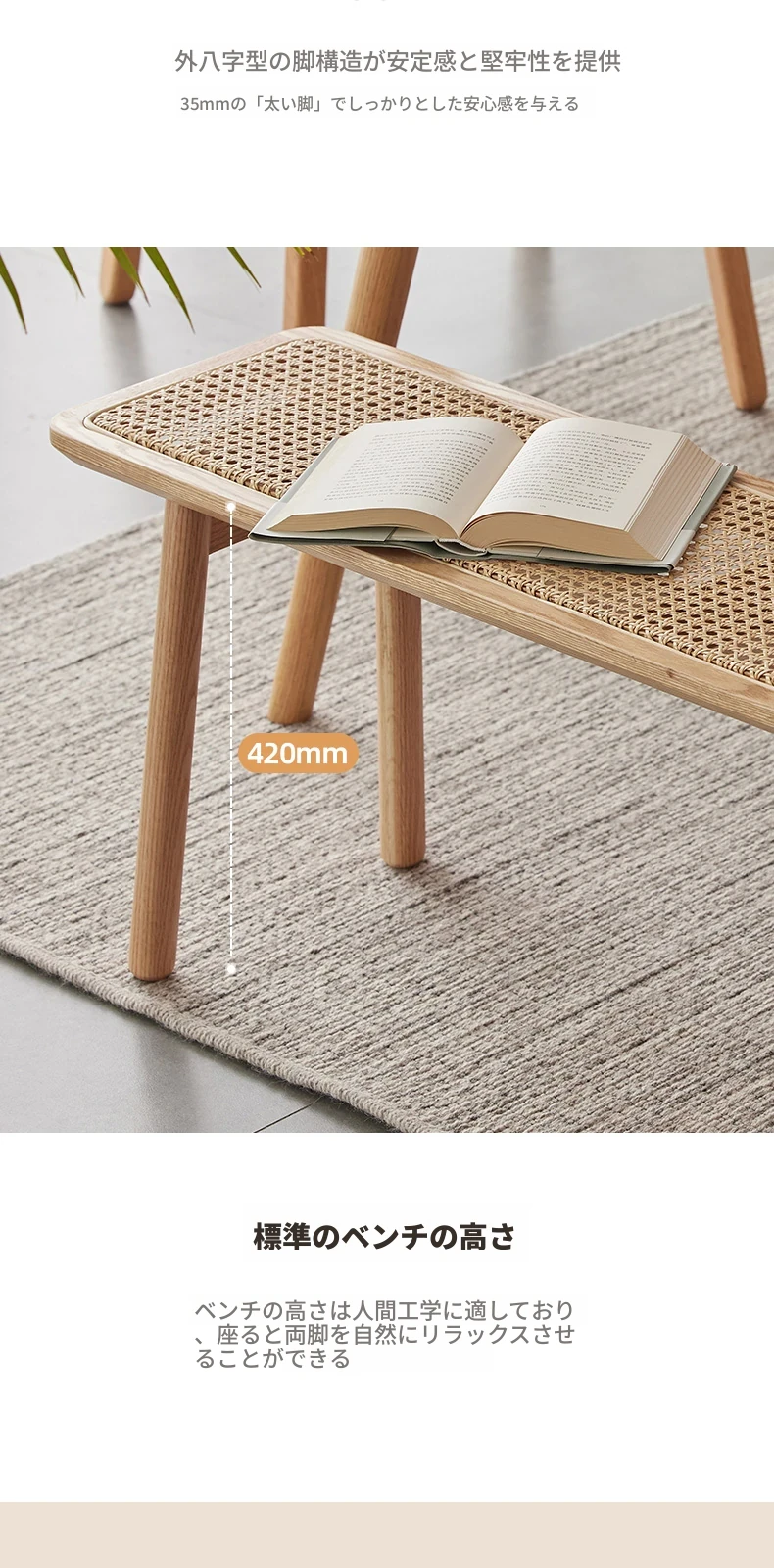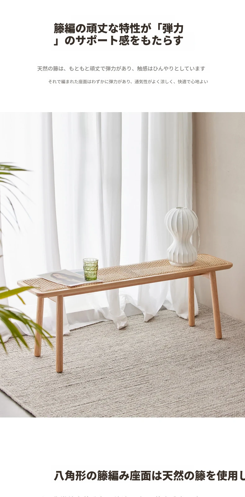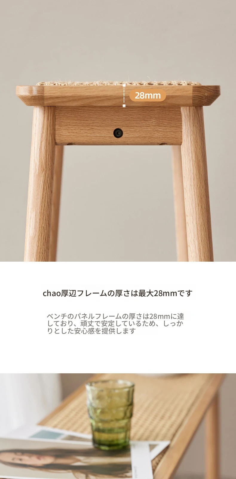 原木の魅力を引き出す!全実木製ロングベンチ - 小さな部屋にも最適なベッドサイドベンチ、オーク材使用の和風デザイン、ラタン編みスタイルでおしゃれな空間を演出。