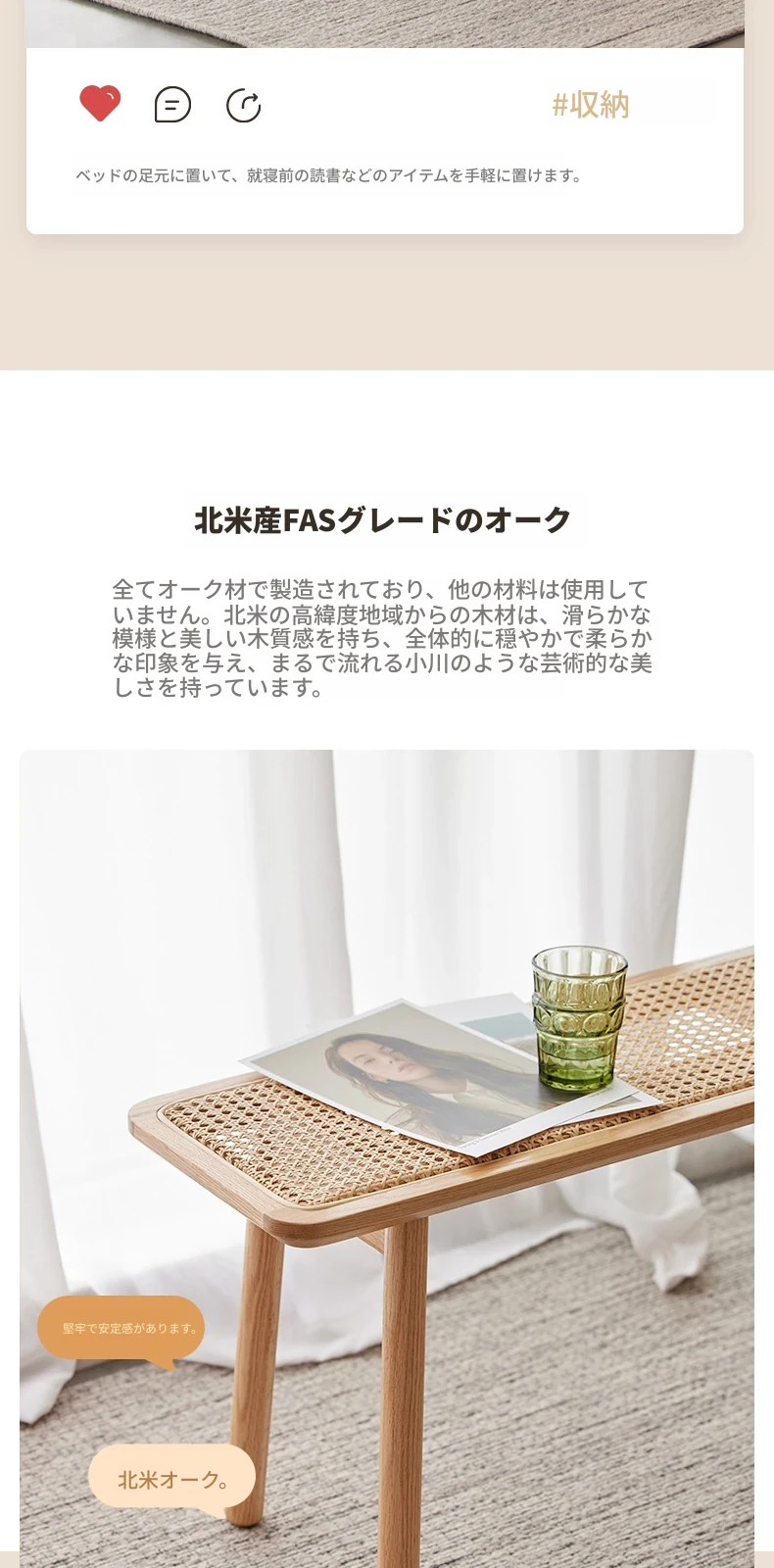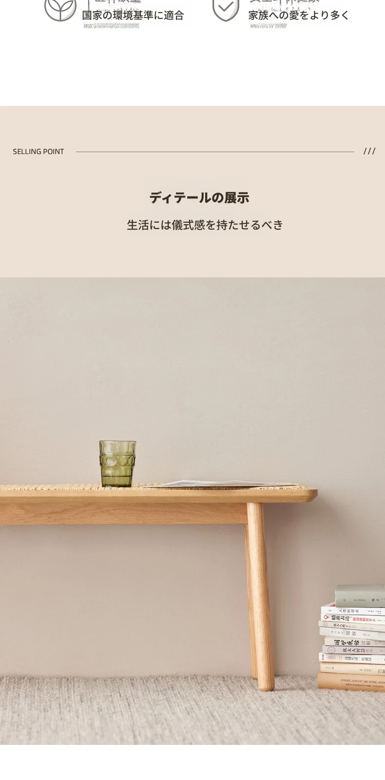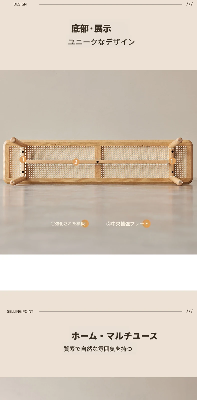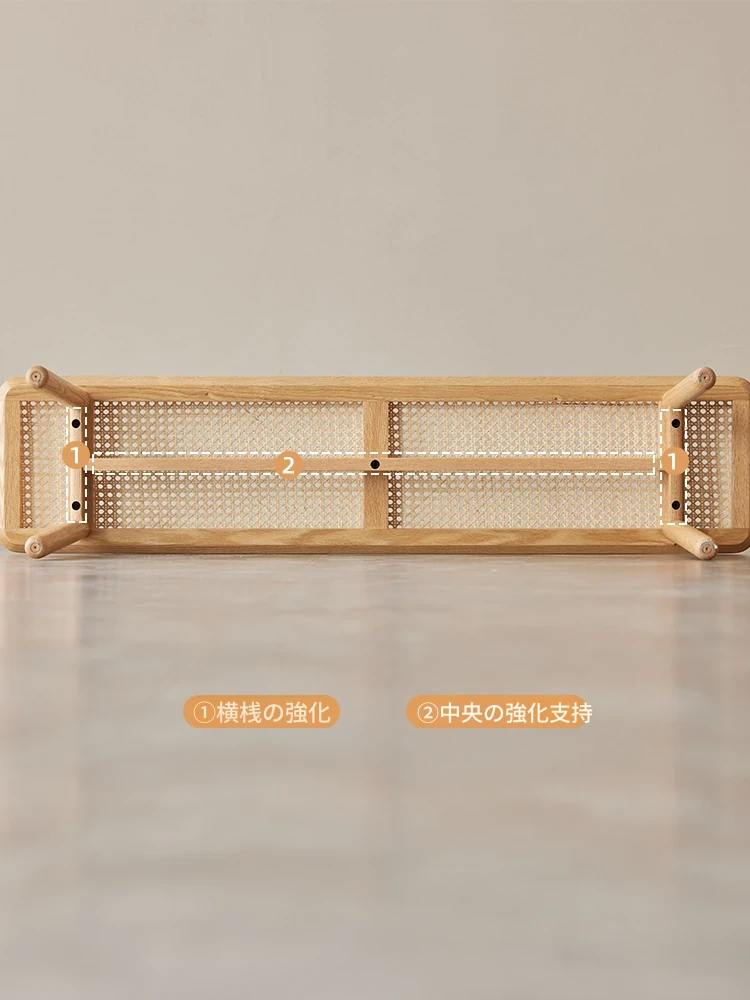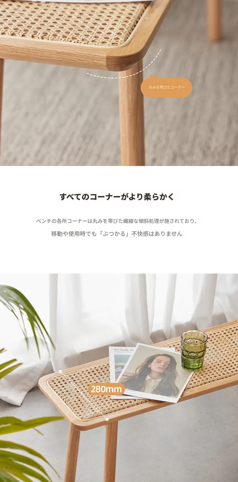 原木の魅力を引き出す!全実木製ロングベンチ - 小さな部屋にも最適なベッドサイドベンチ、オーク材使用の和風デザイン、ラタン編みスタイルでおしゃれな空間を演出。