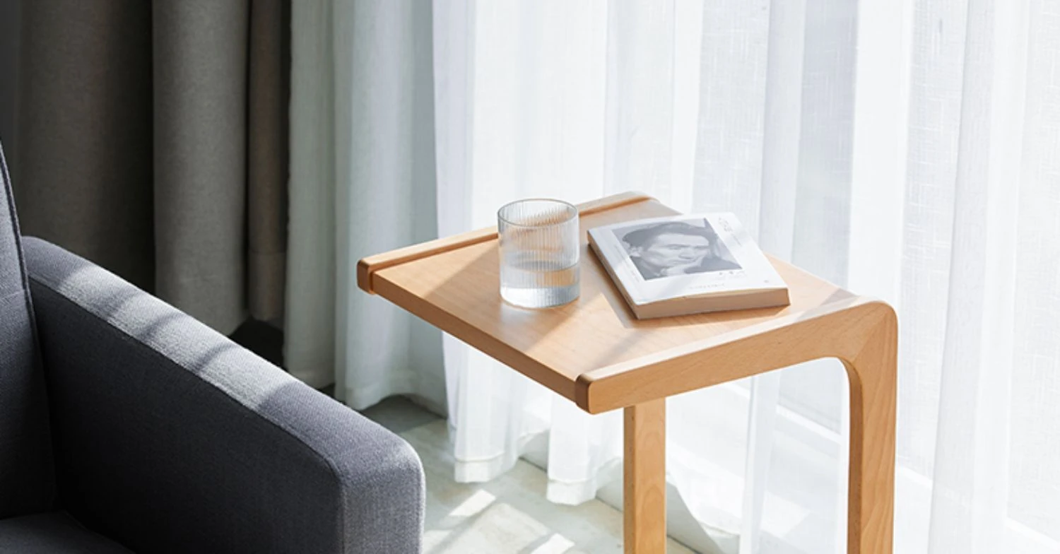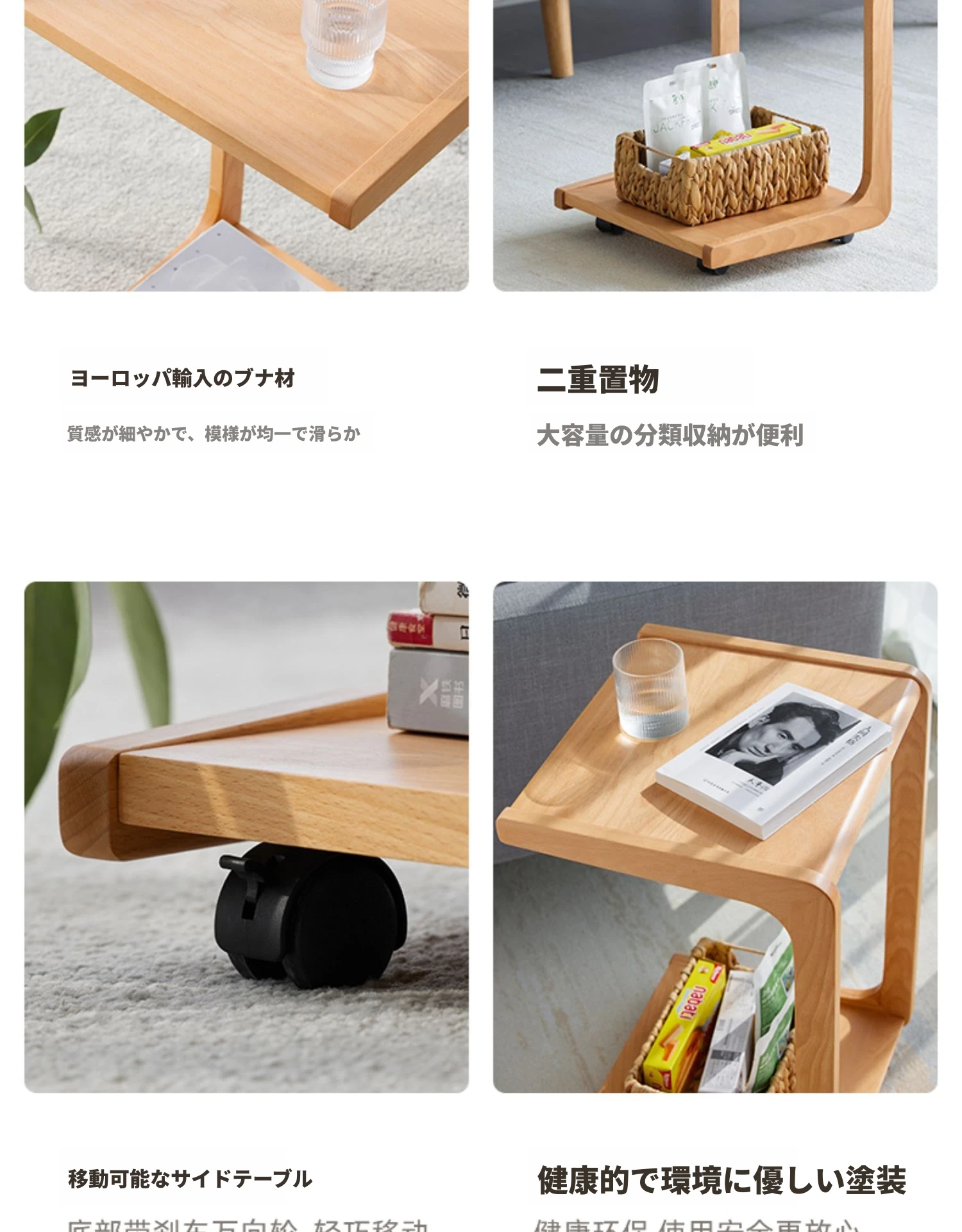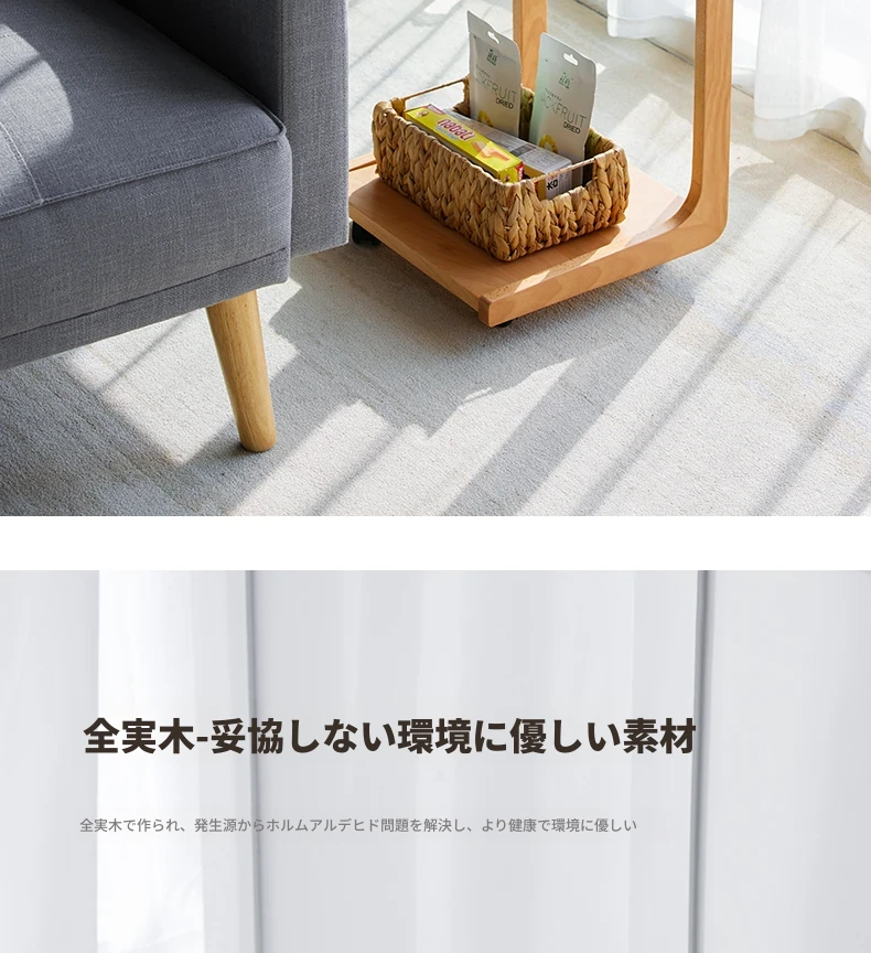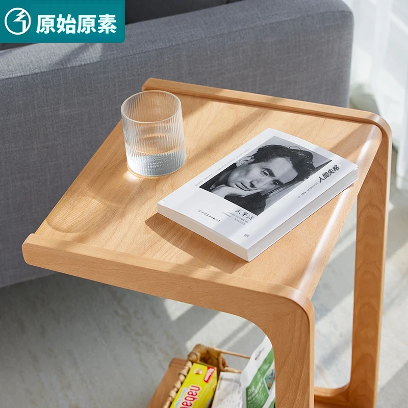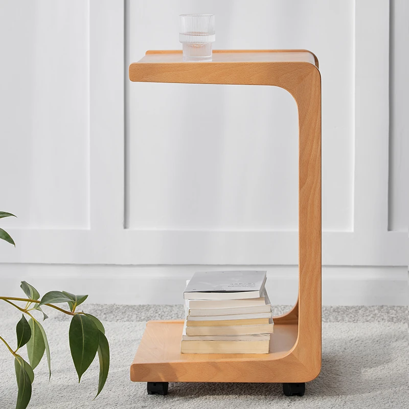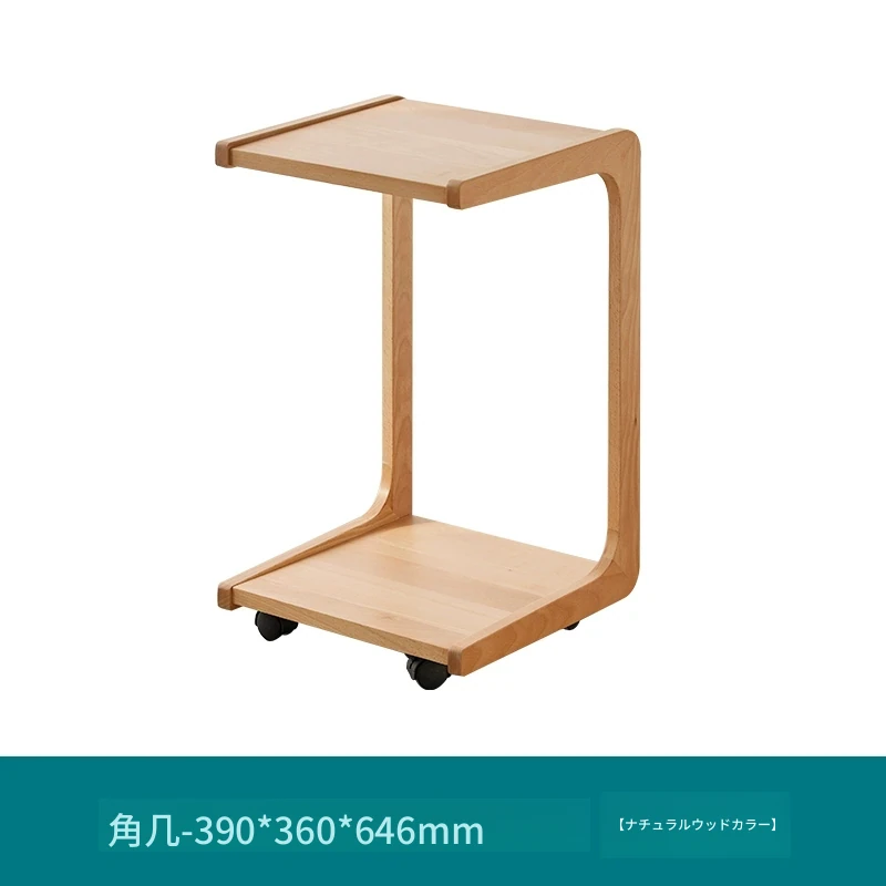 原始原素無垢材利用の北欧スタイル・シンプルなソファサイドテーブル - ビーチウッド製・C型テーブル、キャスター付きで移動便利!ベッドサイドで使いやすい。