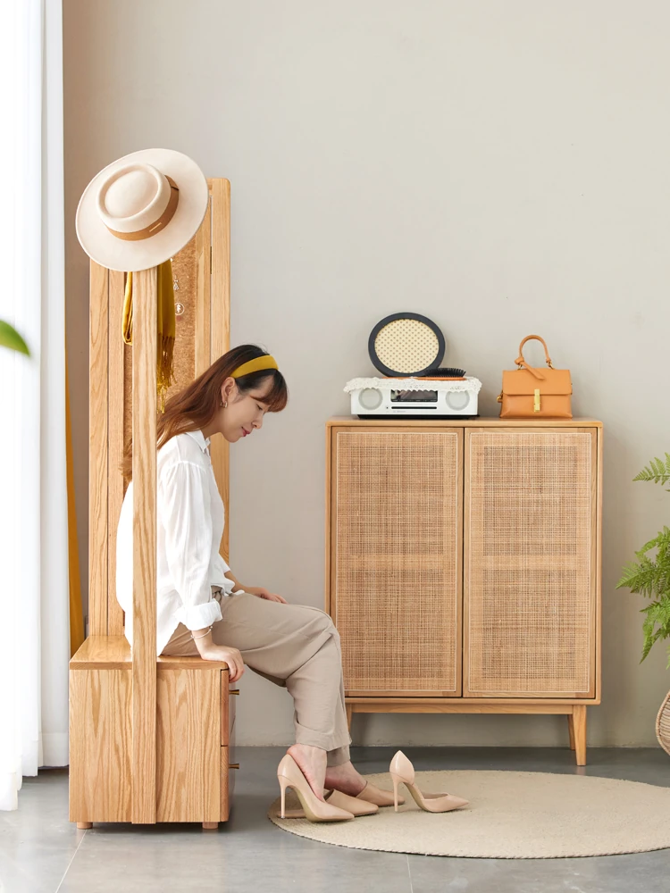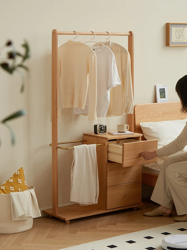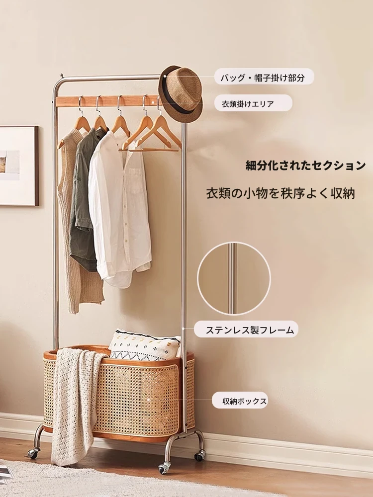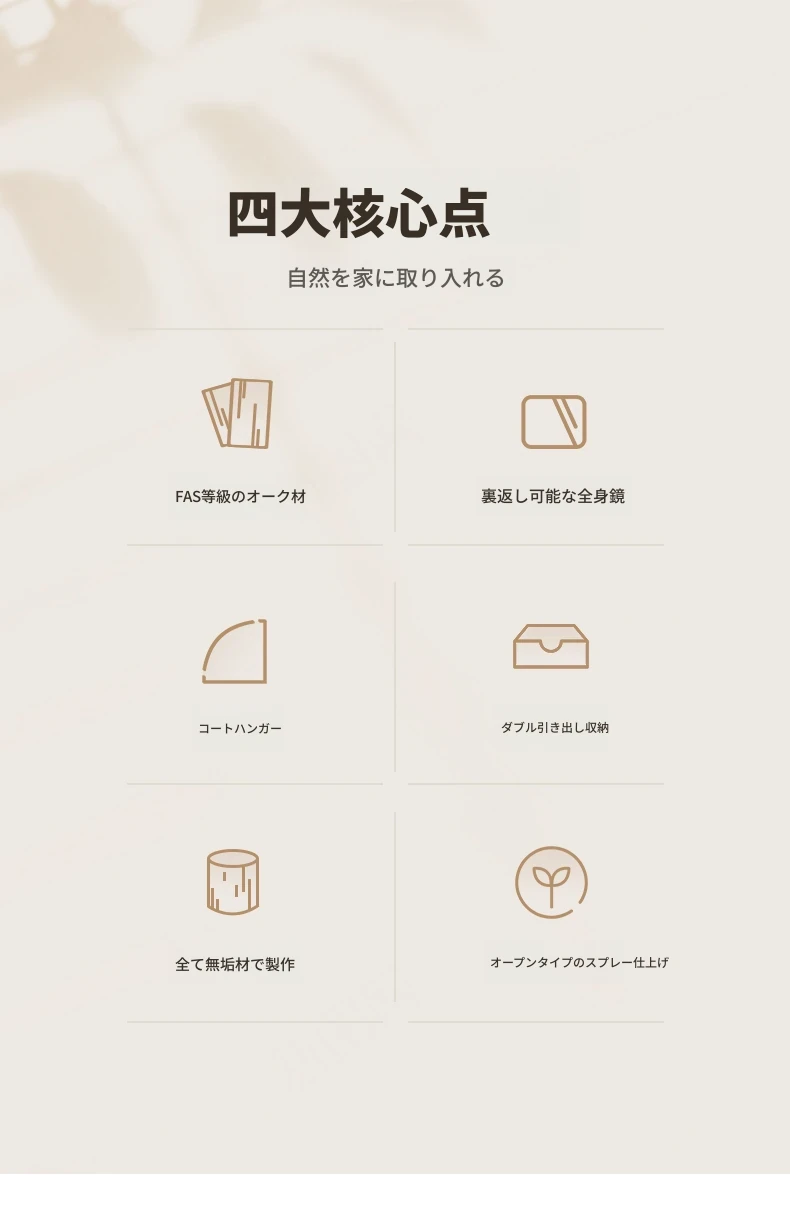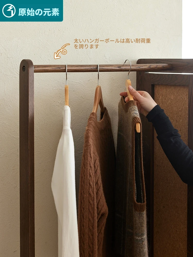原木素材の全木製コートハンガー - 北欧風シンプルデザイン、コンパクトサイズ!居間や寝室にぴったりなスタンド式衣類ハンガーと鏡の一体型。おしゃれで機能的な収納で、あなたの部屋をもっと素敵に演出します!